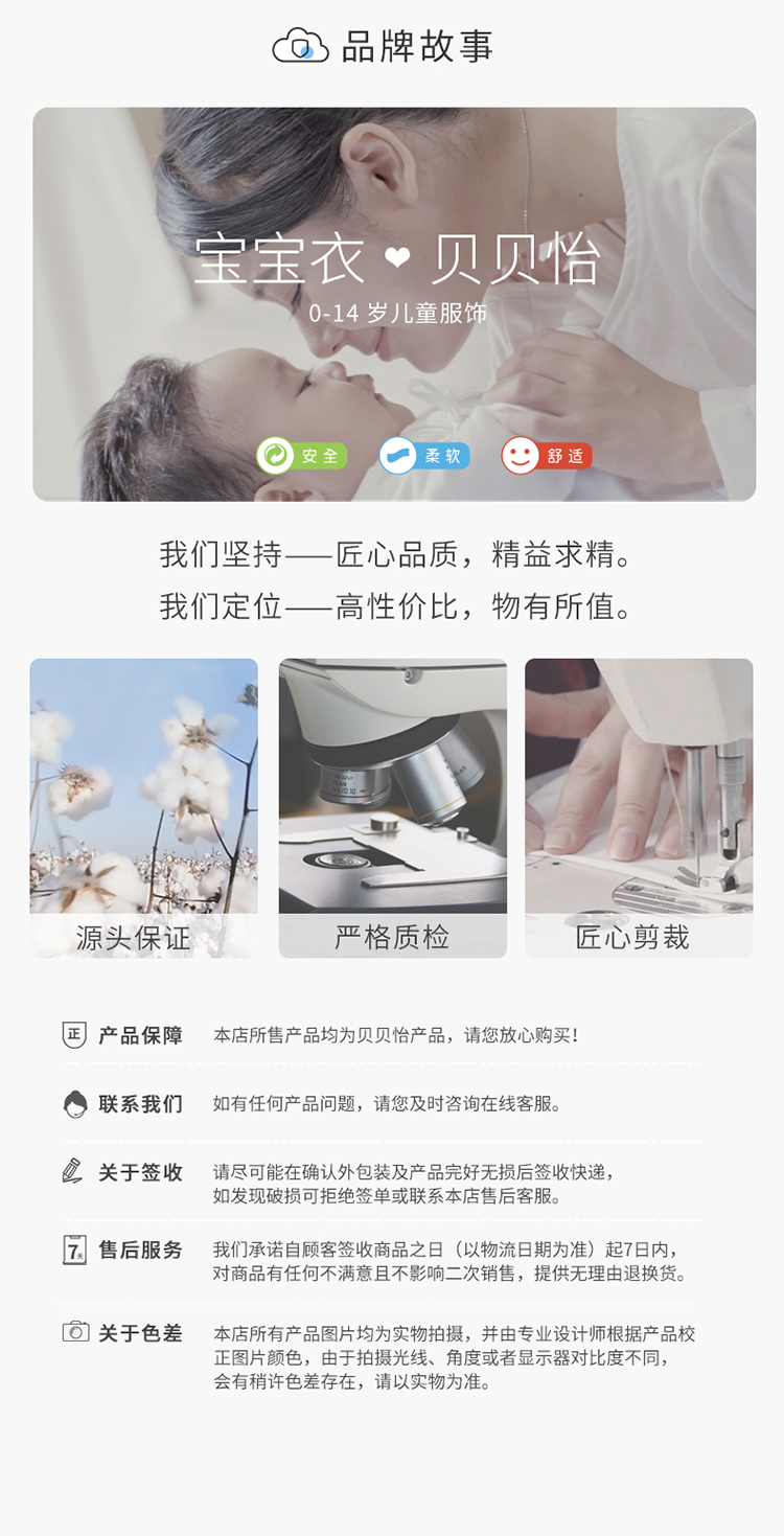 - 贝贝怡专注0-6岁婴幼儿服饰,坚持安全、柔软、舒适的产品理念,为千万中国家庭提供超高品质、安全可靠的婴幼儿服饰产品,妈妈放心,宝宝开心!
