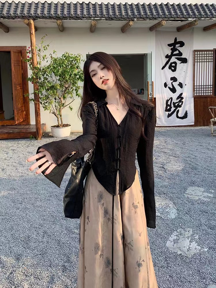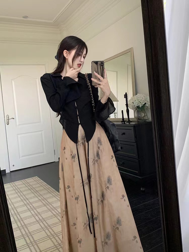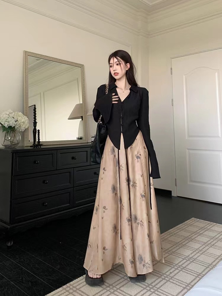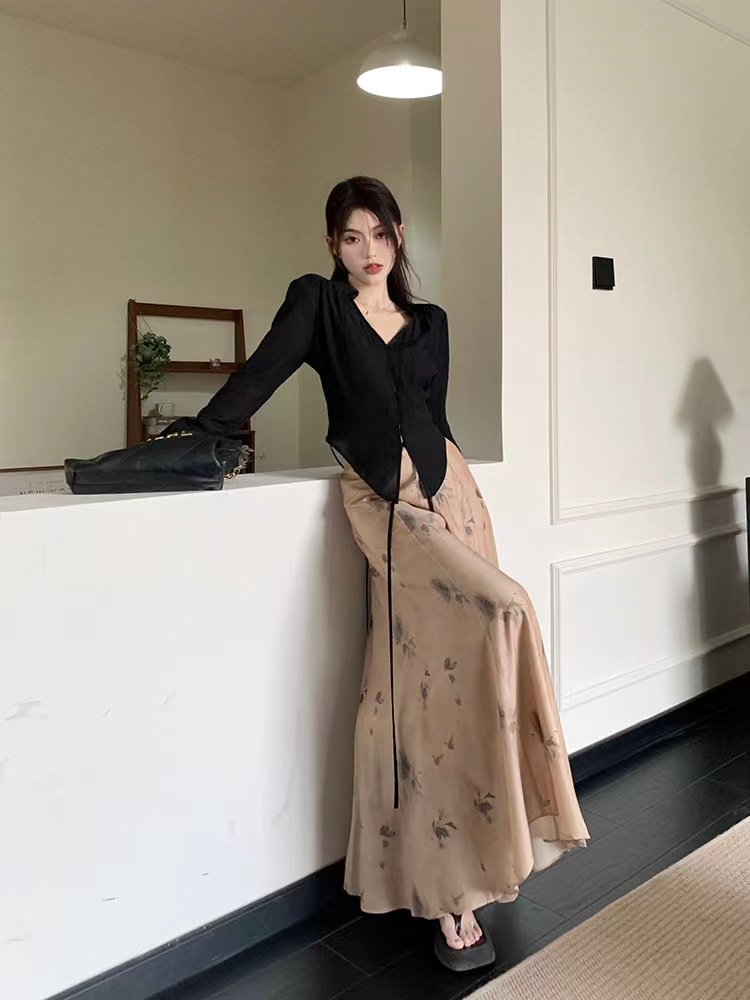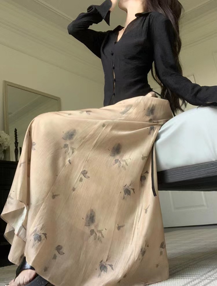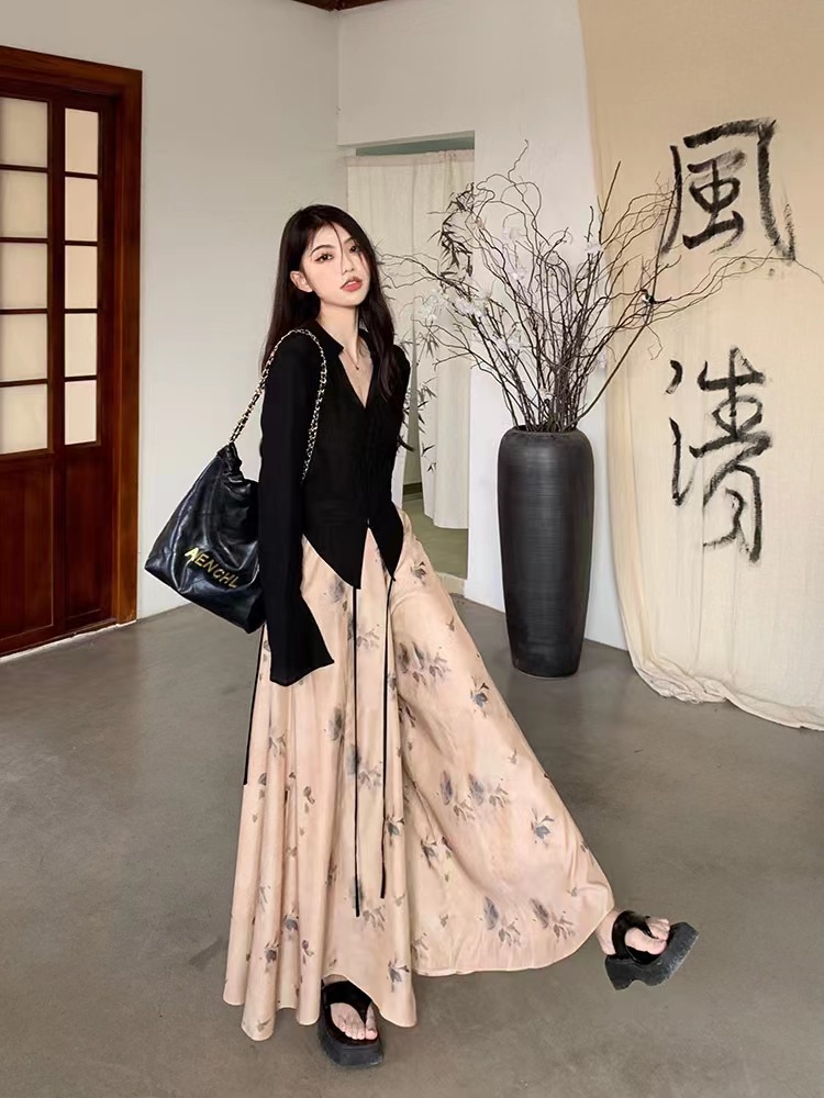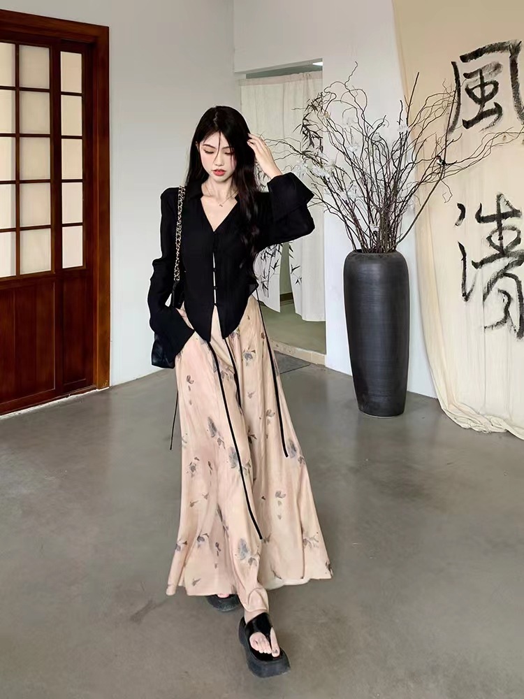 夏季新款水墨风高腰长款裤裙清冷禅意氛围感碎花半身裙显瘦百搭_HLY