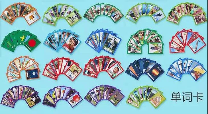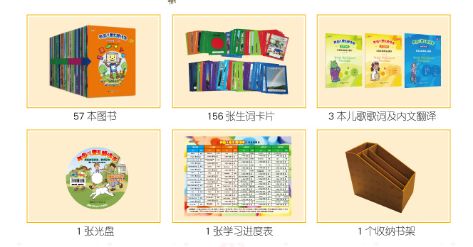 刚才介绍了19个主题,那么,每个主题都包含些什么呢?它包含:3本书+8张单词卡。