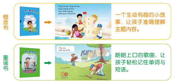 这3本书的编辑大有讲究,为什么这么说呢?因为这3本书分别是:概念书、童谣书、无字书。下面我们用图来说明,书和卡片的内容及功能。