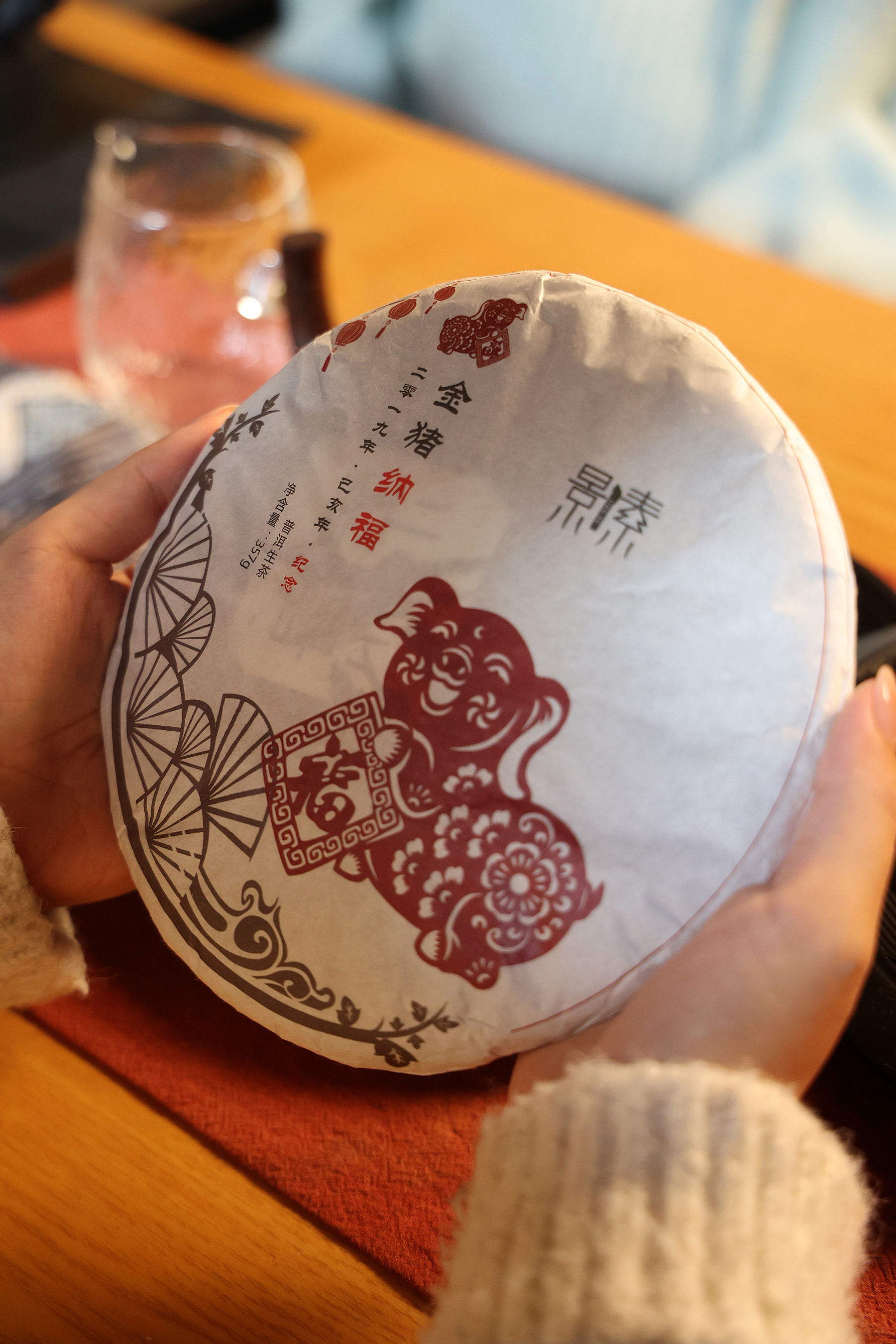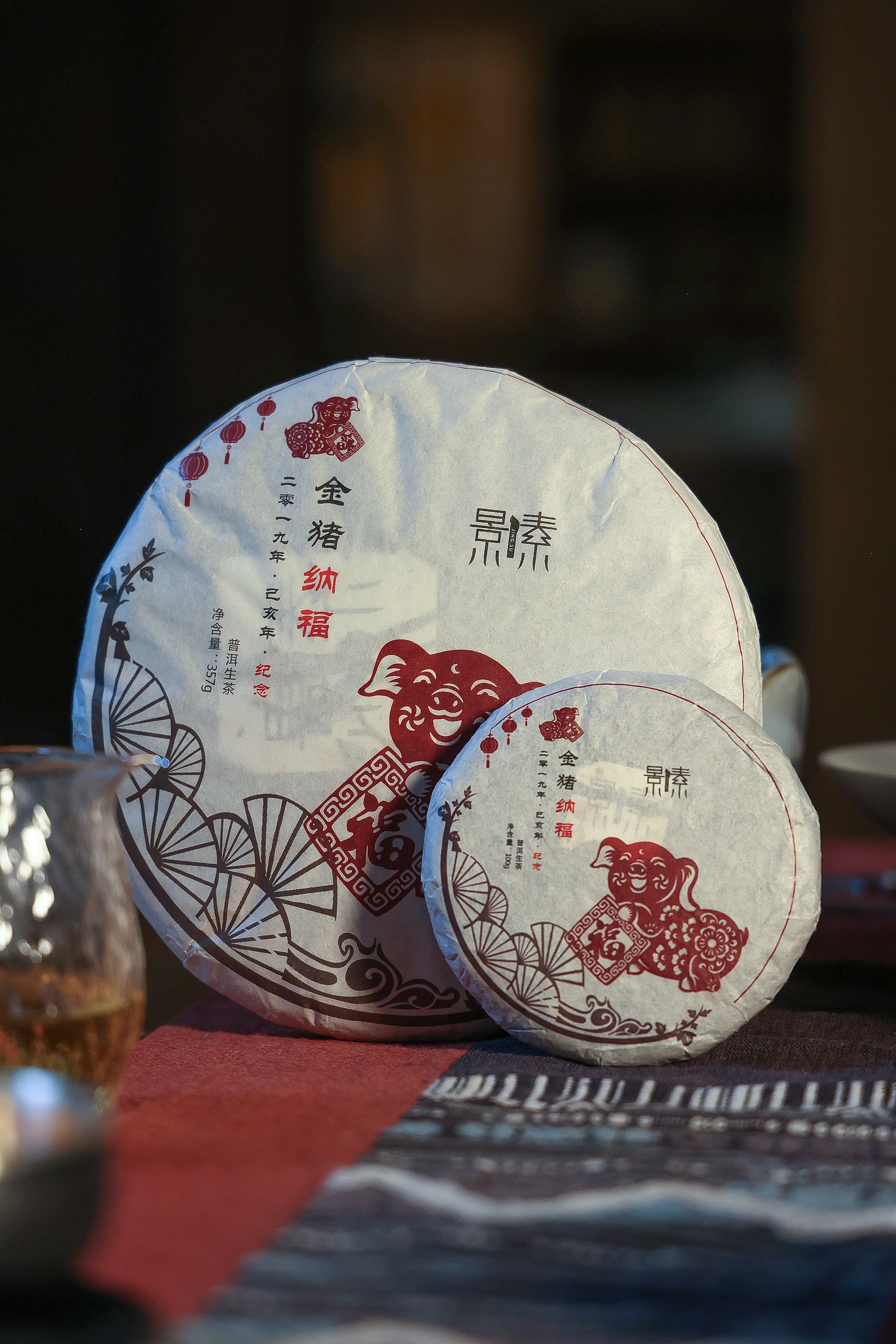 景素金猪纳福生饼,原料采自普洱景谷山(普洱市主要的七大古茶山之一)2017年大叶种晒青茶。