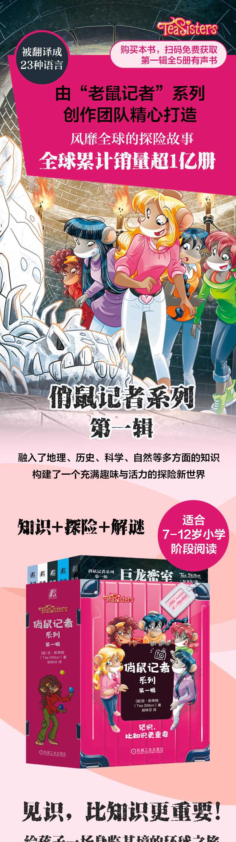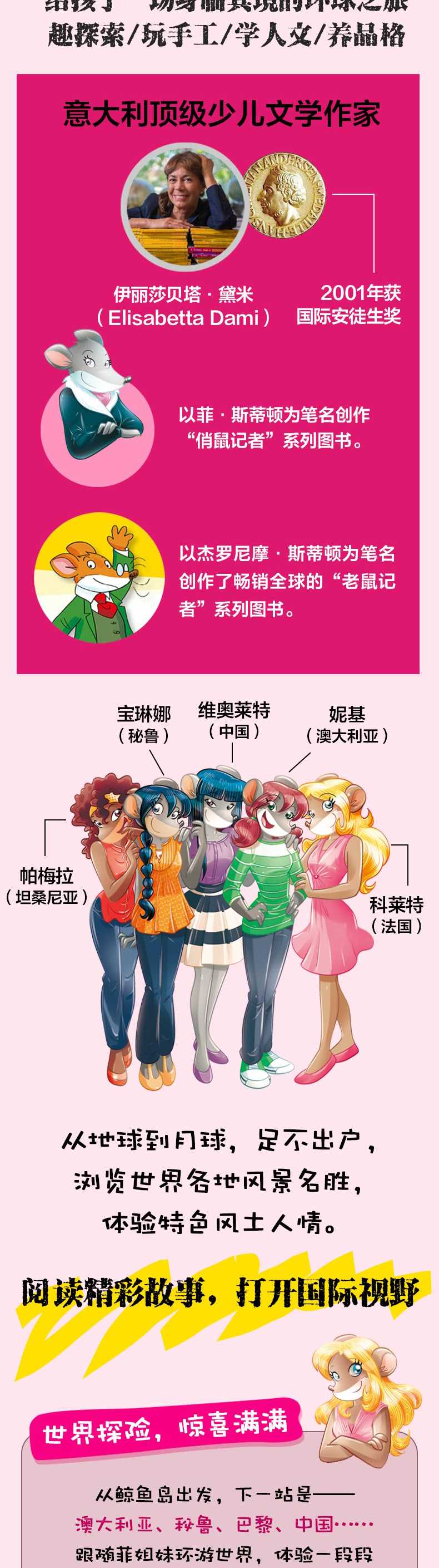;俏鼠记者系列通过杰罗尼摩bull;斯蒂顿妹妹菲bull;斯蒂顿的视角,讲述了;我在鲸鱼岛的鼠津大学遇到了五个非常特别的女孩妮基、科莱特、维奥莱特、宝琳娜、帕梅拉,展开了一段段去往世界各地的探险解谜之旅,语言幽默,情节惊险,非常适合处于小学阶段的青少年阅读。首先,这套书是由畅销书;老鼠记者系列原班人马精心打造,其解谜十阅读的模式不但继承了;老鼠记者系列的趣味性,还增加了很多逻辑思考和百科知识,尤其是最后还有一些互动解谜游戏,完美地将故事、解谜、知识融为一体。是问目前市场上还有哪套书能做到这一步呢?其次,这套书中的故事惊险、曲折,谜题构思巧妙,场景跨越全球。让读者们在探险解谜中,欣赏七大洲的美景同时,把世界各地的文化尽收眼底,把地理、历史、科学、自然等百科知识装进脑袋。并且,作者把这些知识点分门别类地注释在了各个地点,可供孩子们反复阅读。不是所有的家长都有条件带着孩子去看世界,但是买一套能够将世界尽收眼底的书对于广大家长来说,却不是什么难事。书中的世界,不比外面看到的差。再者,和;老鼠记者系列一样,;俏鼠记者系列同样运用的是将作者主人公化的写作手法。不管是杰罗尼摩bull;斯蒂顿还是菲bull;斯蒂顿,都是朋友一般的存在。看书的时候,多了很多亲切的地方,不会再像是在读作者写的那样,而是如同在读朋友寄来的最近见闻一般,更加真实。最后,逻辑思考一路随行,培养孩子学会观察和记录的良好思维习惯。众多家长苦恼于如何才能让孩子在好故事中获得更多的收获,即使每晚都陪孩子看书,孩子看到的依然只是故事的热闹。这是因为,一般故事书的设计就是让孩子;只看热闹。如果孩子喜欢,那么这本故事书就成功了。所以,我们在;俏鼠记者探险解谜系列的故事中适时地加入各种解谜和百科知识来引导孩子来从故事里获得良好的思维习惯的同时,还能学到很多知识。这样,既可以让孩子读探险故事的时候有适当的休息,还能留下各种逻辑上的伏笔,在阅读后面的故事时,自然而然地去寻找答案。