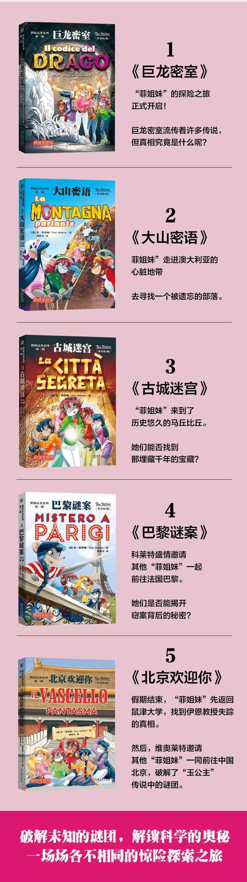 这套;俏鼠记者系列可以称得上是女孩子们不可不读的探险解谜书。它的主人公是五位魅力四射的女孩子,她们来自不同的国家,她们有着截然不同的性格,有着令人羡慕的友谊,还有着不同寻常的在世界各地探险的经历。她们像是带领冒险队伍的五位小导游,带领孩子们破解一个个谜团,感受各地的风土人情,游览不同的自然风光。来自澳大利亚的妮基致力于生态环境的保护,她就像是大自然的宠儿,非常擅长户外运动,遇到挑战体能的难题,她总能迎刃而解;来自法国的科莱特有着一颗粉色的少女心,她非常注重自己的外表,也很擅长衣帽的穿搭。她的行动力很强,也非常乐于助人。此外,她还擅长女孩子们感兴趣的一切话题;来自中国的维奥莱特是个做事精益求精,乐意学习新知识的文艺女青年。她喜欢一边喝茶,一边听着古典音乐读书。此外,她的心思非常细腻,可以照顾到身边的每一个人;来自秘鲁的宝琳娜可是个电脑高手,她常常能在互联网上找到无数信息,解决超级复杂的难题。此外,她喜欢旅游和认识新朋友,虽然她有时候还有一点儿害羞;来自坦桑尼亚的帕梅拉梦想成为一名体育记者或者机修工,给她一把螺丝刀和一把扳手,她就能搞定一切和机械有关的问题。五姐妹在鼠津大学读书,认识了俏鼠记者菲bull;斯蒂顿,于是取菲bull;斯蒂顿的名字中的;菲字为姐妹团命名,把这个五人小团体叫做;俏鼠菲姐妹!01.巨龙密室开学季到来,;菲姐妹的探险解谜之旅正式开启!在历史悠久的鼠津大学里,发生了一起神秘事件小鼠汉斯突然失踪了。与此同时,学校里的一座地下密室也透露出种种玄机,似乎与汉斯的失踪有着千丝万缕的联系。关于这座密室,还流传着许多传说,但真相究竟是什么呢?;菲姐妹决定揭开这一切谜团。她们勇敢地踏入地下密室,开始寻找失踪的小鼠汉斯。在密室中,她们发现了许多神秘的字符,这些字符似乎隐藏着某种线索。菲姐妹们凭借智慧和勇气,一步步解开这些字符背后的秘密。这次探险是;菲姐妹五个女孩儿第一次共同经历的奇妙旅程。她们相互扶持,共同面对困难,努力寻找着失踪的汉斯。最终,她们能否成功解开密室之谜,找到失踪的小鼠汉斯,并圆满地完成这次探险经历呢?让我们拭目以待。02.大山密语妮基家在澳大利亚的牧场近期遭遇了神秘的威胁,牧场上的羊儿们患上了一种奇怪的病症。为了帮助妮基这位好姐妹,维奥莱特、帕梅拉、科莱特和宝琳娜决定再次踏上新的探险解谜之旅。这次,;菲姐妹的目的地是遥远的大陆澳大利亚。面对充满危险的任务、暗中捣乱的恶人以及充满未知的偏远地区,;菲姐妹毫不畏惧。她们根据图腾的指引,前往祖先之地,走进澳大利亚的心脏地带,去寻找一个被遗忘的部落。这场旅程又有什么神奇的经历在等着她们?03.古城迷宫宝琳娜接到了妹妹玛丽亚的电话,得知匡特察察教授的儿子、考古学家贡萨洛在秘鲁失踪了。为了援助这位遇到困境的老朋友,宝琳娜决定立即启程前往秘鲁。同时,其他;菲姐妹成员也毫不犹豫地加入了她的行列,共同踏上了一场全新且难忘的探险解谜之旅。五个女孩的目标很明确:找到身处险境的考古学家贡萨洛。她们来到了历史悠久的马丘比丘。在这里,她们将面临一系列严峻的挑战:一座看似不可逾越的山峰、一只体型庞大的秃鹰,以及一个邪恶的犯罪团伙。这些挑战不仅考验着她们的勇气和智慧,更让她们一步步接近那些隐藏在历史尘埃中的秘密。随着探险的深入,她们逐渐揭开了未知的秘密古城的面纱,这个古城属于一个早已消失的古代文明。而更令人兴奋的是,她们还发现了这个文明遗留下来的巨大宝藏。这些宝藏不仅价值连城,更承载着古代文明的智慧和历史。最终,;菲姐妹五个女孩儿能否成功帮助匡特察察教授找回失踪的儿子?又能否在这片古老的土地上找到那埋藏千年的秘密古城中的宝藏?这一切的答案,都等待着她们去揭晓。04.巴黎谜案科莱特盛情邀请其他;菲姐妹一起前往法国巴黎共赴一场美妙的旅行。不料,这场旅行却意外变成了一场破解迷案的冒险。就在一场至关重要的时尚走秀前夕,科莱特的服装设计师朋友朱莉遭遇了毕业作品失窃的离奇事件。随着调查步步深入,;菲姐妹发现这起盗窃案背后似乎暗藏玄机。为了追踪犹如幽灵般狡猾的小偷,;菲姐妹步步紧逼,紧咬着小偷的踪迹不放,并与其在巴黎铁塔下展开了一场紧张刺激的追逐,直至对方被迫逃入了巴黎歌剧院。最终,;菲姐妹是否能揭开神秘小偷的真实身份?这起窃案背后的秘密到底是什么?朱莉的毕业作品与传闻中的密室有着怎样的关系?这一个个谜团的答案,正逐渐浮出水面。05.北京欢迎你假期结束,;菲姐妹满怀期待地重返鼠津大学,却未曾料到,一系列新的谜团正悄然地等待着她们。这次,她们将潜入鲸鱼岛周围的深海里,追寻伊恩教授神秘失踪的真相,这起失踪事件似乎与传说中的;穆西女王号有着千丝万缕的奇妙联系。在解决完完这个事件后,维奥莱特的父母发出邀请,五位;菲姐妹一同前往古老的中国,在那蜿蜒壮丽的长城之下,她们竟偶然发现了遗失已久的公主宝藏,并开始着手调查其背后隐藏着的秘密。然而,贪婪的黑暗势力也紧随其后,企图夺取这个珍贵的宝藏。面对重重危机与围追堵截,;菲姐妹凭借智慧与勇气,一次次化险为夷,不仅保护了宝藏,更破解了古老传说中的谜团。这是一场穿梭于奇幻