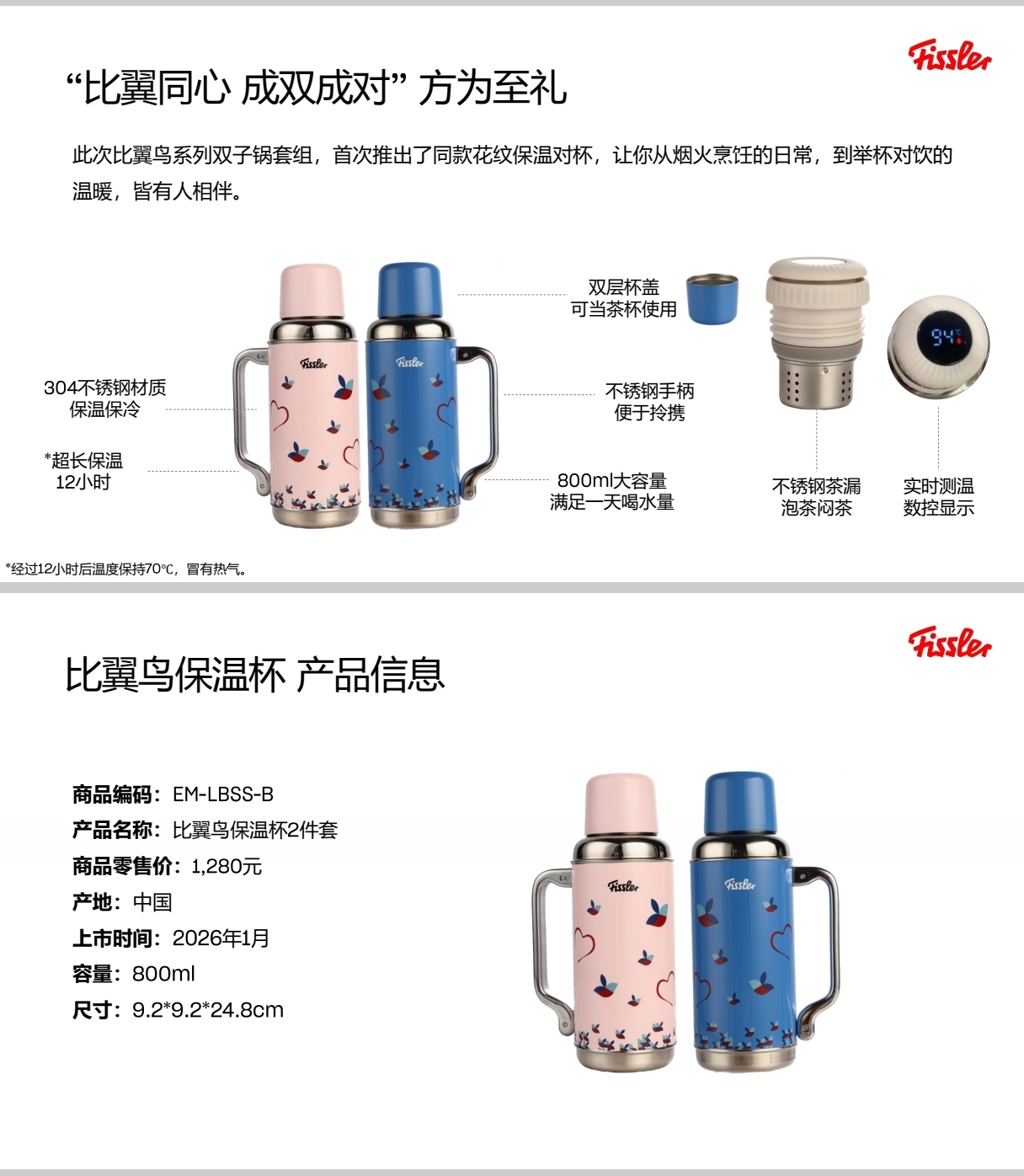 【春上新】【大白兔直播】10楼菲仕乐 比翼鸟不锈钢保温杯粉蓝2件套 吊牌价1280元 活动价399元