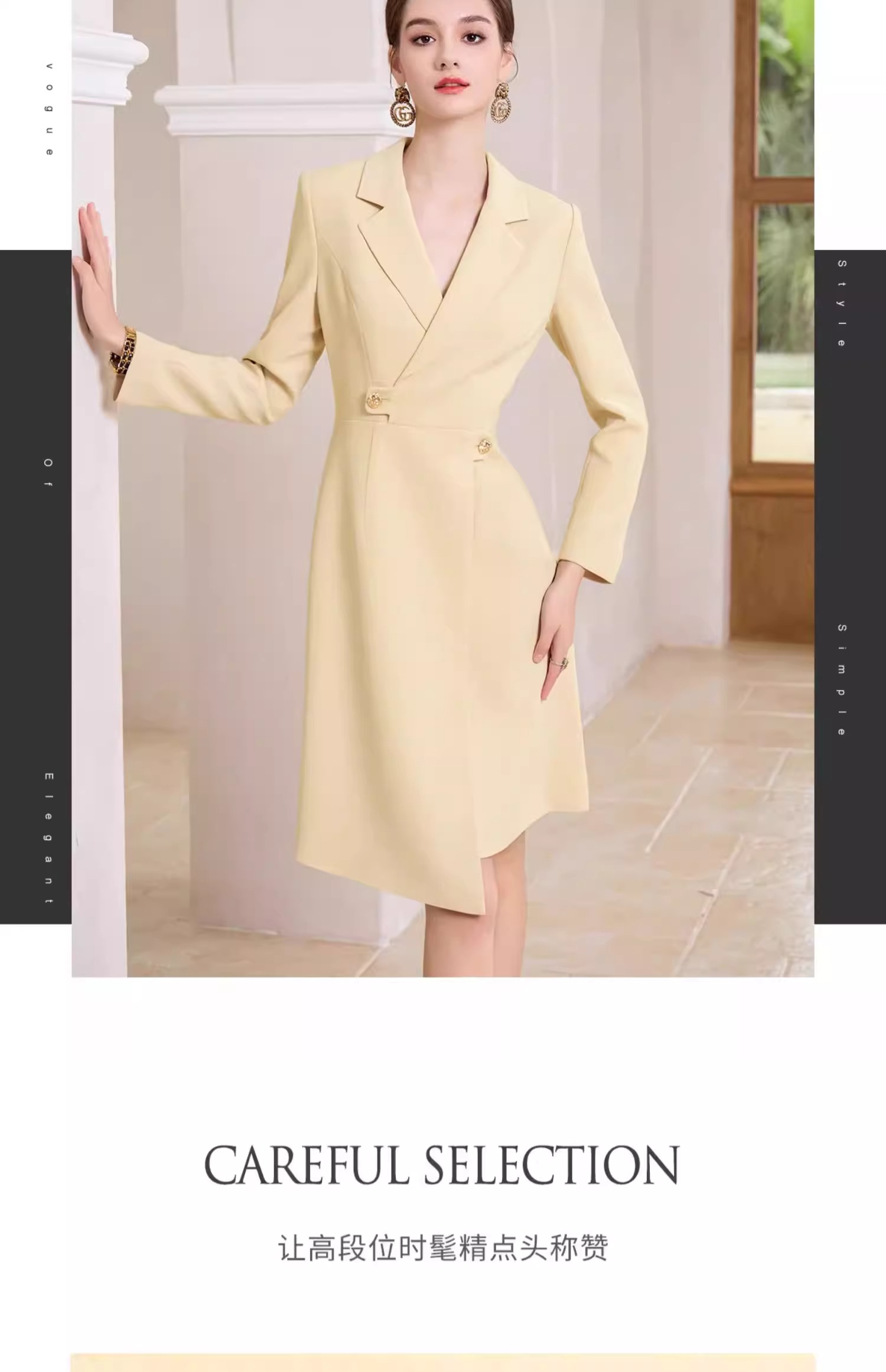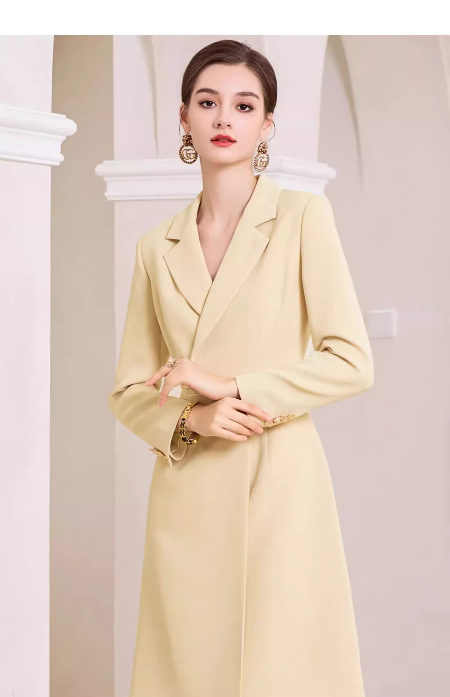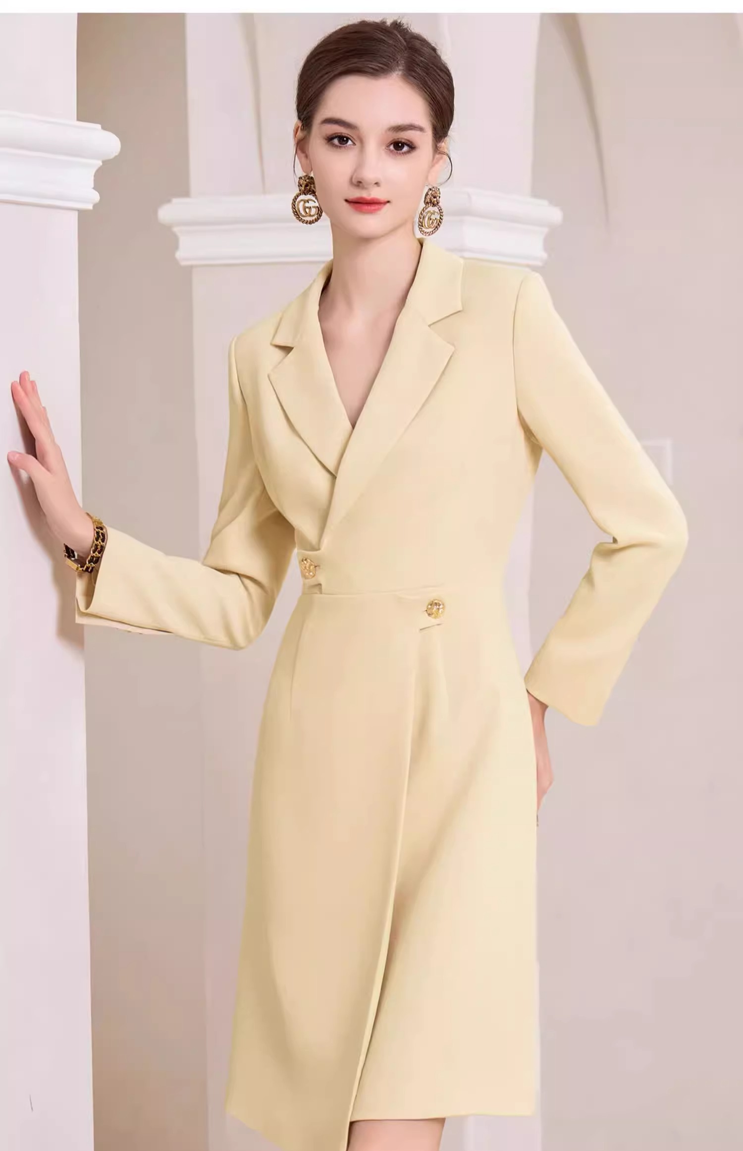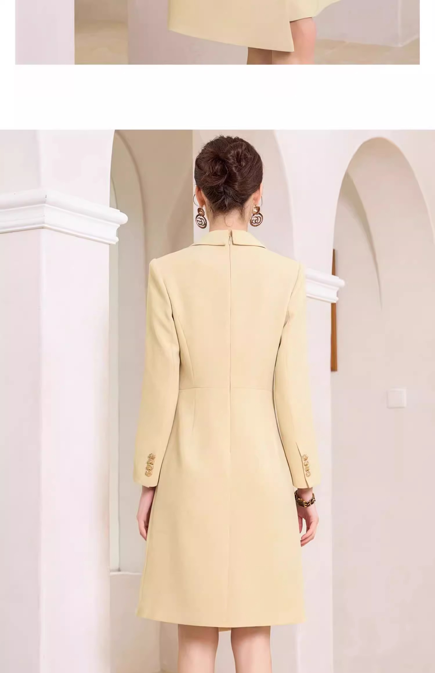 AD米黄色西装连衣裙女主持人上镜连身裙2023新款收腰显瘦西服裙子