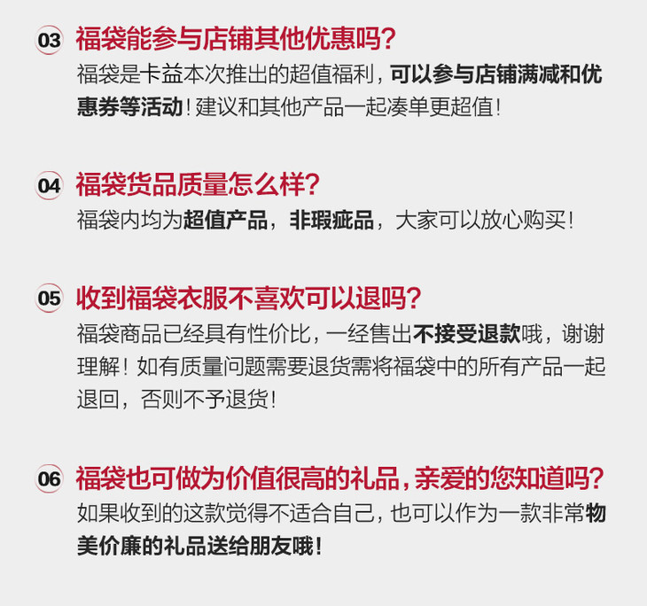 卡益福袋:款式随机(非当季新款),尺码可选,不接受备注和留言,一经售出不可退换货!如下单默认同意以上规则,谢谢亲的支持!
