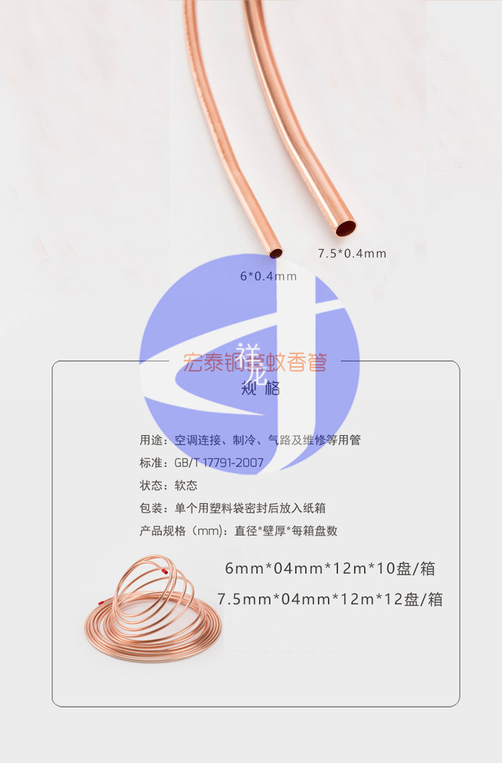 商品描述:中佳蚊香盘铜管 Φ7.5×0.4×12m 20盘/箱