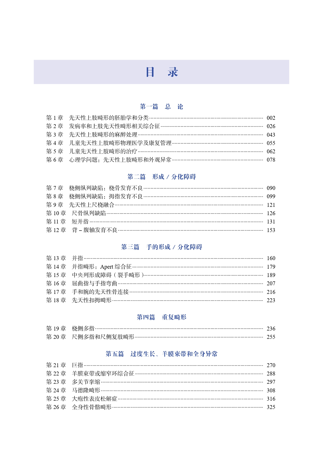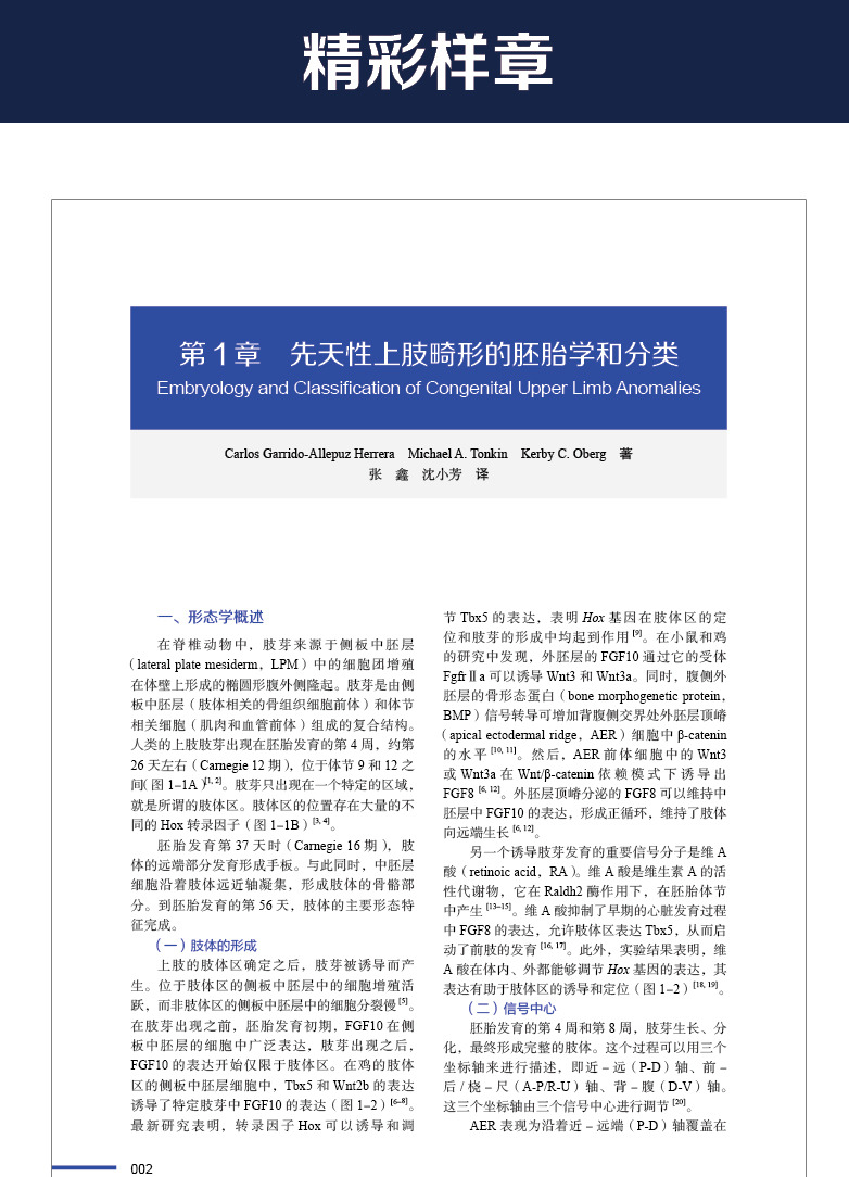 本书引进自 Springer 出版社,是一部有关儿童先天性上肢畸形的综合指南。全书共五篇26章,总论部分概述了先天性上肢畸形的胚胎学和分类、发病率、先天性上肢畸形的麻醉处理、康复管理、治疗及心理学问题;各论部分则按疾病分类,介绍了各种先天性上肢畸形的流行病学特点、病因学、分型、临床表现、治疗方法、并发症及预后等内容。本书内容翔实,科学性强,可供广大外科医生,尤其是手外科从业者及相关专科医生借鉴参考。