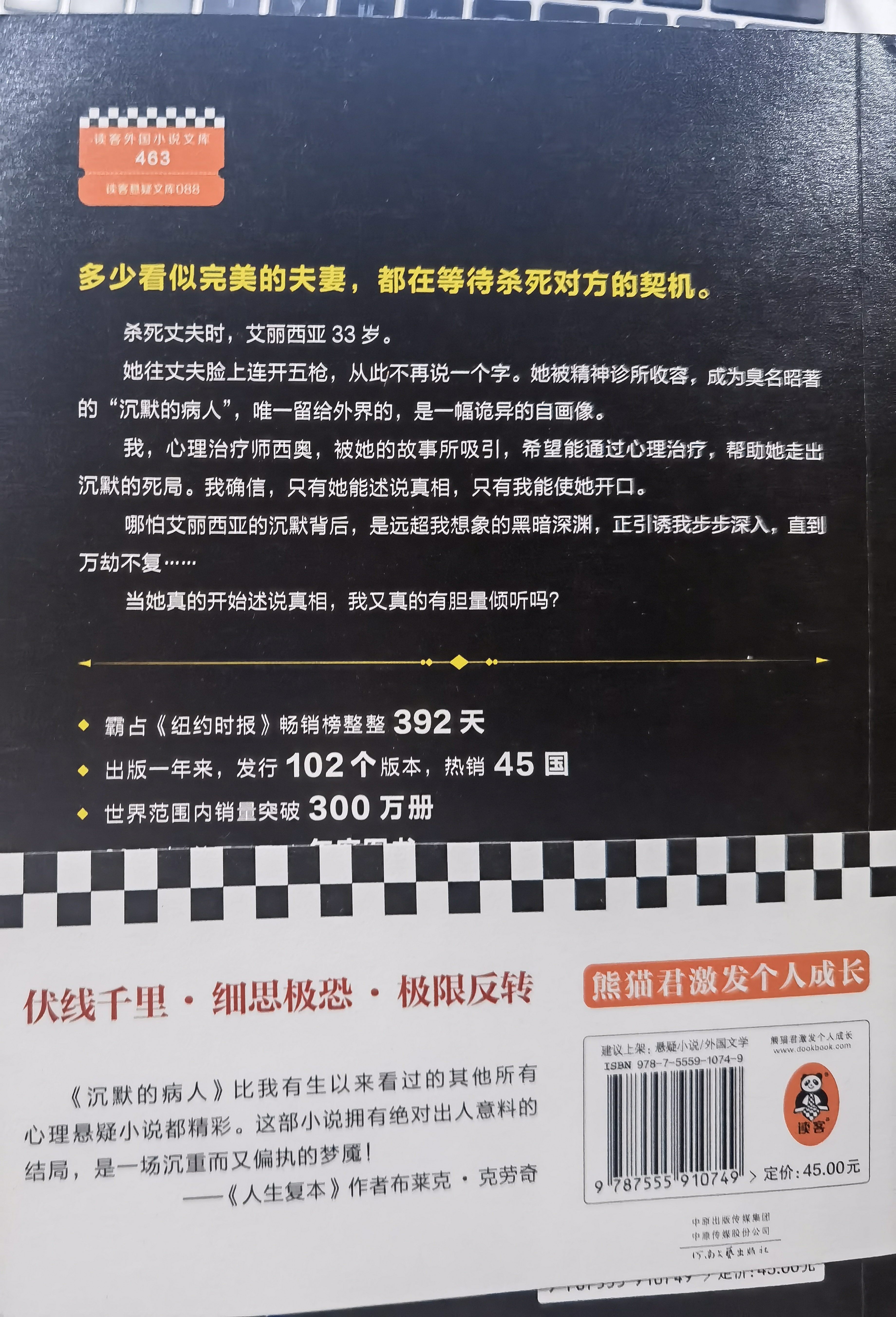 沉默的艾丽西亚能否走出沉默,能否道出杀死丈夫的秘密。更多的故事,还是翻看这本书,细思极恐,悬疑不断。