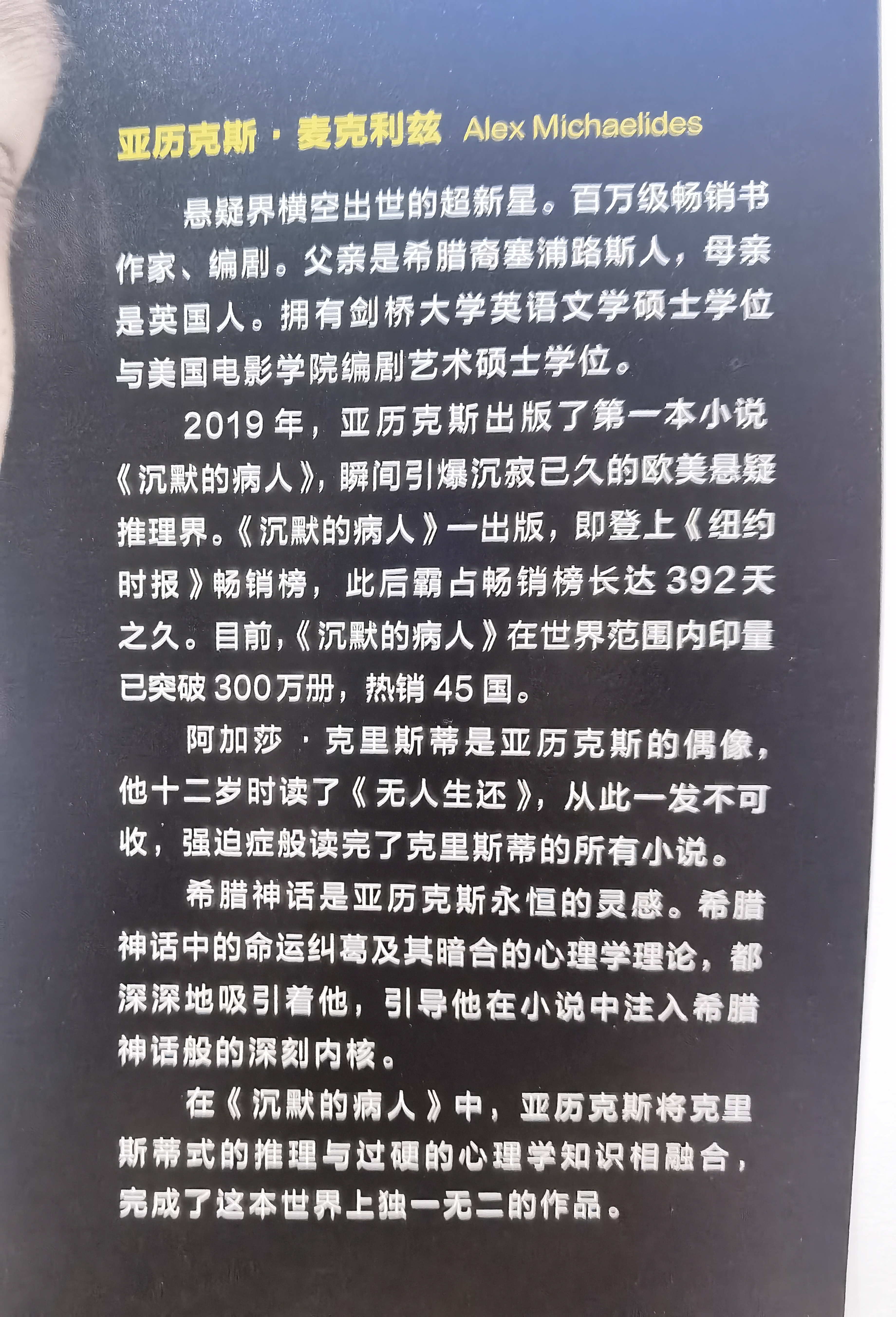 2019年,亚历克斯出版了第一本小说《沉默的病人》,瞬间引爆沉默多时的欧美悬疑推理界。《沉默的病人》一出版,即登上《纽约时报》畅销榜,此后霸占榜单长达392天之久。