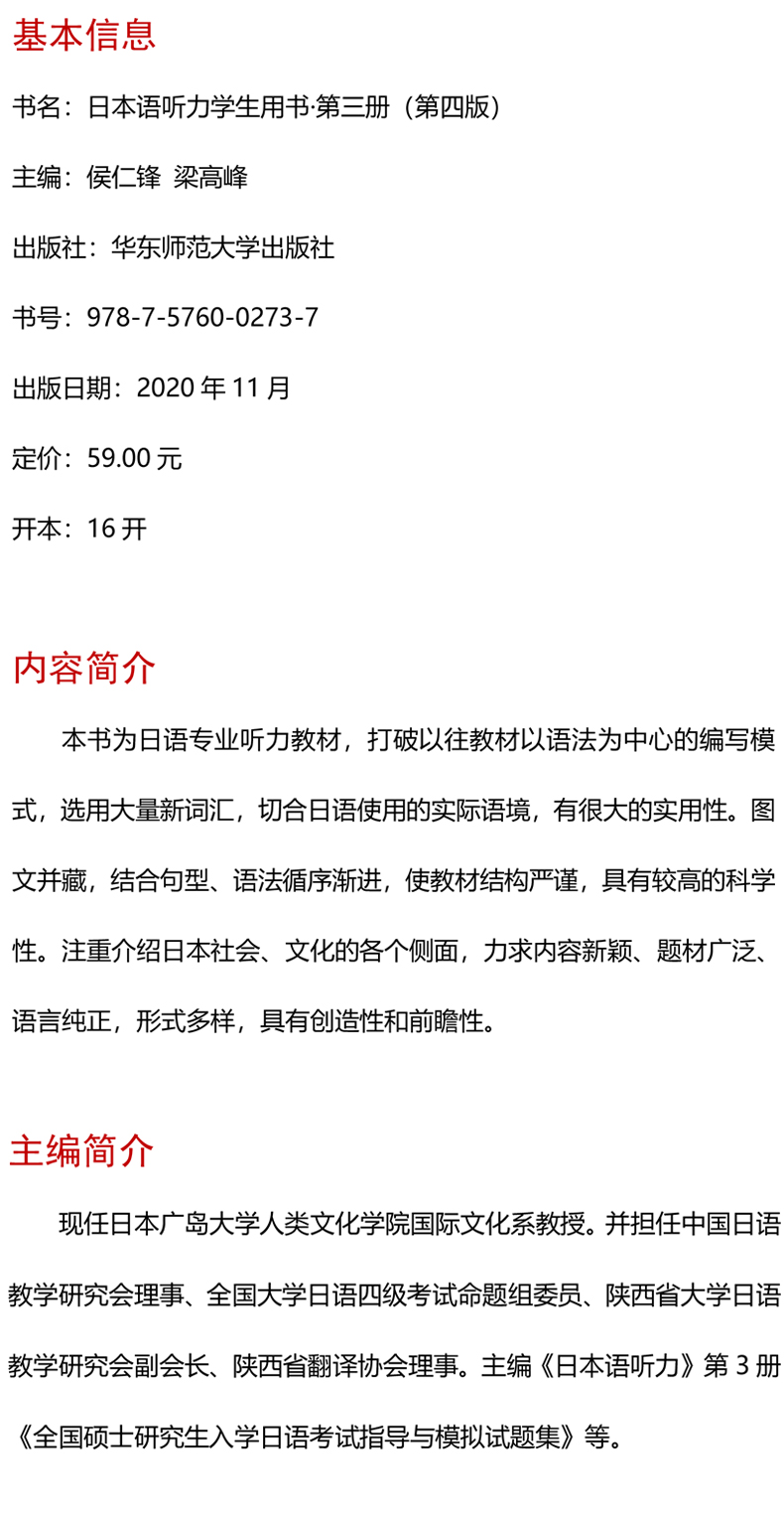日本语听力学生用书 第三册 第四版 普通高等教育 十一五 普通高等教育精品教材 正版 华东师范大学出版社