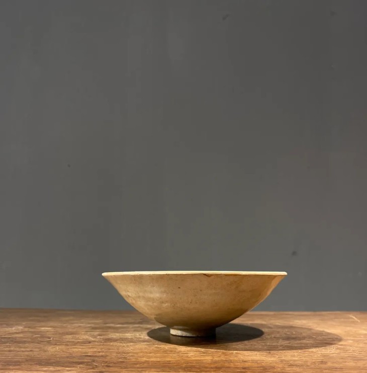 这是一件烧制于景德镇的影青釉瓷印花娃娃花卉纹碗,此烧制于景德镇的饅头实深碗,碗内模印影青釉瓷常见的娃娃与花卉纹,高岭土覆灰青色影青釉,釉面土沁严重,纹饰凸起除剥釉,是景德镇老茶碗。