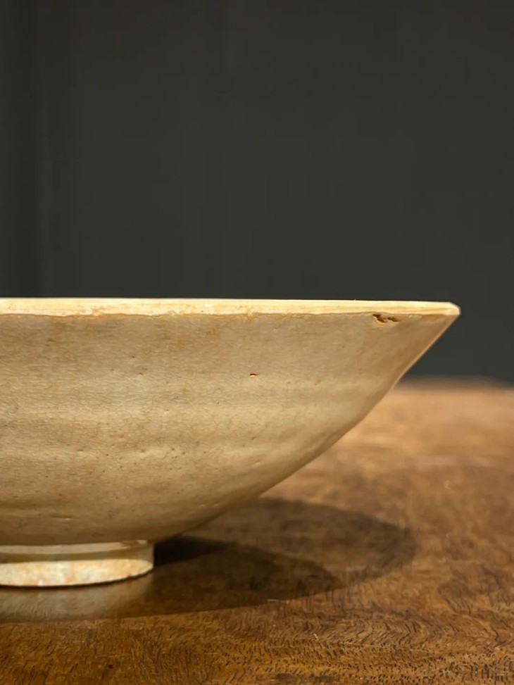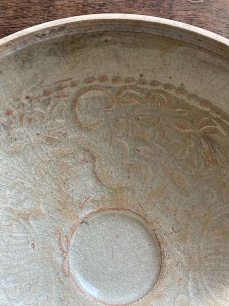 此影青印花娃娃花卉纹碗,造型优美,印花纹饰生动精美,典型元代景德镇影青釉瓷器,可惜釉面土沁严重,如图所示纹饰凸起除剥釉,除此之外基本保存完好无损。