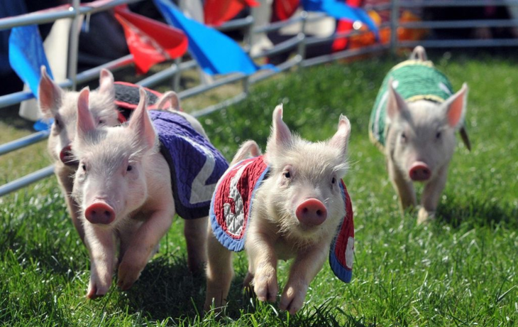 观赏小动物表演。笨拙可爱的小猪赛跑,奔跑吧猪兄弟,加油公鸡兄弟!