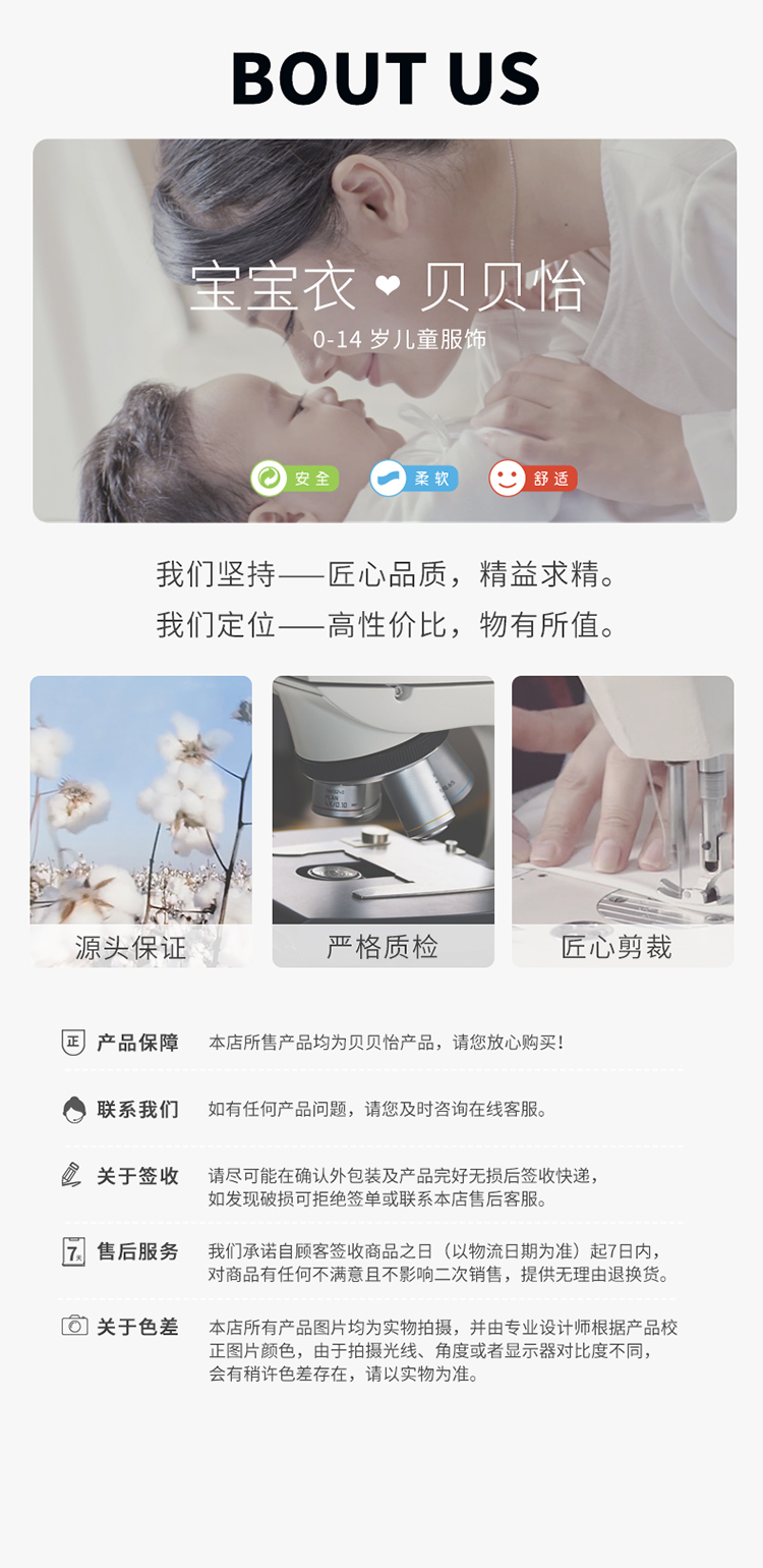 - 贝贝怡专注0-6岁婴幼儿服饰,坚持安全、柔软、舒适的产品理念,为千万中国家庭提供超高品质、安全可靠的婴幼儿服饰产品,妈妈放心,宝宝开心!