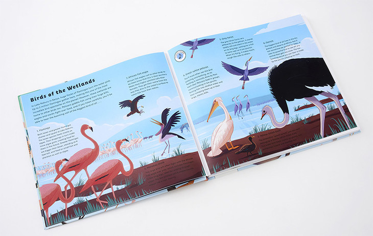In World of Birds, discover these amazing habitats: rainforest of New Guinea; Himalayan Mountains; Sonoran desert; North American prairie; English woods; Antarctic ice and ocean; Lake Nakuru in Kenya; city of Paris, France; Atlantic Ocean off Africa; and Australian outback.