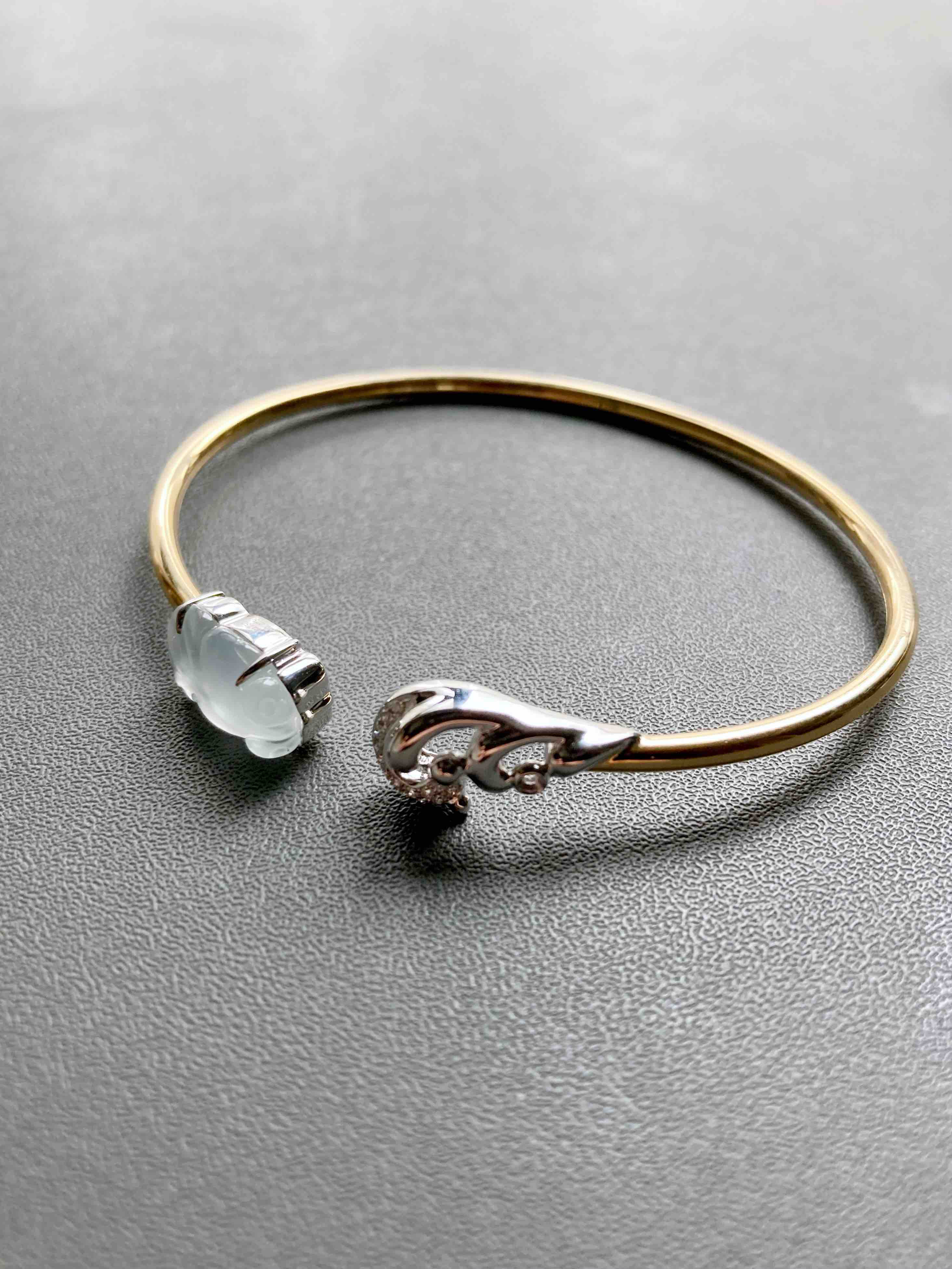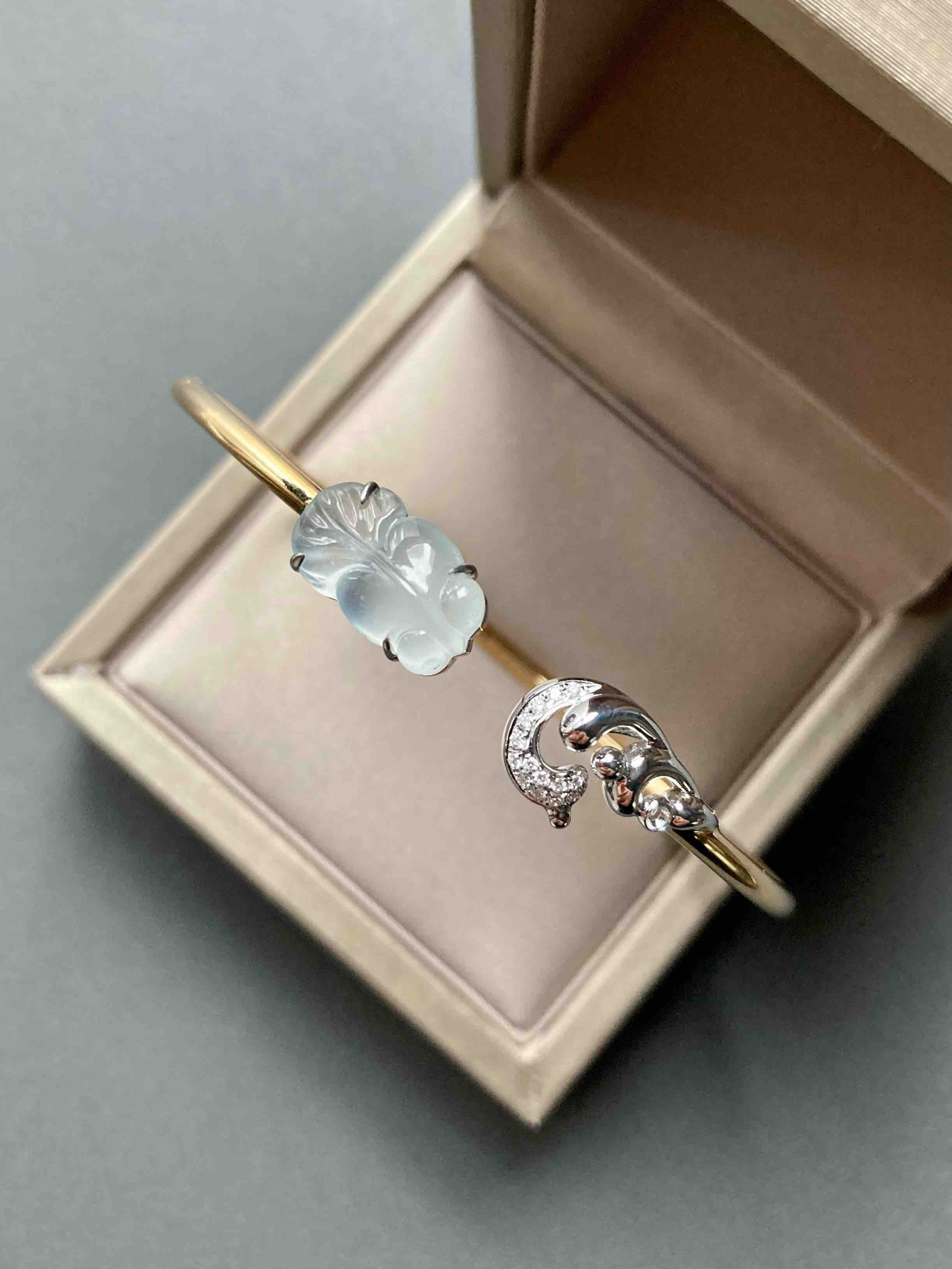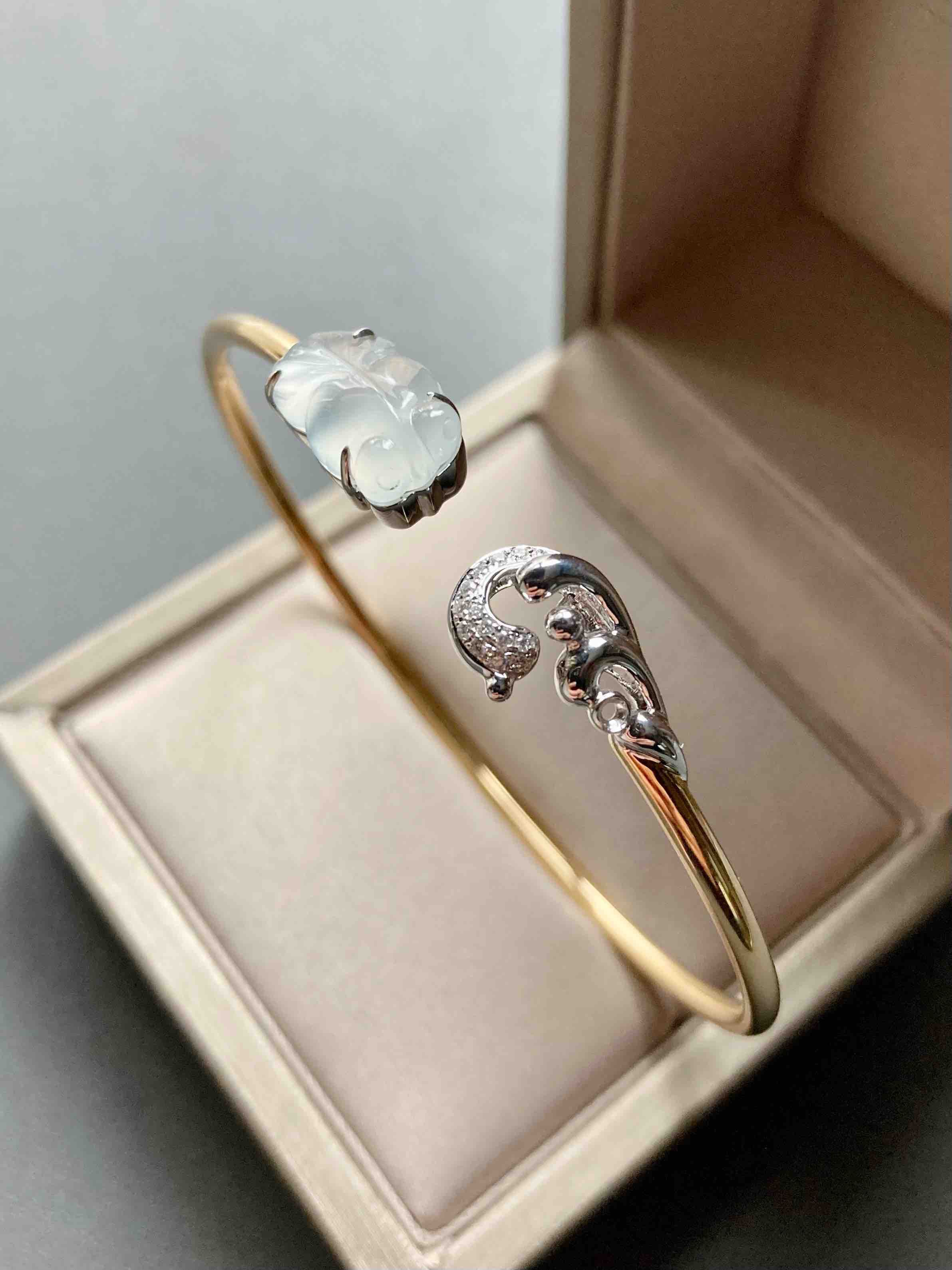艺术品,禄来家王牌原创设计款式,金玉满堂手镯,再续前缘,高冰种翡翠金鱼纯手工精雕,荧光四射,18k白金钻石镶嵌的手镯雕塑感十足,美丽的浪花,如鱼得水。等了很多年的小伙伴别错过哈,稀缺货。金鱼13.2×7.7×3.7mm,柔性镯身,不同手腕尺寸均可佩戴