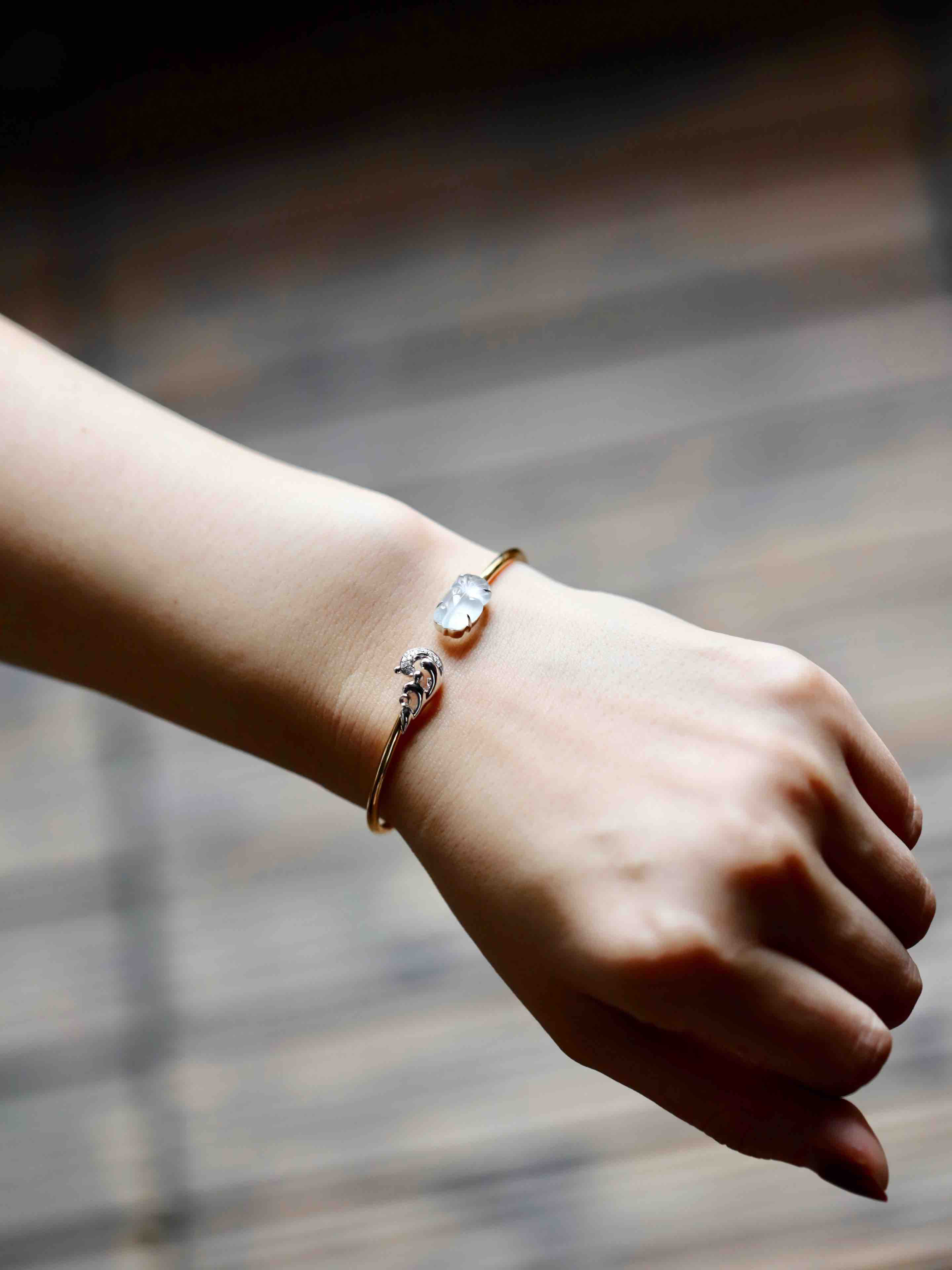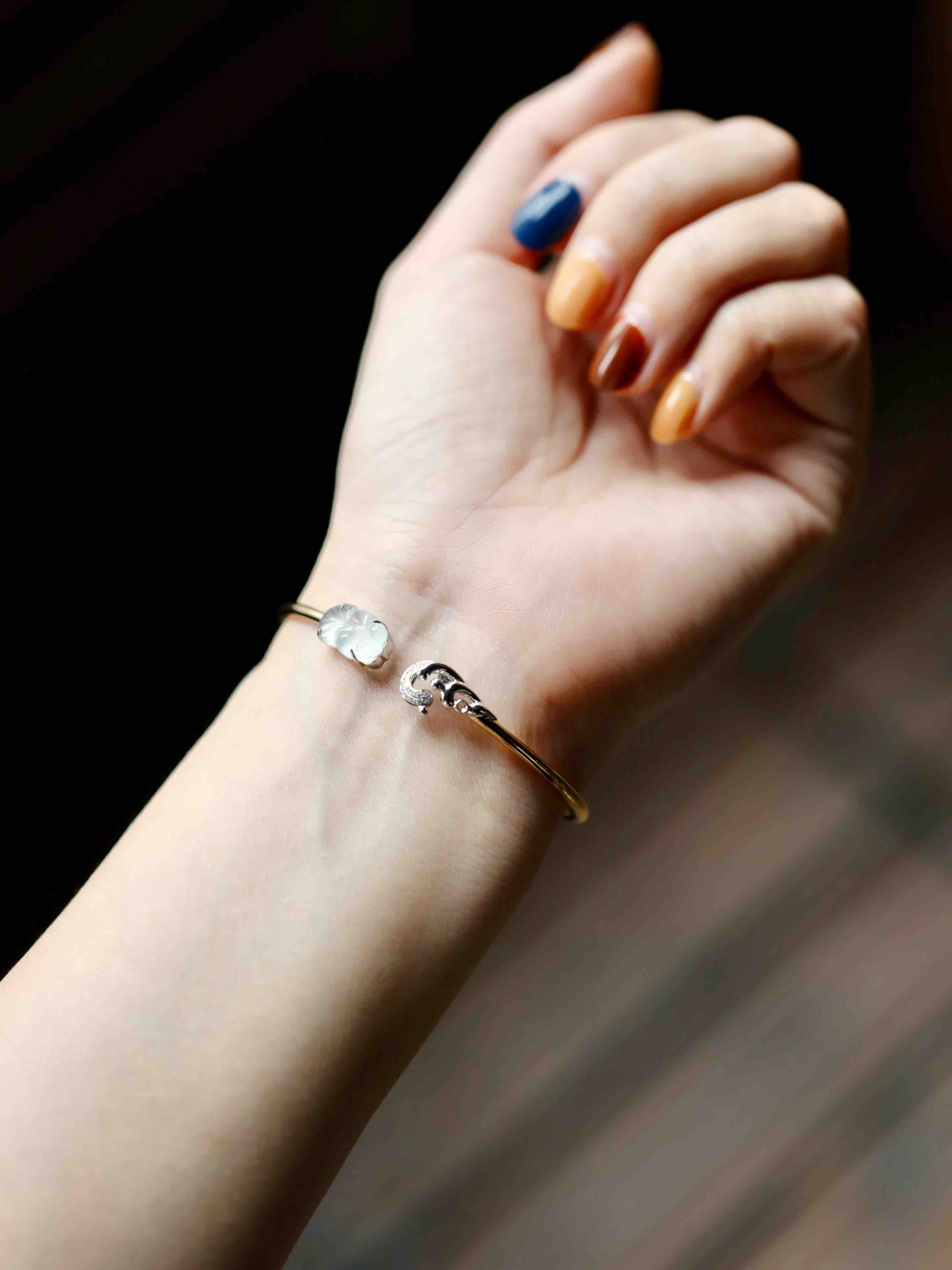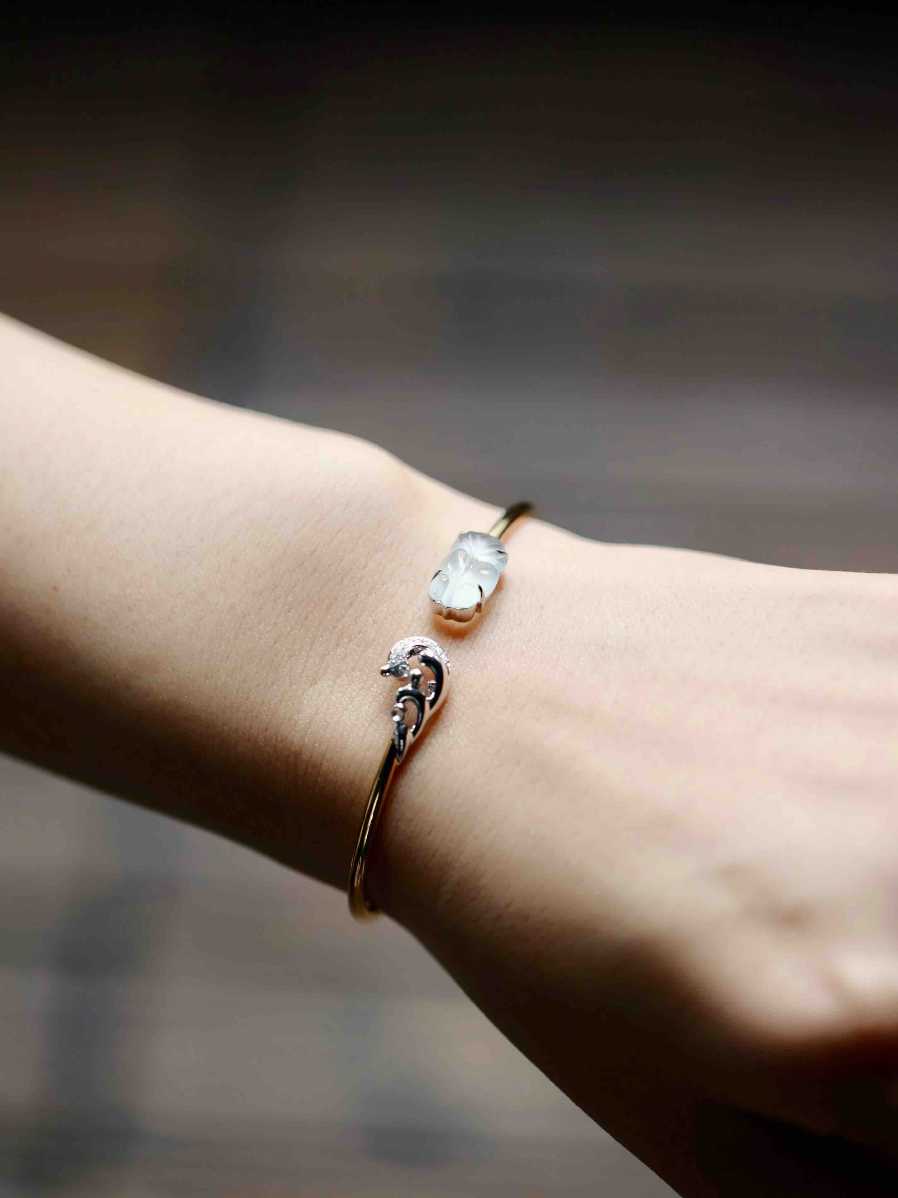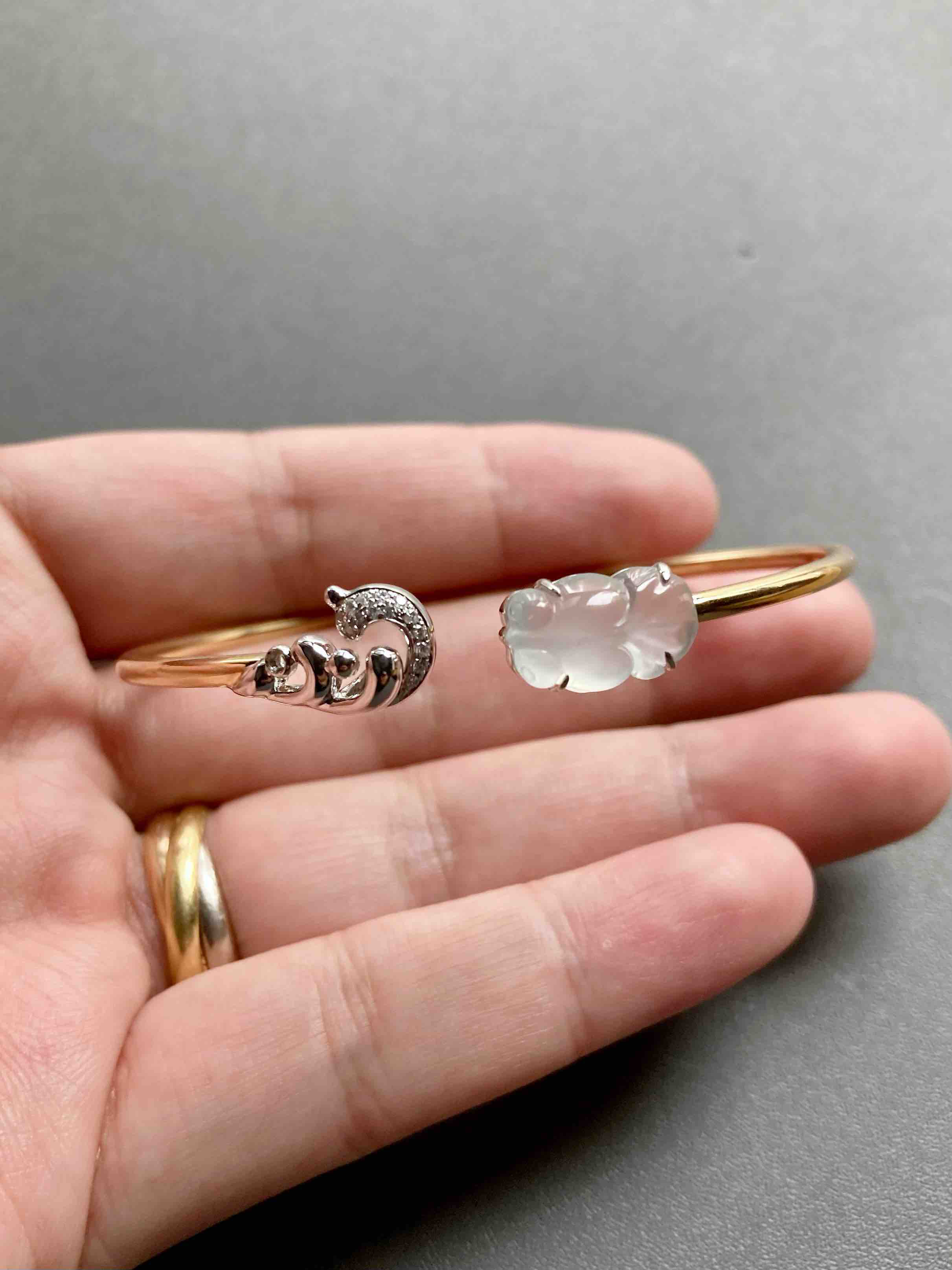 艺术品,禄来家王牌原创设计款式,金玉满堂手镯,再续前缘,高冰种翡翠金鱼纯手工精雕,荧光四射,18k白金钻石镶嵌的手镯雕塑感十足,美丽的浪花,如鱼得水。等了很多年的小伙伴别错过哈,稀缺货。金鱼13.2×7.7×3.7mm,柔性镯身,不同手腕尺寸均可佩戴
