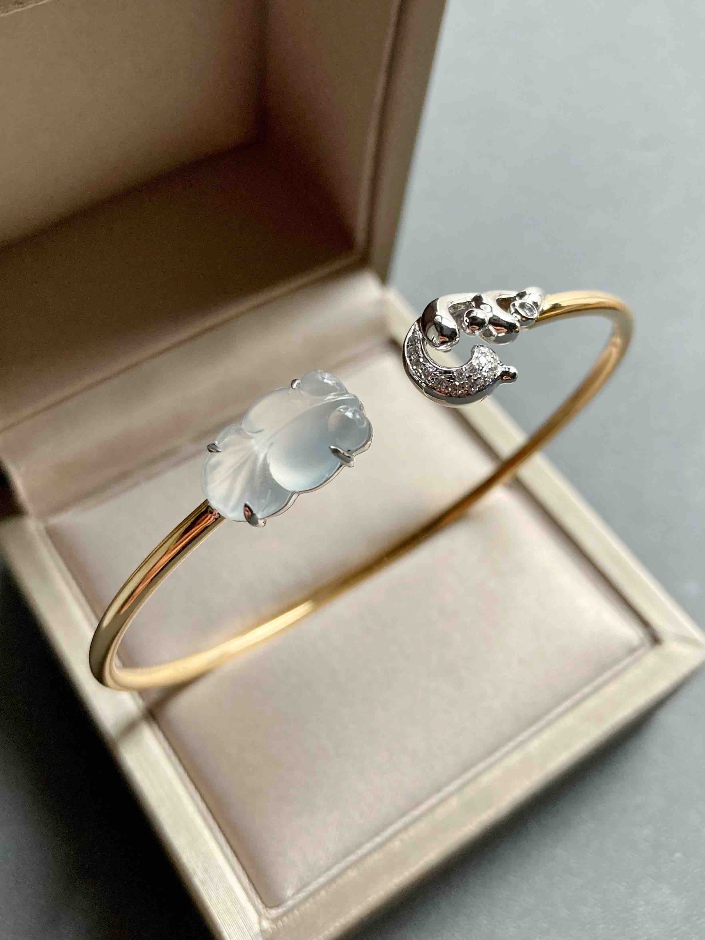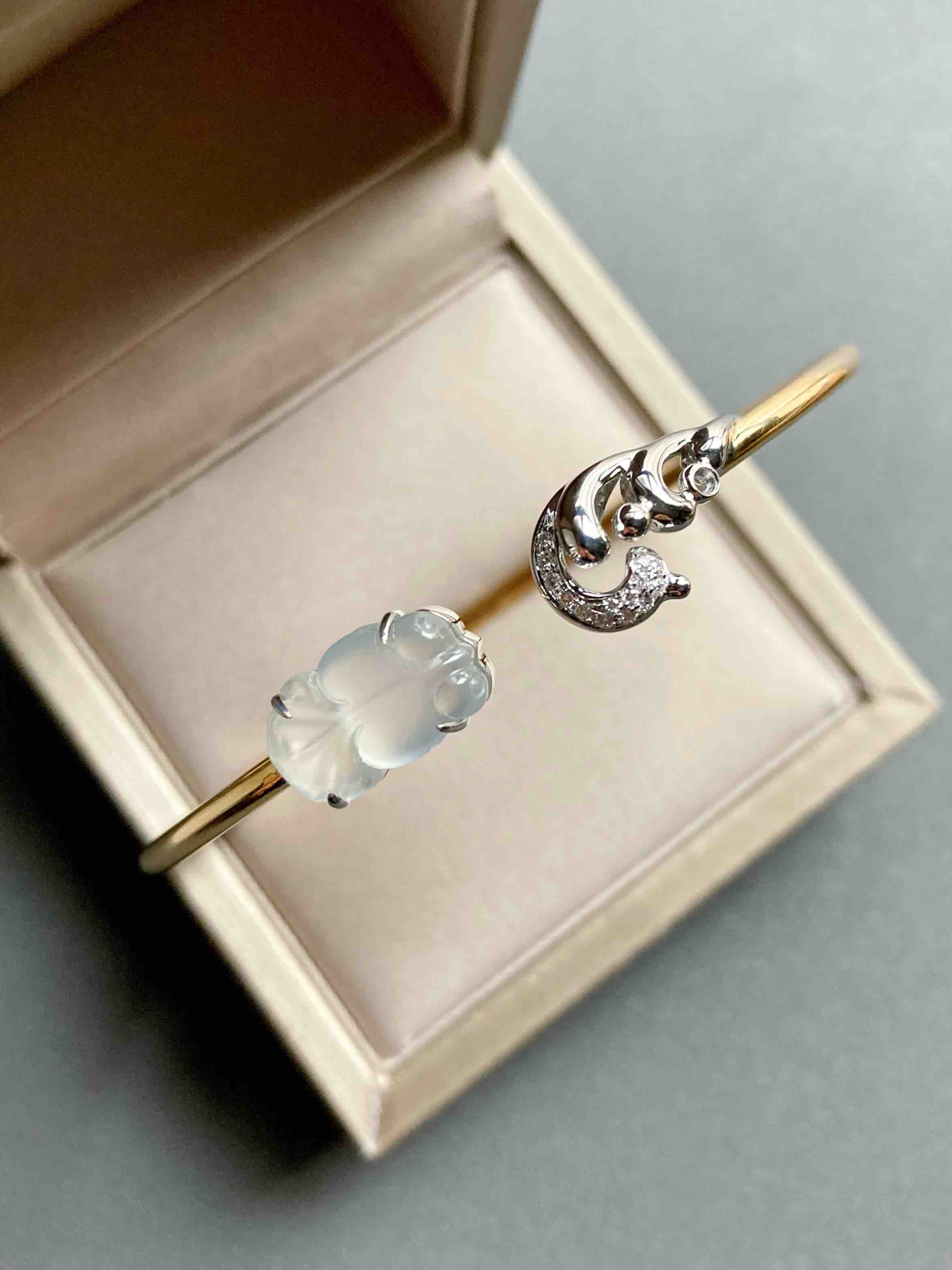 高冰种翡翠金鱼金玉满堂手镯18k白金黄金钻石镶嵌