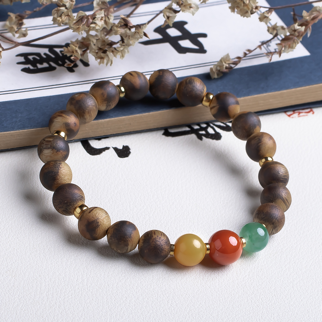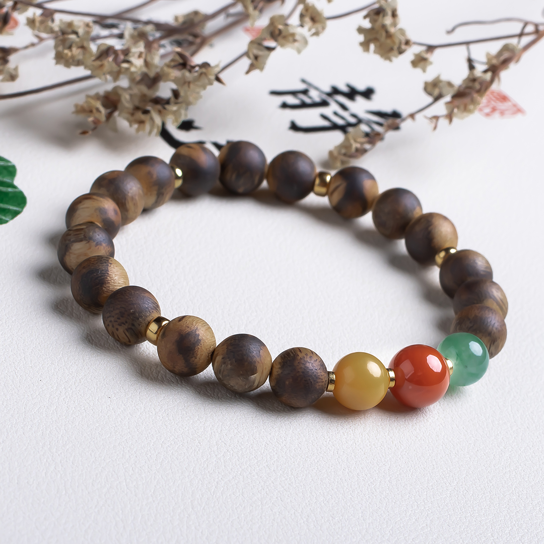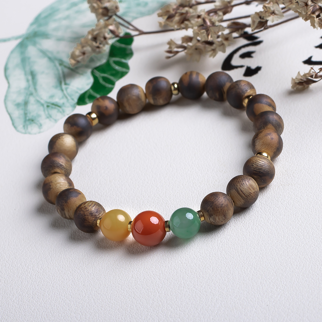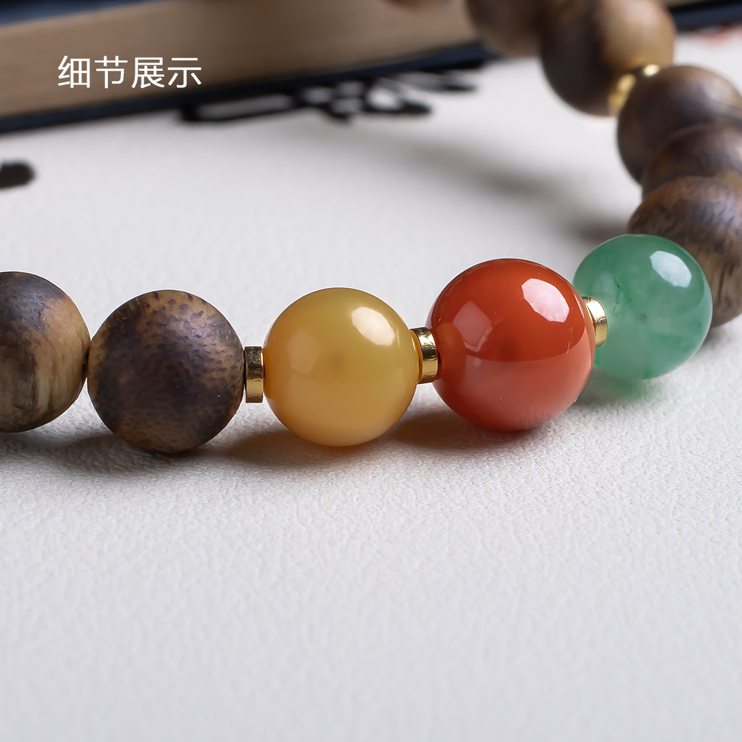 xy0541虎斑纹沉香+南红蜜蜡手串.银,天然沉香约8.4mm,特色虎斑料子,原色原味,香味自然清甜,红绿黄经典三色搭配,吉祥富贵,上手优雅有特色。
