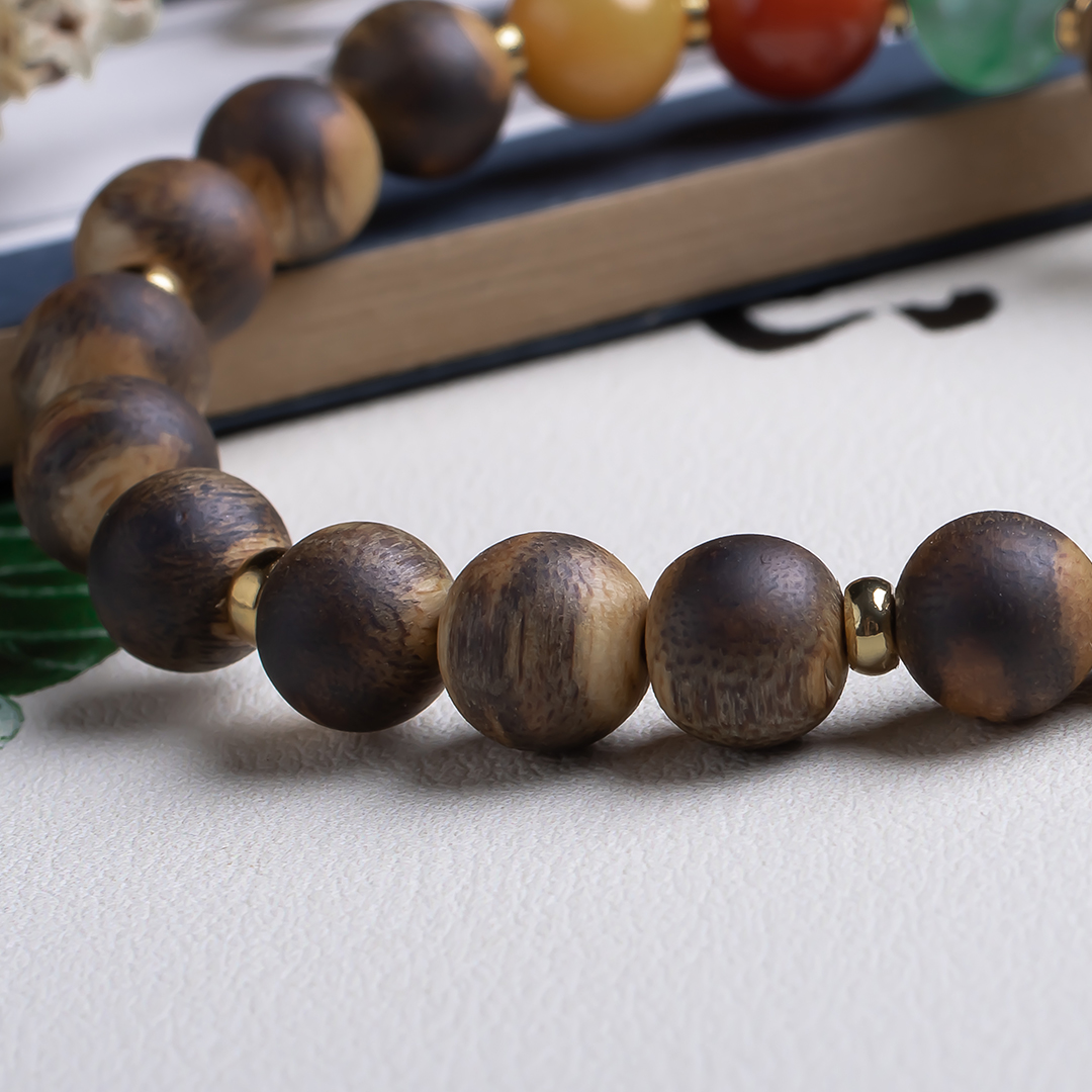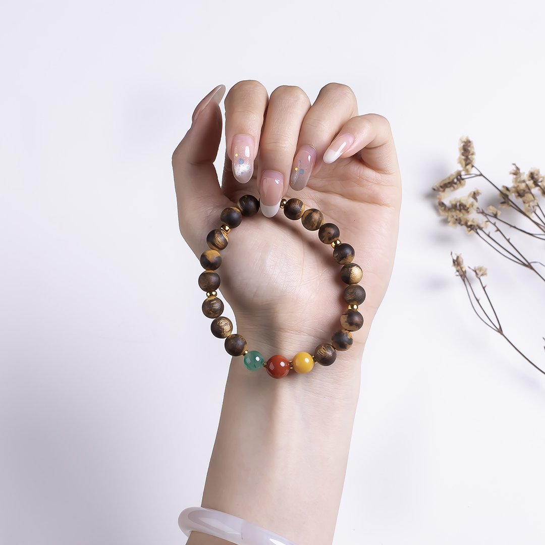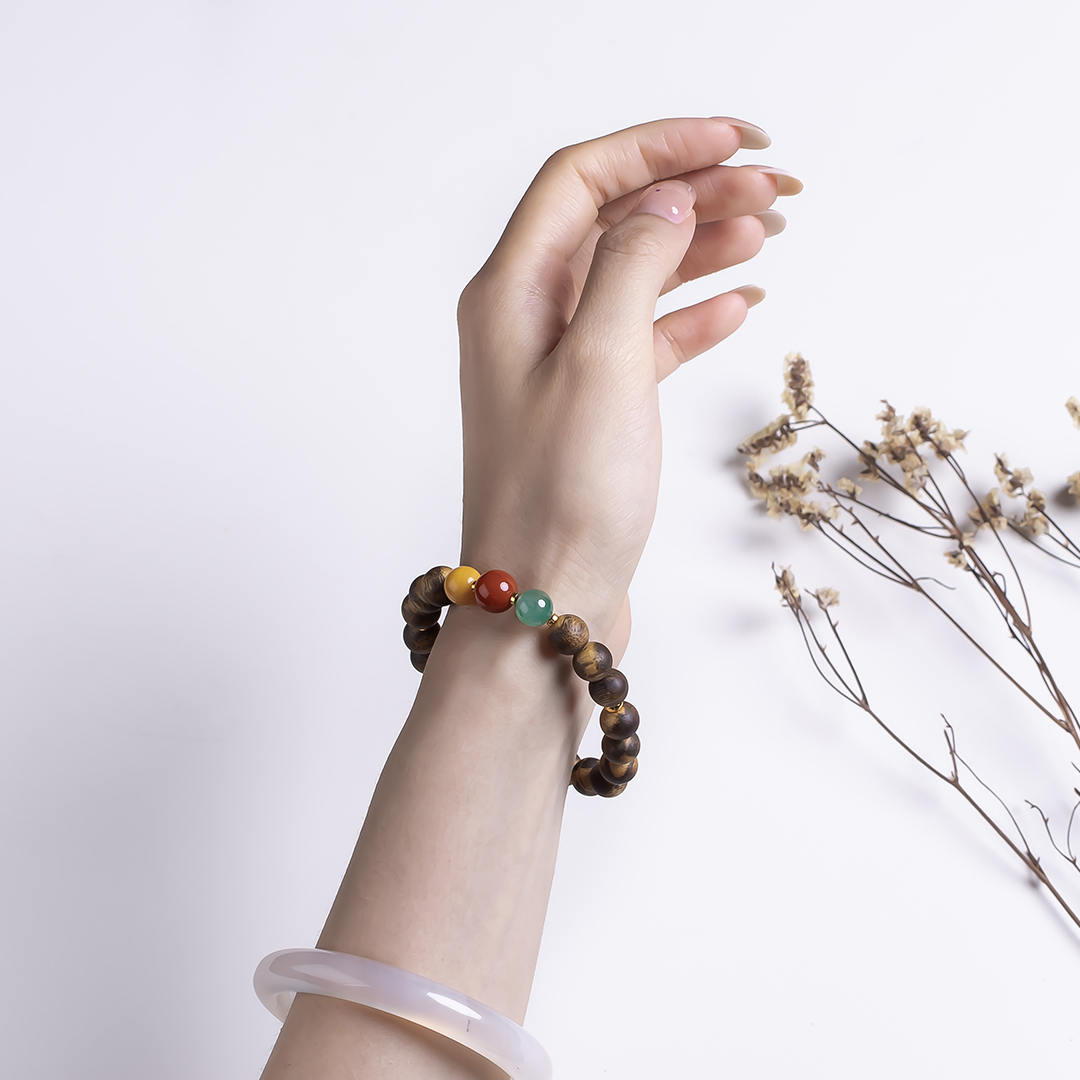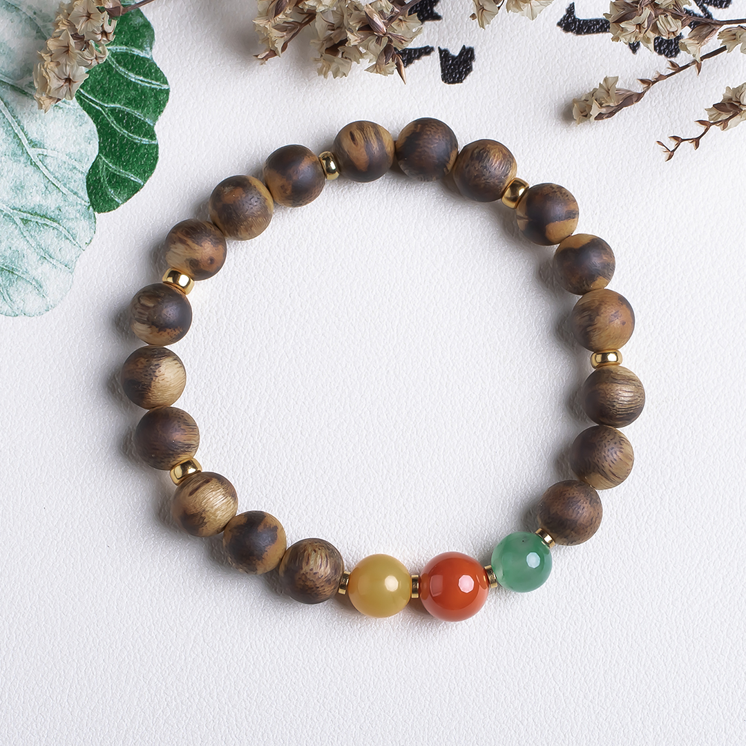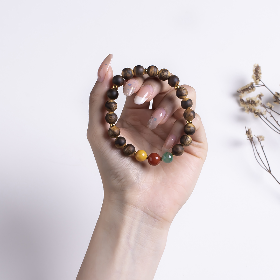 xy0541虎斑纹沉香+南红蜜蜡手串.银,天然沉香约8.4mm,特色虎斑料子,原色原味,香味自然清甜,红绿黄经典三色搭配,吉祥富贵,上手优雅有特色。