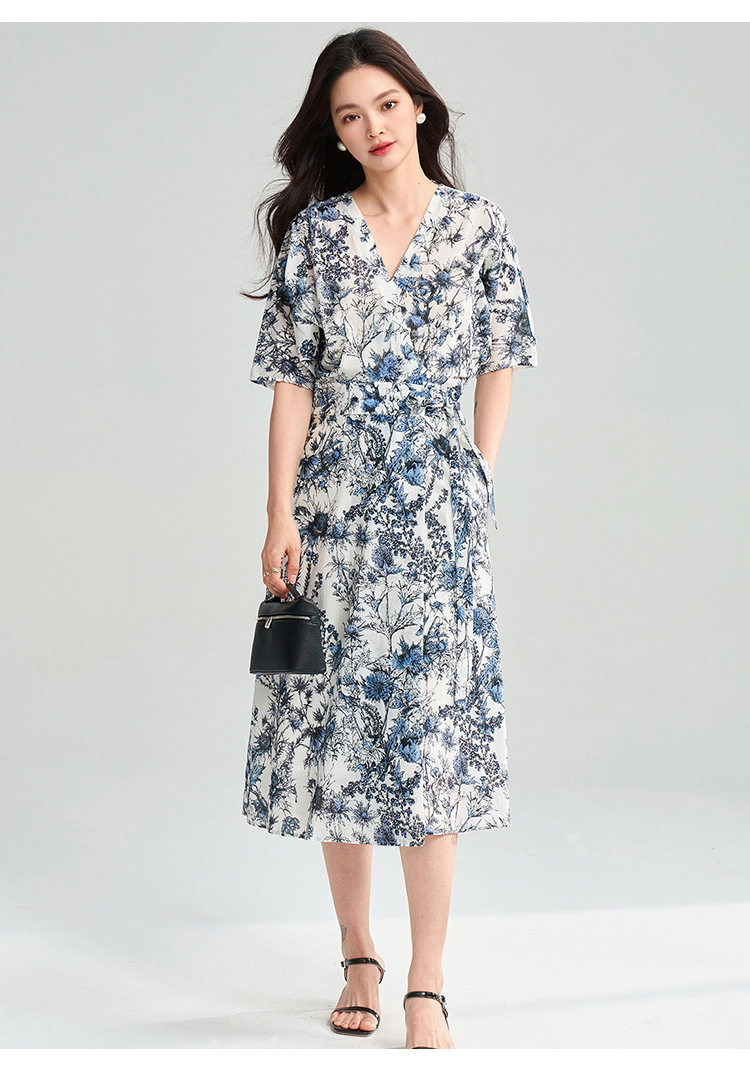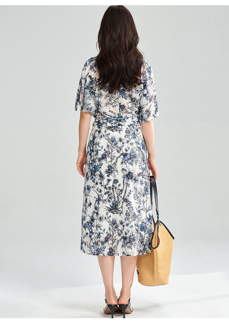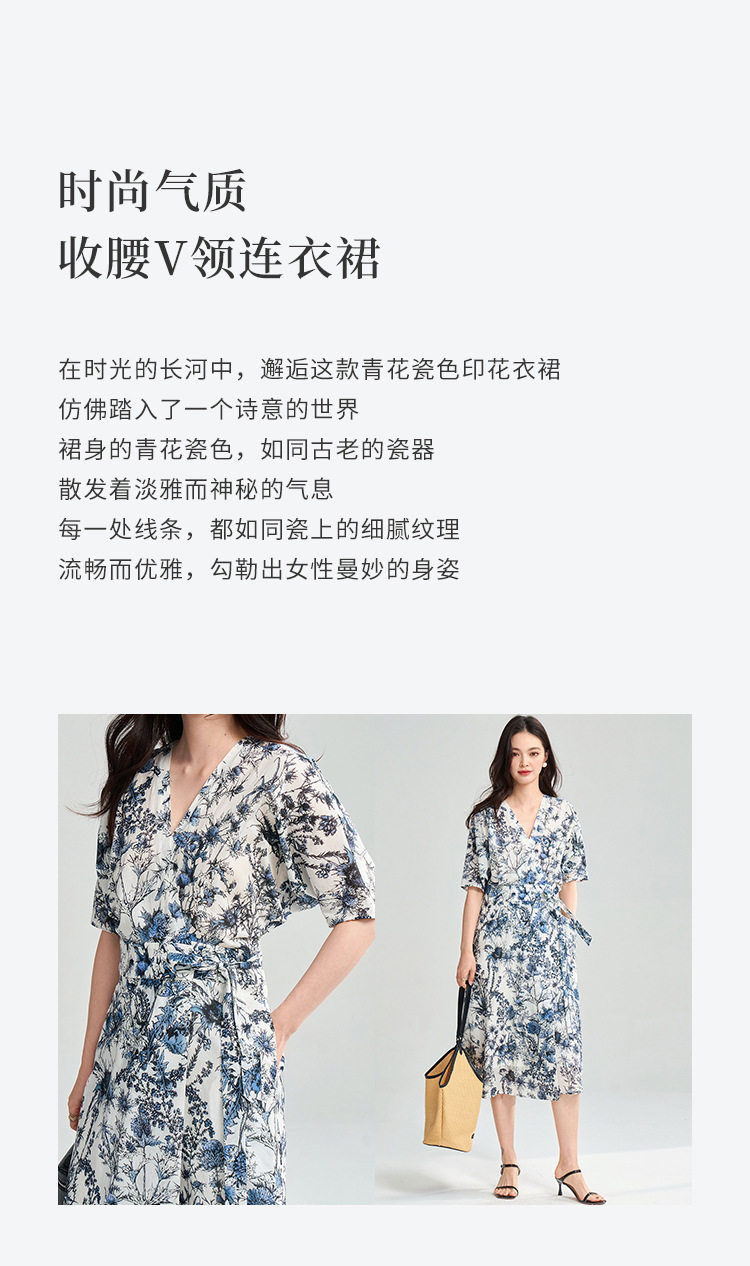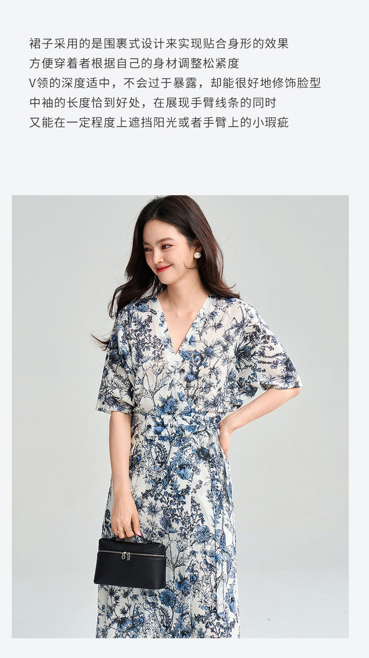 25夏季诗意水墨青花瓷蓝色印花茶歇裙收腰一片式围裹连衣裙25089