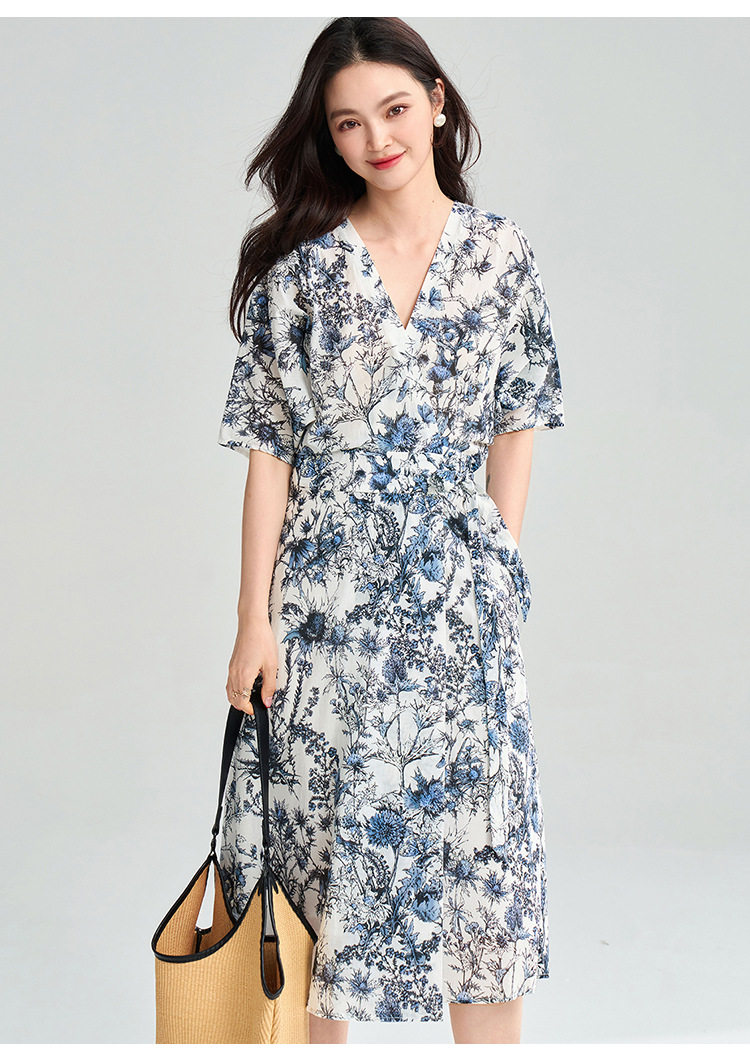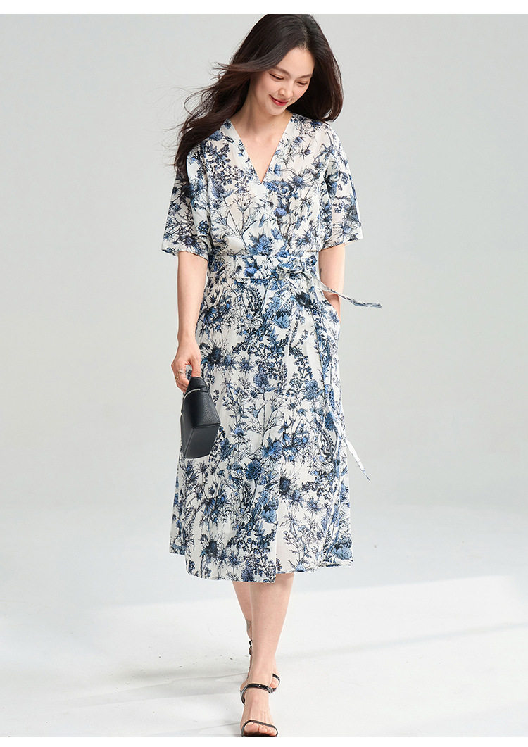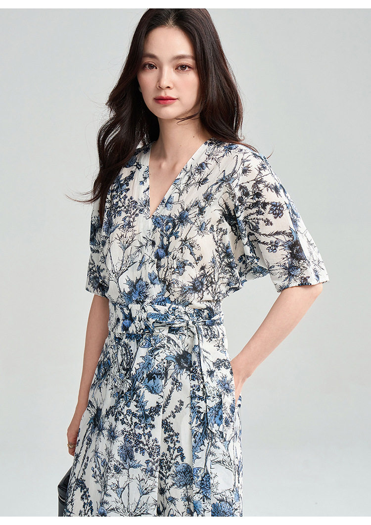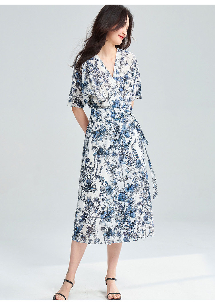 25夏季诗意水墨青花瓷蓝色印花茶歇裙收腰一片式围裹连衣裙25089