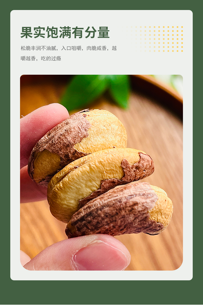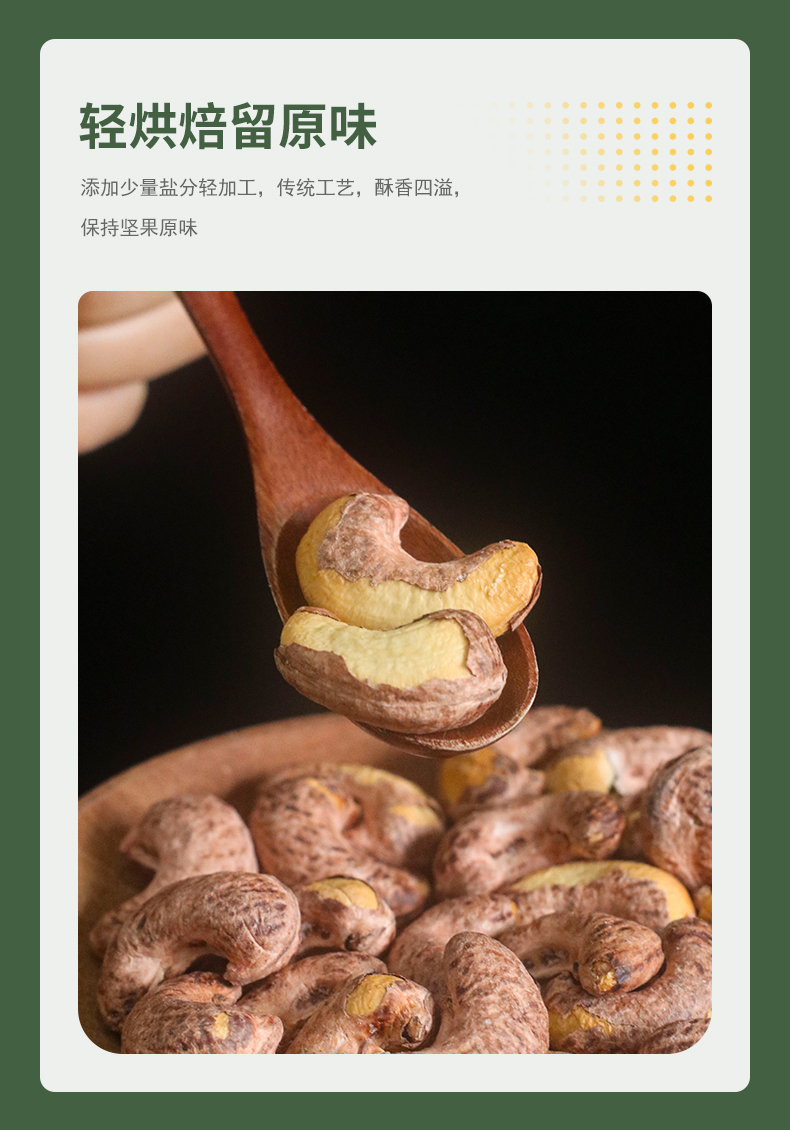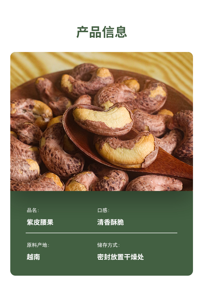 【紫皮腰果】原料产自东南亚的越南,轻烘焙留原味,添加少量盐分轻加工,酥香四溢,保留坚果原味