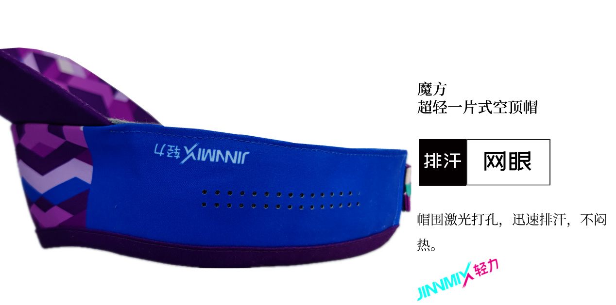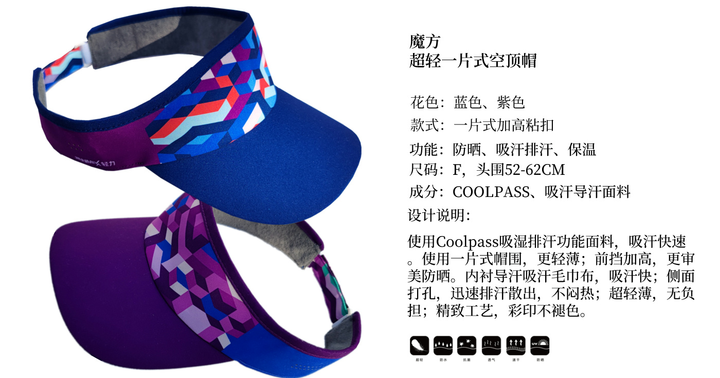 使用Coolpass吸湿排汗功能面料,吸汗快速。使用一片式帽围,更轻薄;前挡加高,更审美防晒。内衬导汗吸汗毛巾布,吸汗快;侧面打孔,迅速排汗散出,不闷热;超轻薄,无负担;精致工艺,彩印不褪色。