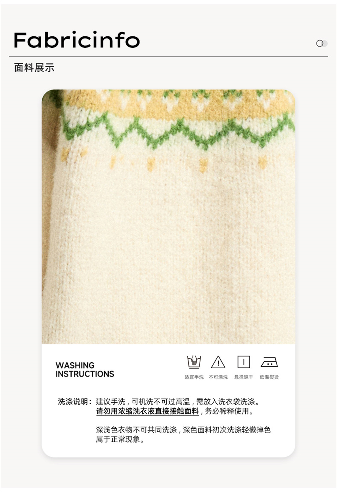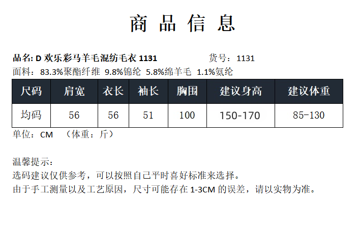 | 售后标准 | (1)质量问题,运费承担 (2)7天无理由退换货的标准:需拍吊牌完整图片,不影响第二次销售的商品; (3)凡是清洗过的,穿过起球的一律不受理售后 羊毛衫一定会起球,对于这点介意的请慎拍; 各尺寸如果与详情标注有1-3厘米误差,属正常范围; 实物颜色如与图片略有色差,也属正常范围。 |