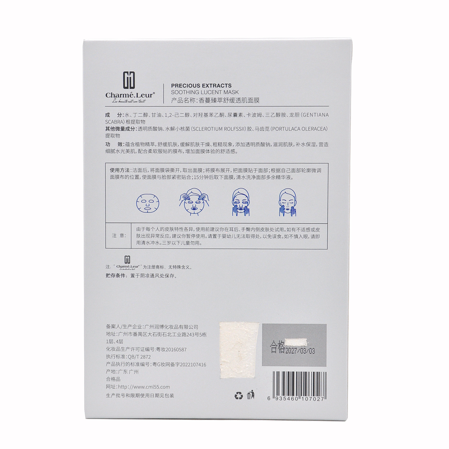 使用方法:洁面后,将面膜袋撕开取出面膜,将膜布展开,把面膜贴于面部,根据自己面部轮廓微调面膜布的位置,使面膜与脸部紧密贴合,15分钟后取下面膜,清水洗净面部多余精华液