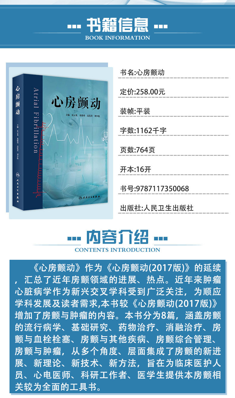 【1】分为八个篇章,包括房颤的流行病学、房颤的基础研究、房颤的药物治疗、房颤的消融治疗、房颤与血栓栓塞、房颤与其他疾病、房颤综合管理、房颤与肿瘤。涵盖了房颤相关的所有领域。【2】每一篇里的内容先是进行成体系的精练叙述,而后以新观点等为亮点,阐述近年房颤领域的最新进展,每个题目均为房颤方面关注度最高的方面。【3】内容广泛、深入,能涵盖目前临床房颤相关的各种角度层面。【4】,近年来肿瘤心脏病学作为新兴交叉学科受到广泛关注,本书迎合学科发展及读者需求,较《心房颤动(2017版)》增加了房颤与肿瘤。