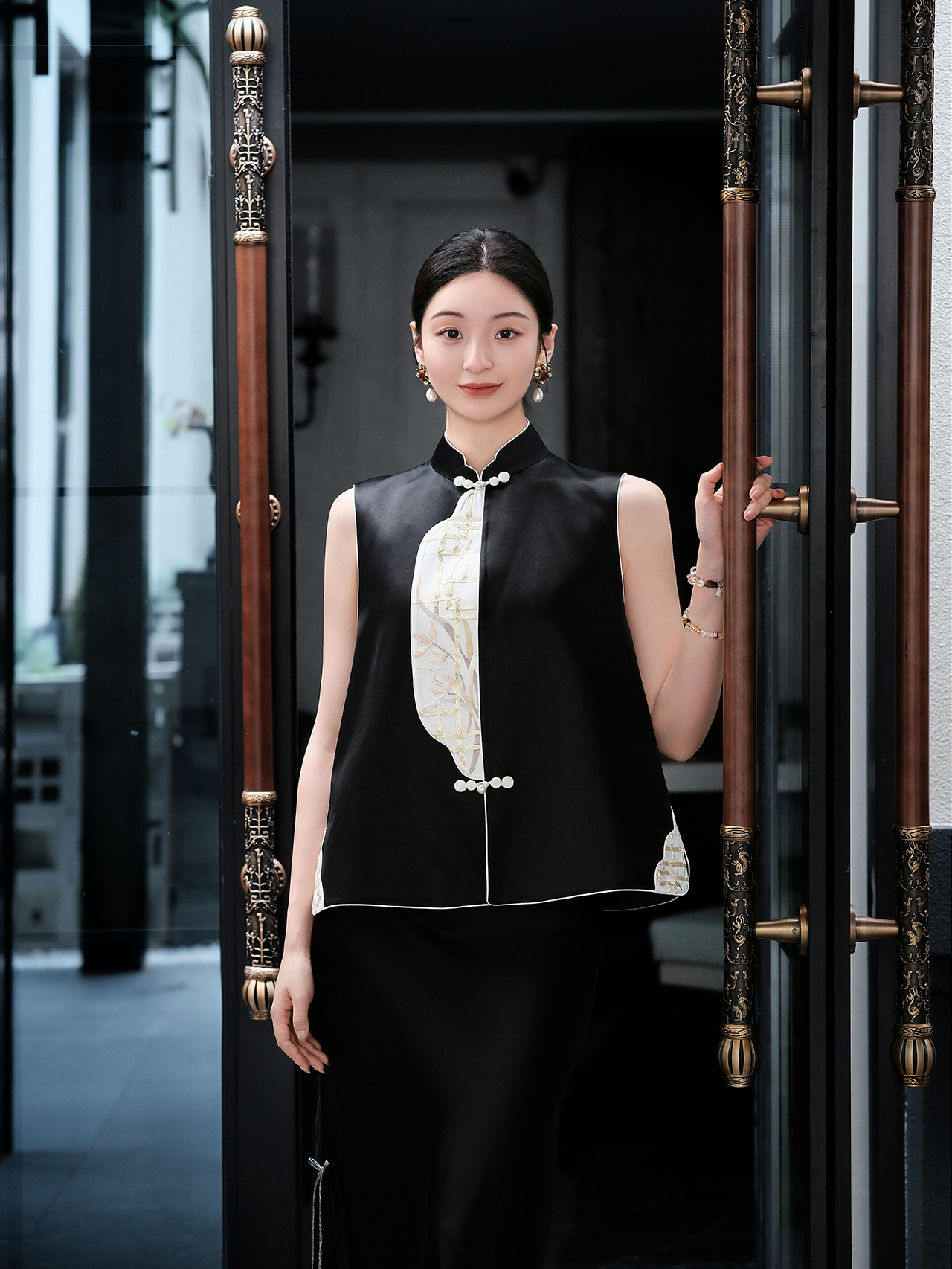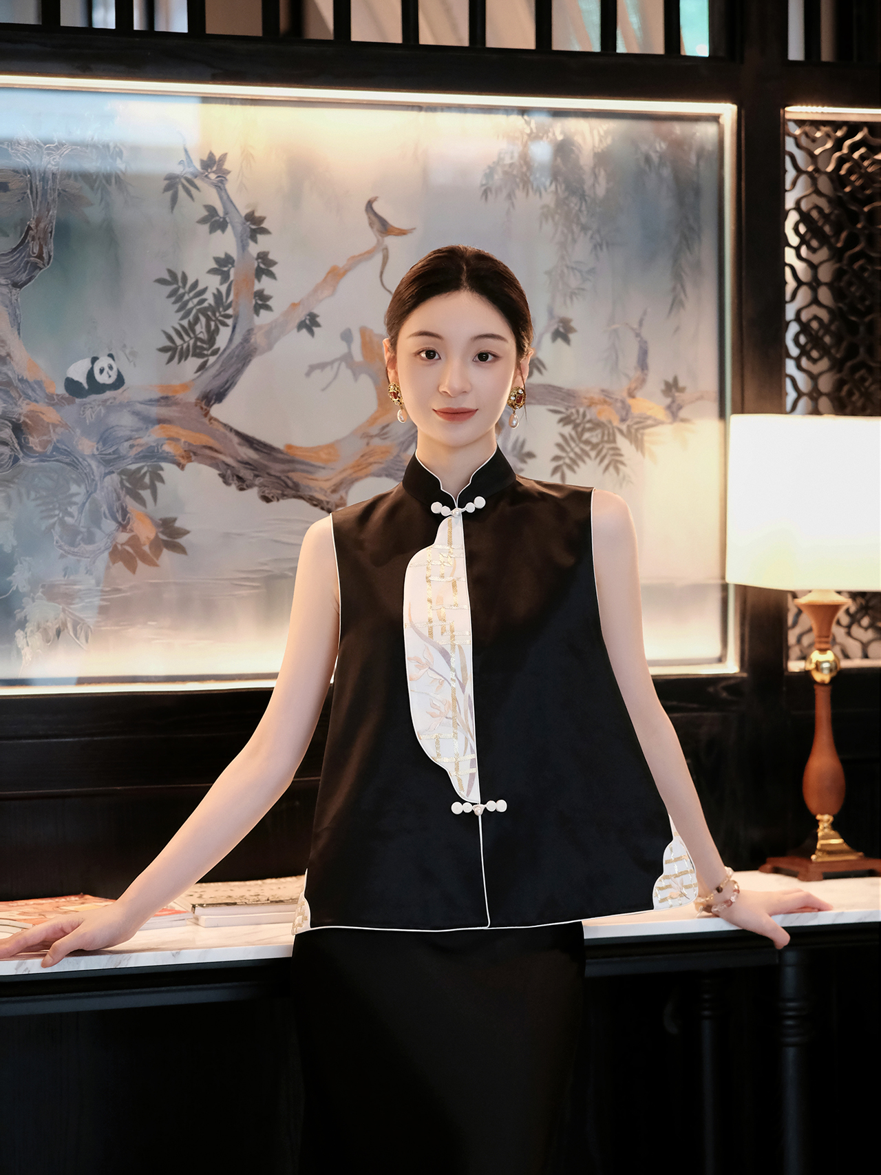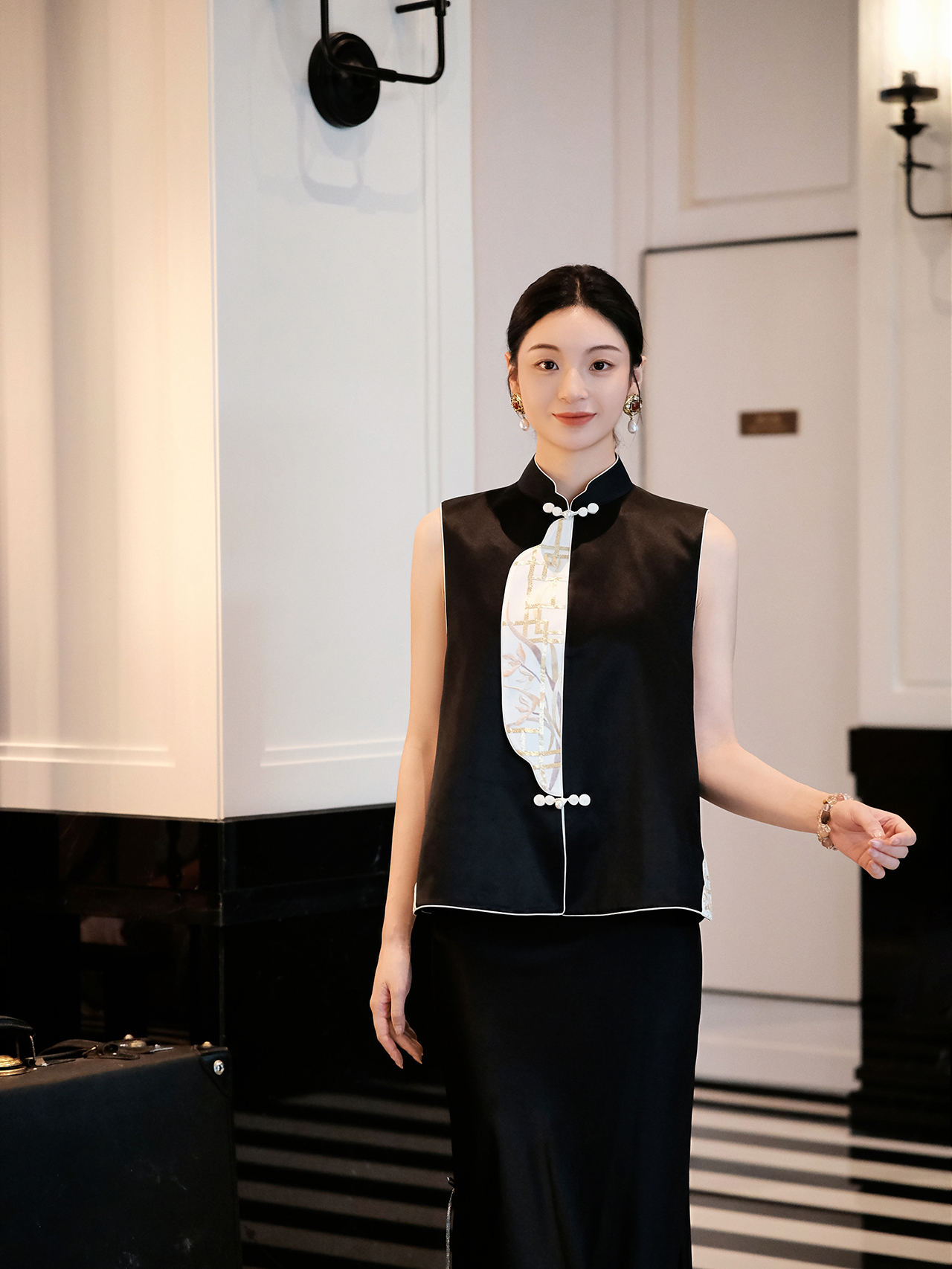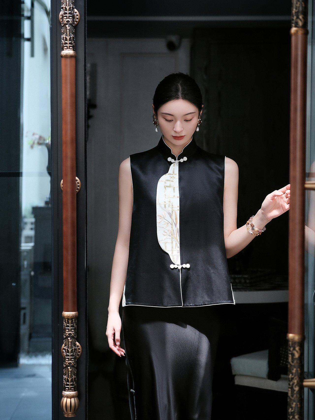 盛唐牡丹大师系列-卢梅红 | 墨轩丝毛手绣偏襟马甲-黑色
