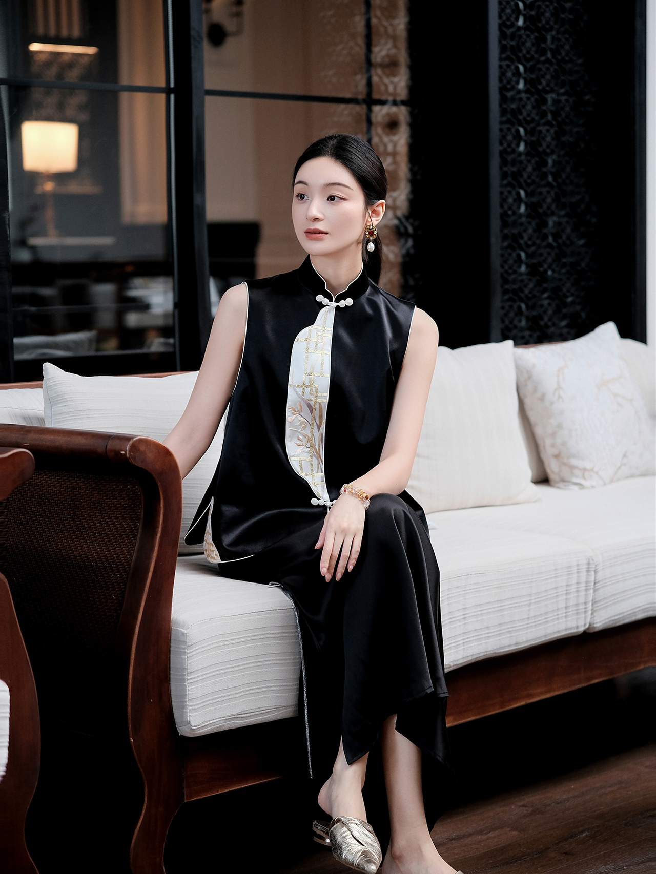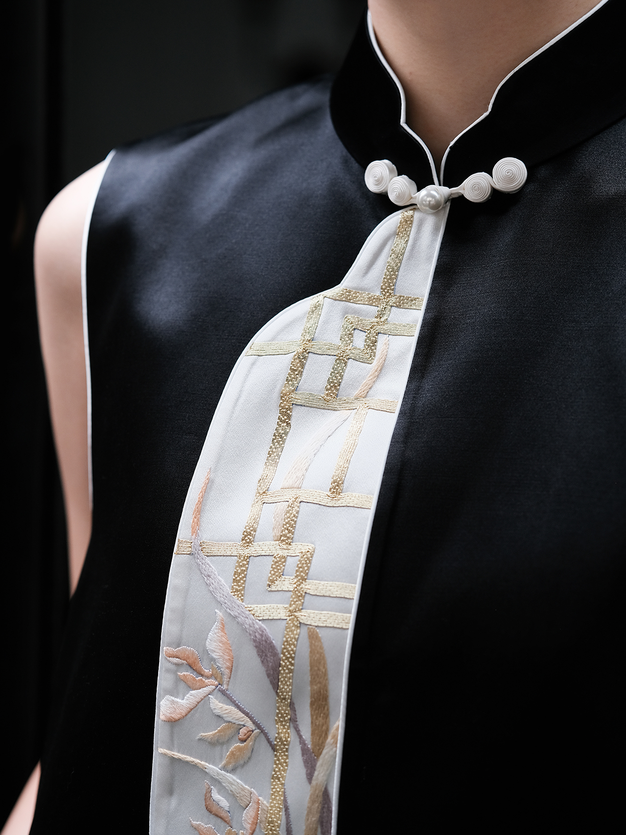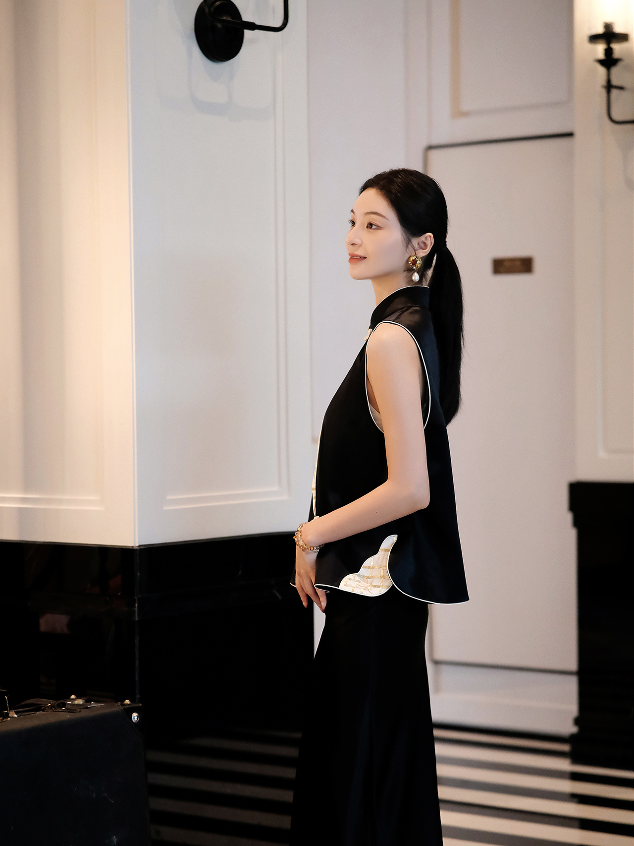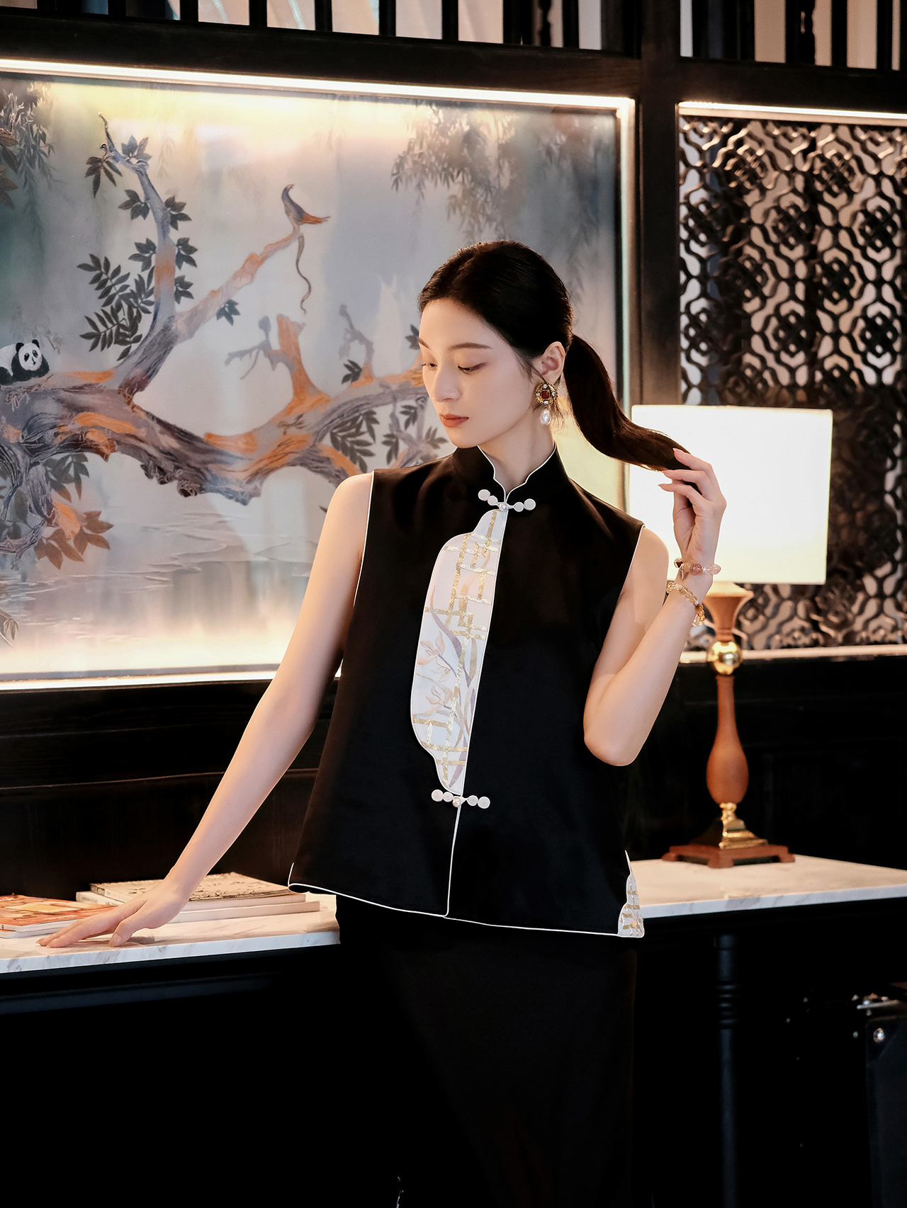 盛唐牡丹大师系列-卢梅红 | 墨轩丝毛手绣偏襟马甲-黑色