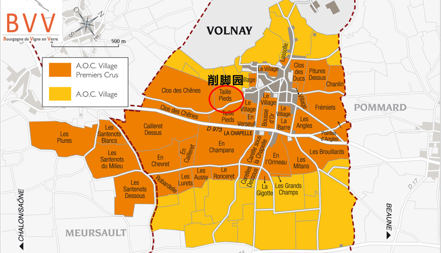 “削脚园”沃尔内著名的一级园之列,坚硬的侏罗纪石灰岩基岩,东南坡中部,葡萄获得阳光充分成熟。土壤非常贫瘠,有时有干旱情况。