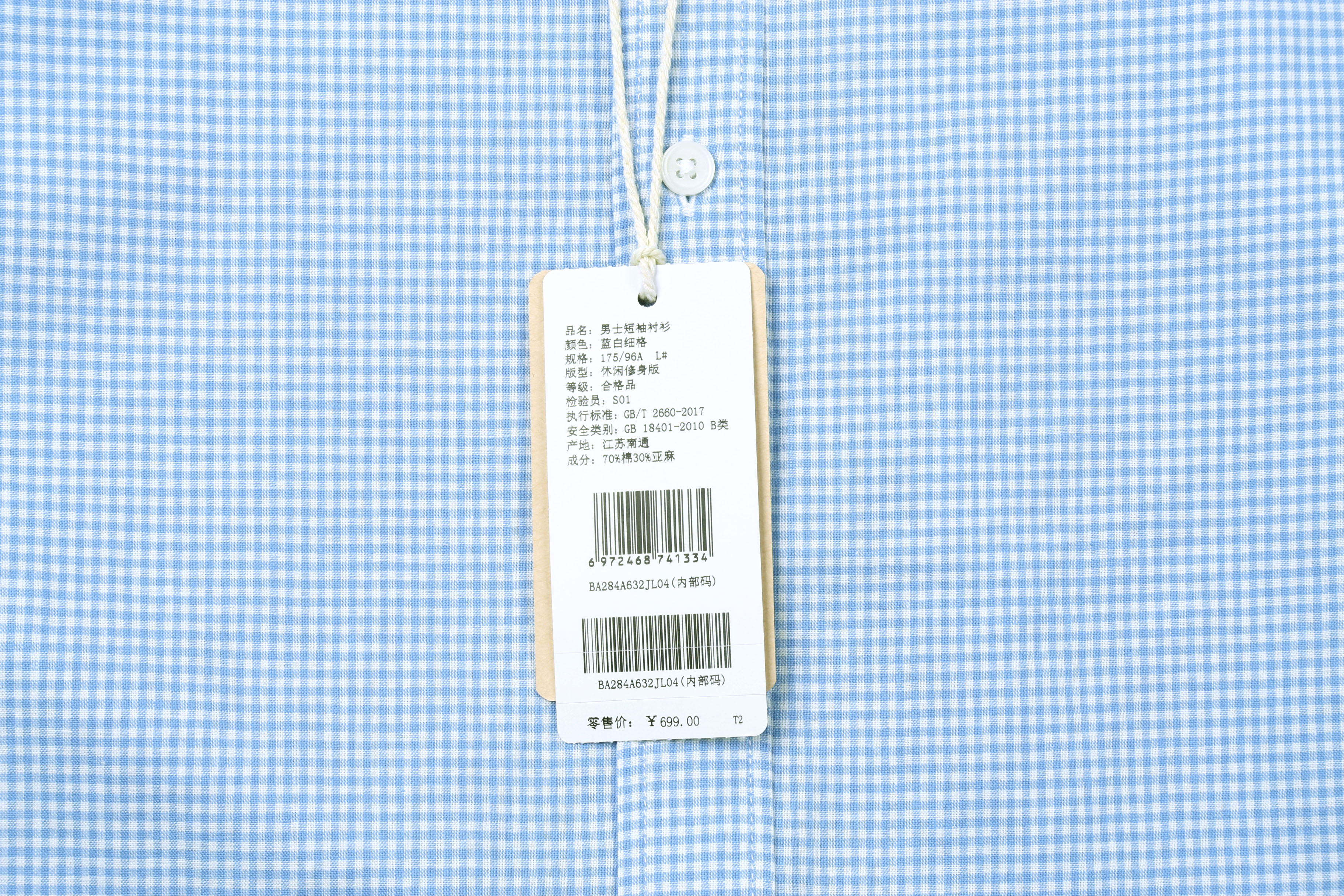 【专柜正品】占姆士男士短袖麻棉薄款格纹条纹男士夏季休闲中青年衬衣