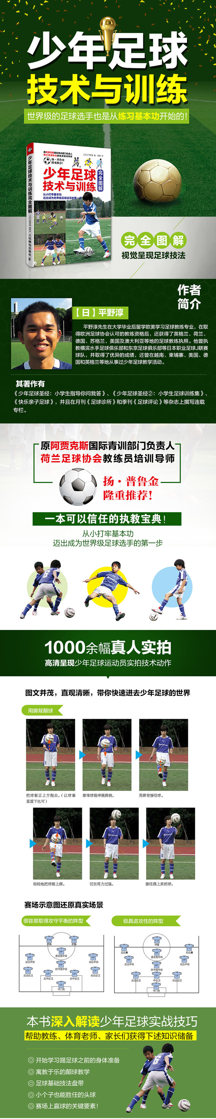 平野淳 平野淳先生在大学毕业后留学欧美学习足球教练专业,在取得欧洲足球协会认可的教练资格后,还获得了英格兰、荷兰、德国、苏格兰、美国及澳大利亚等地的足球教练执照。他曾执教横滨水手足球俱乐部和东京足球俱乐部等日本职业足球J联赛球队,并取得了优异的成绩,还曾在越南、柬埔寨、美国、德国和英格兰等地从事过少年足球教学活动。现在他作为FUNROOTS股份有限公司的法人,开展了一系列的儿童足球计划。其著作有《少年足球圣经:小学生指导你问我答》、《少年足球圣经②:小学生足球训练集》、《快乐亲子足球》,并且在月刊《足球诊所》和季刊《足球评论》等杂志上撰写连载专栏。