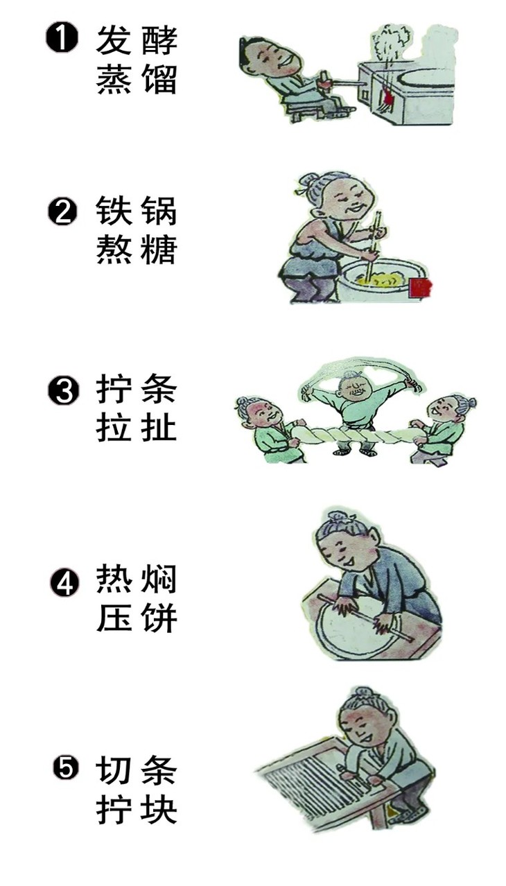 琼锅糖采用井水与小米蒸馏,与大麦芽搅拌发酵淋汁,用铁锅熬成糊状"灶糖"取出冷却,再在蒸汽加热中反复拧条拉扯,使糖色由黄变白如琼。然后与炒熟的黑芝麻/白芝麻与其他辅料分层置于瓷缸内热焖,最后混压成饼,切成条或片,既成香味醇郁的风味食品"琼锅糖"。