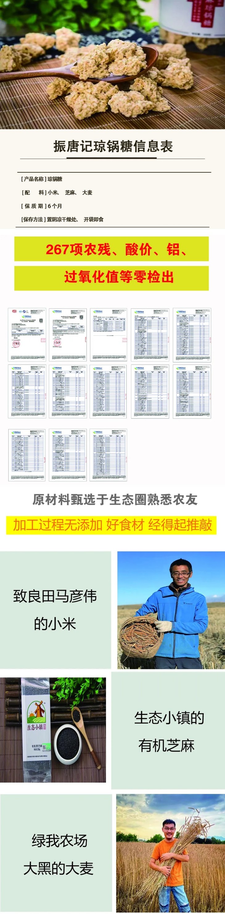 规格:琼锅糖(黑芝麻味)140g/袋 琼锅糖(白芝麻味)140g/袋 配料:小米、芝麻、大麦 生产者: 张振 产地: 河北唐山 保质期: 6个月 生产日期: 见包装 储存方式:阴凉干燥处储存 食用方式: 开袋即食 生产方式:2016年开始返乡创业,期间一直坚持制作无添加的唐山特产,直到2022你那开始使用生态花生、有机白砂糖等制作生态花花说呢过块、花生酥、加工过程中不使用任何香精、防腐剂等添加剂。 |