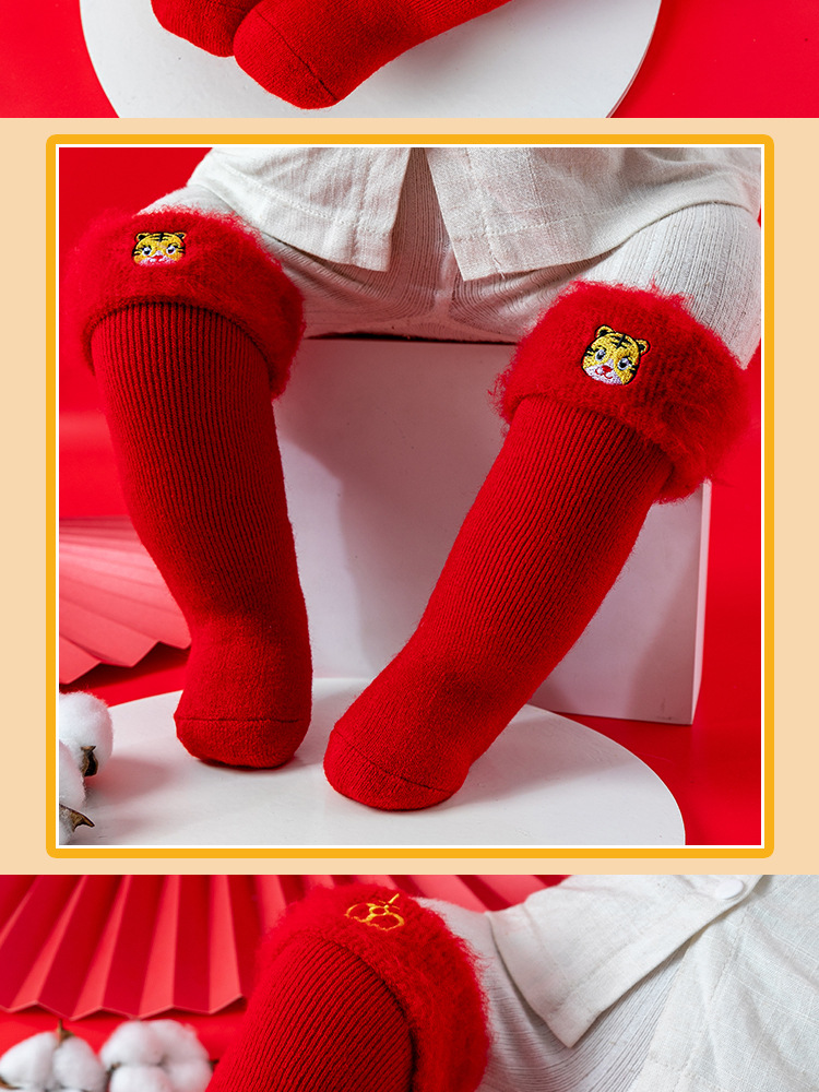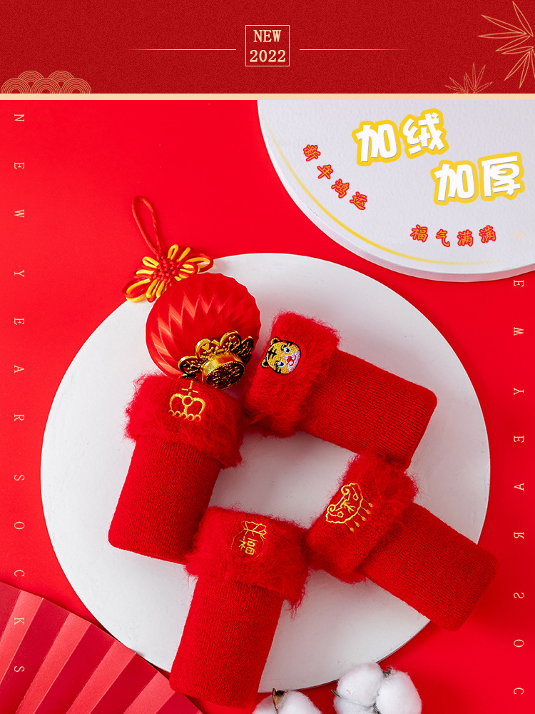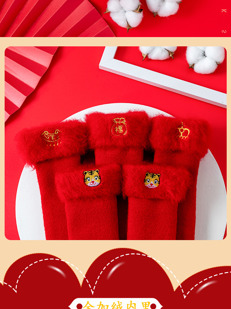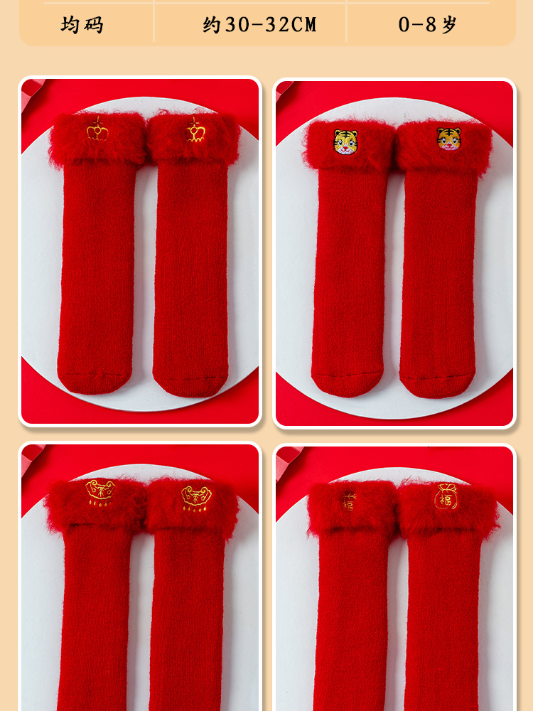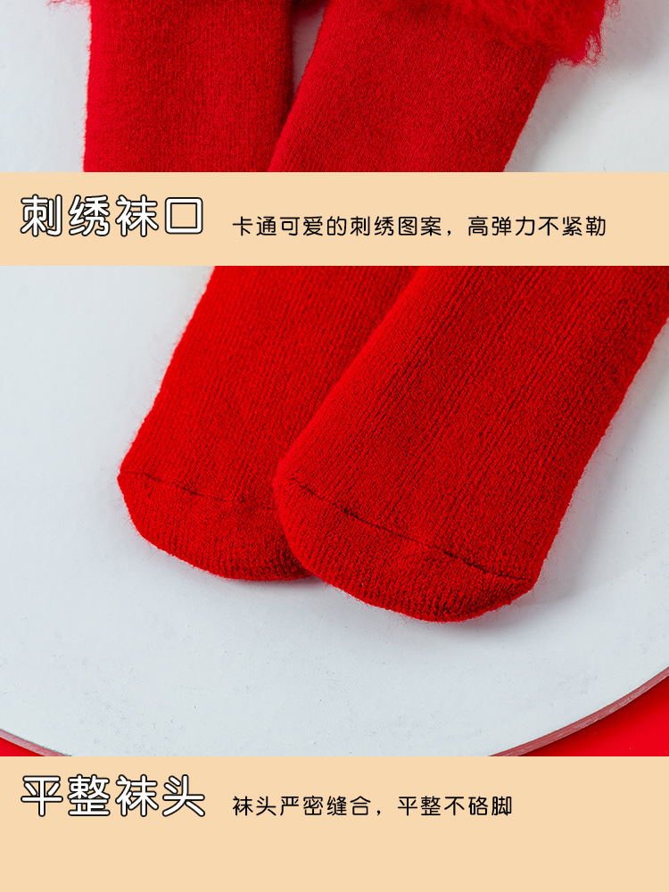 【2双装 360°加绒内里 温暖宝宝小脚丫】A类秋冬加绒加厚儿童袜子男童女童大红袜红色袜子新年刺绣卡通宝宝袜