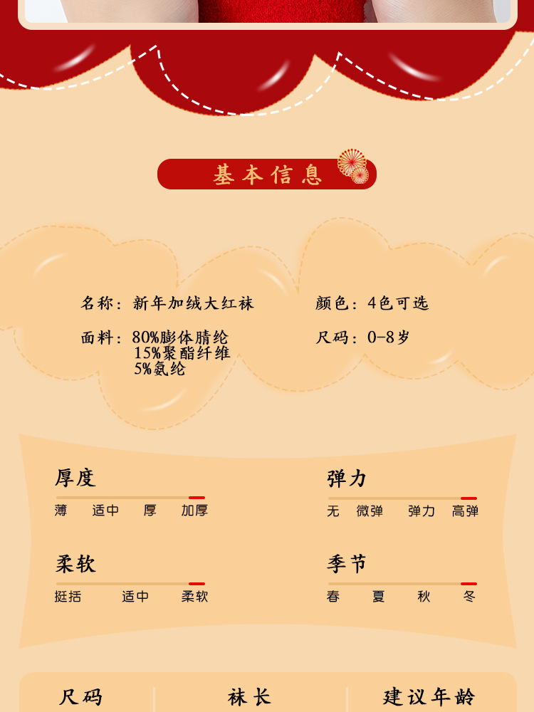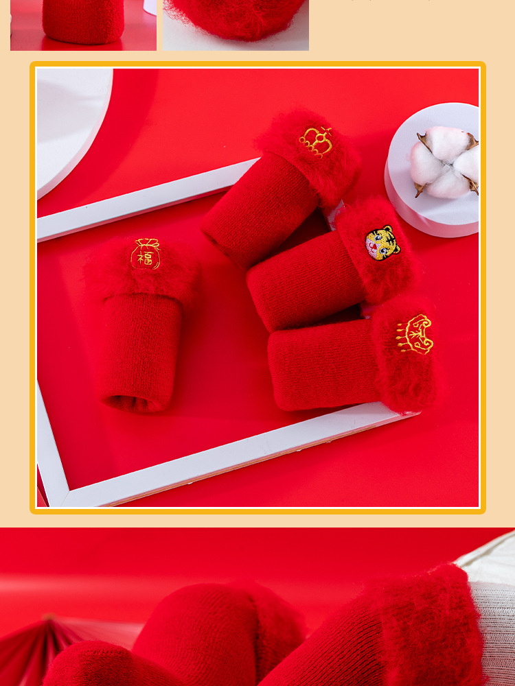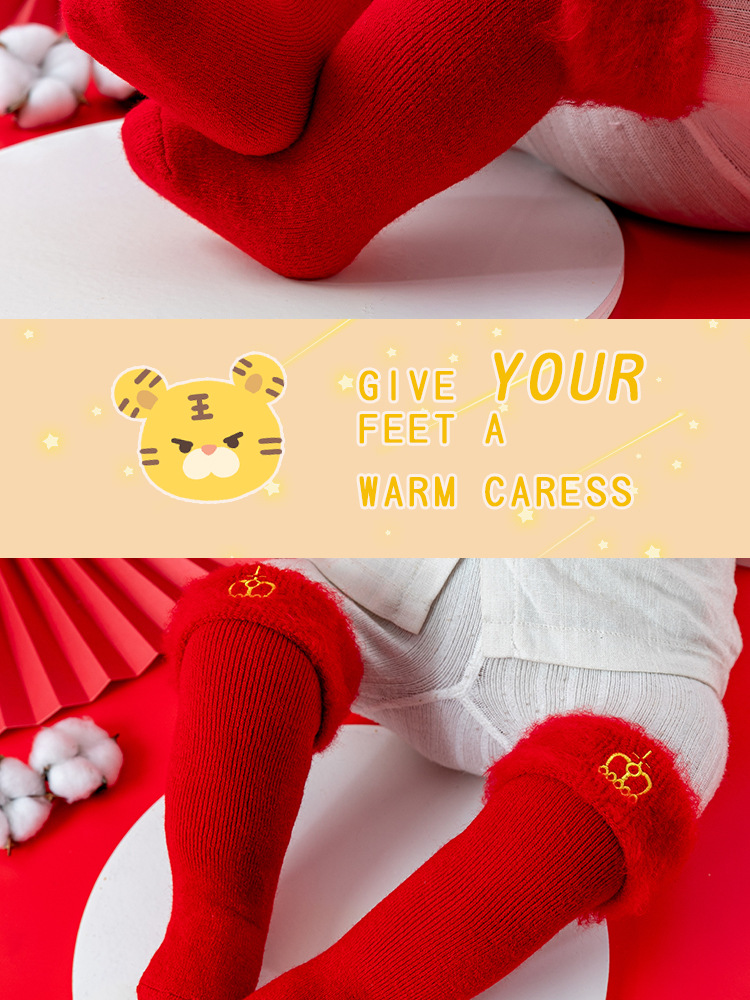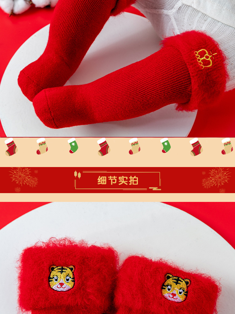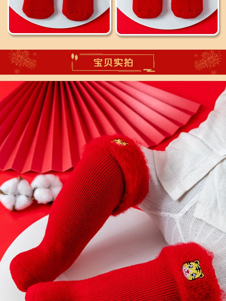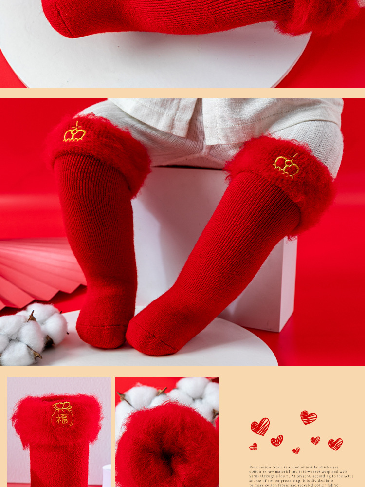 【2双装 360°加绒内里 温暖宝宝小脚丫】A类秋冬加绒加厚儿童袜子男童女童大红袜红色袜子新年刺绣卡通宝宝袜