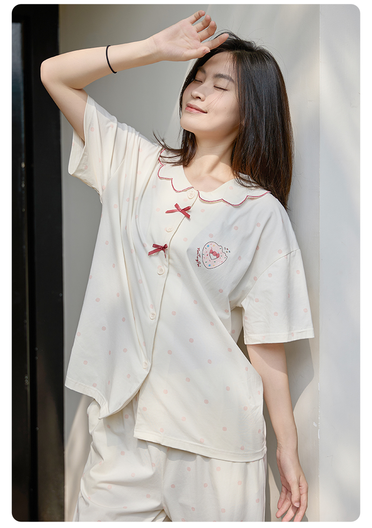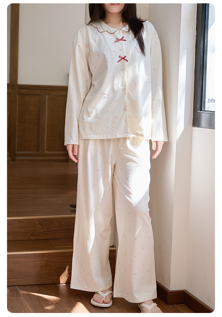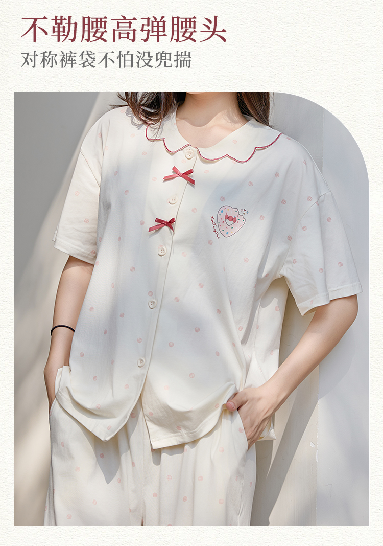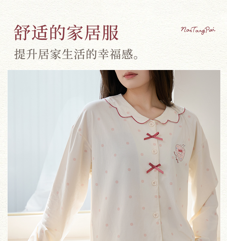 【积分兑换】[樱桃派家居服]春夏睡衣女甜美可爱蝴蝶结韩式波点显瘦套装