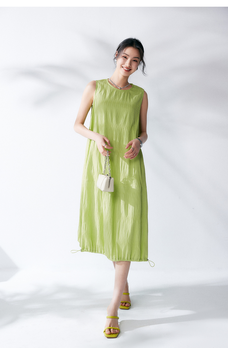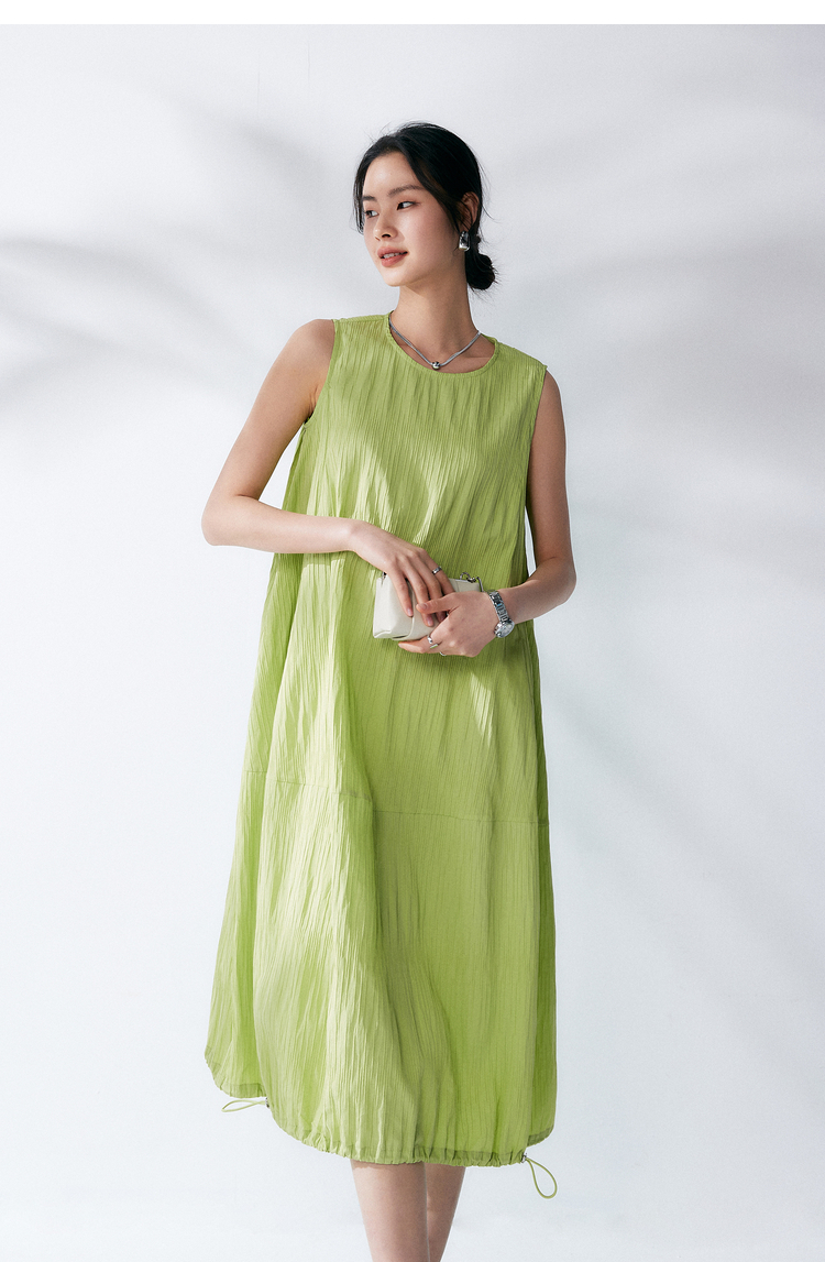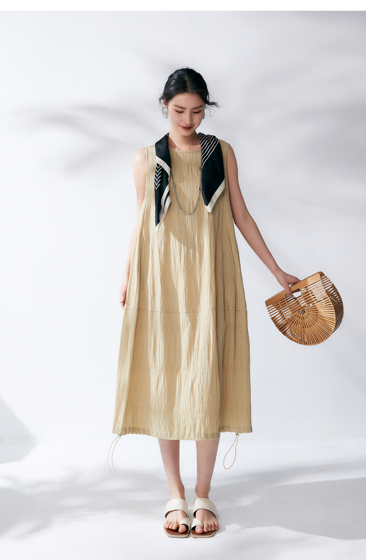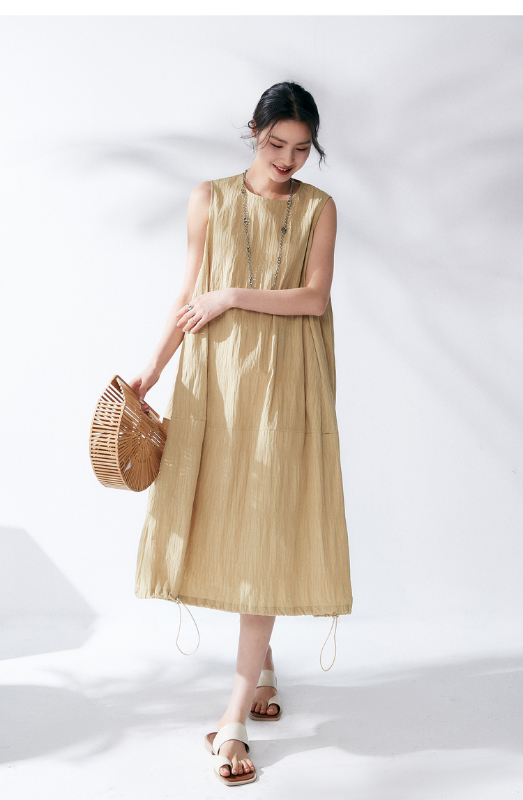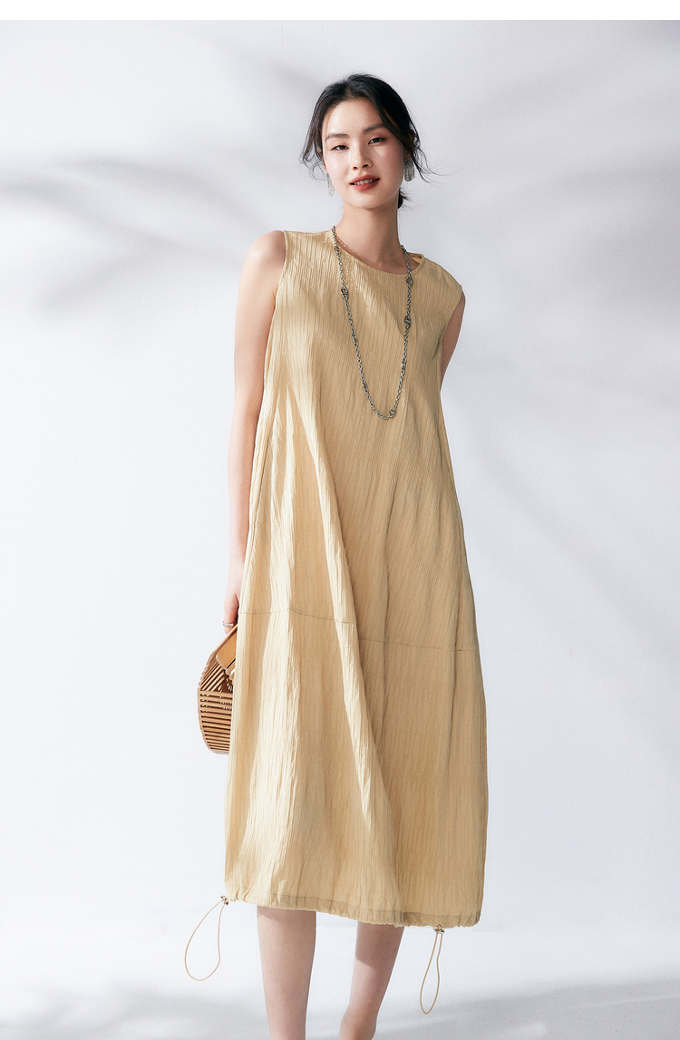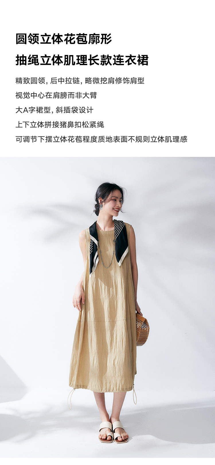 棉仓343616005-圆领立体花苞廓形抽绳立体肌理长款连衣裙