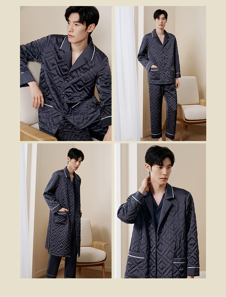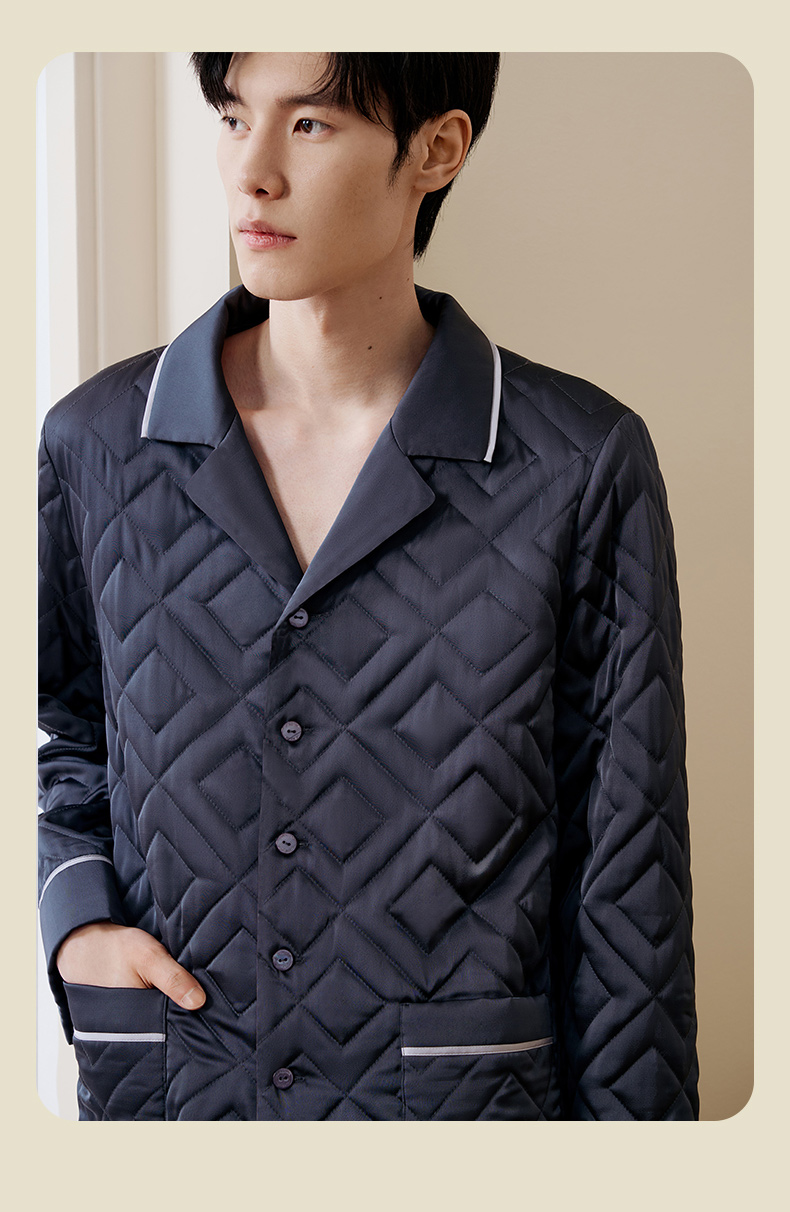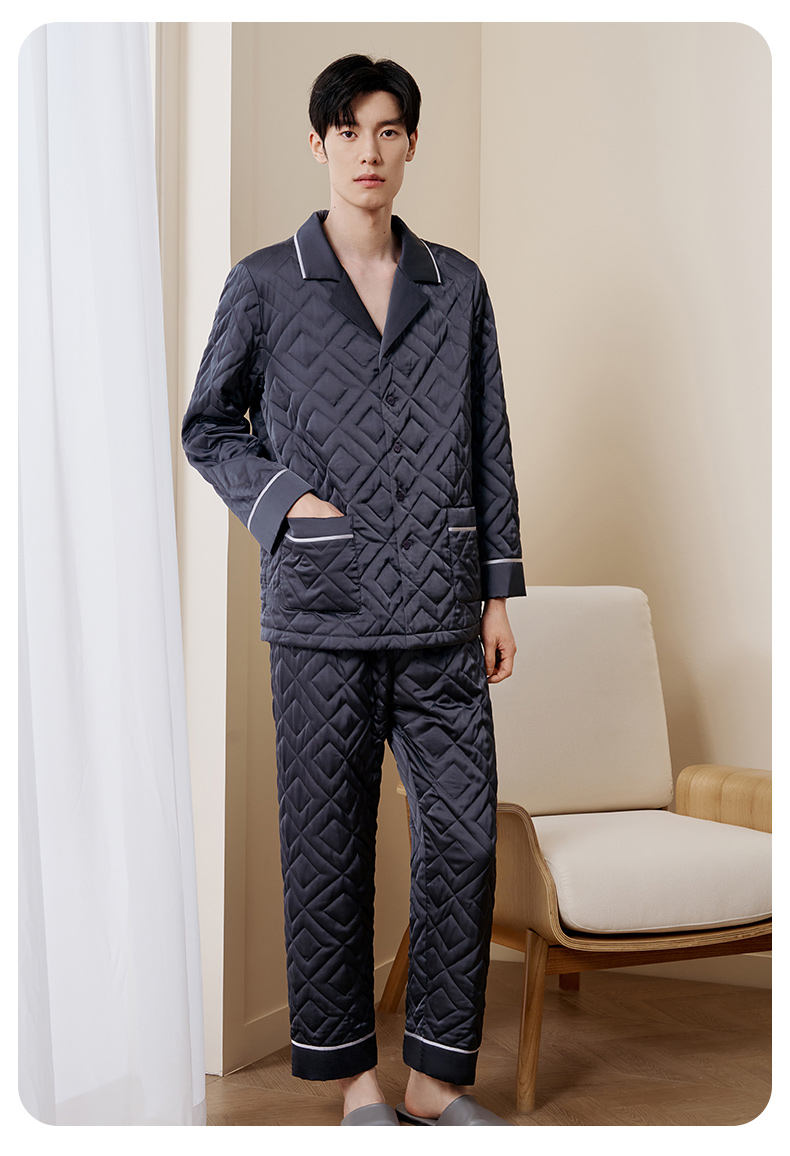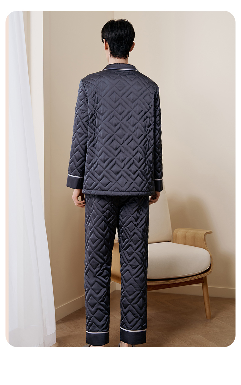 金三塔桑蚕丝简约菱形格纹丝绵睡衣男舒适保暖贴肤衣裤套家居服 YSMFD202