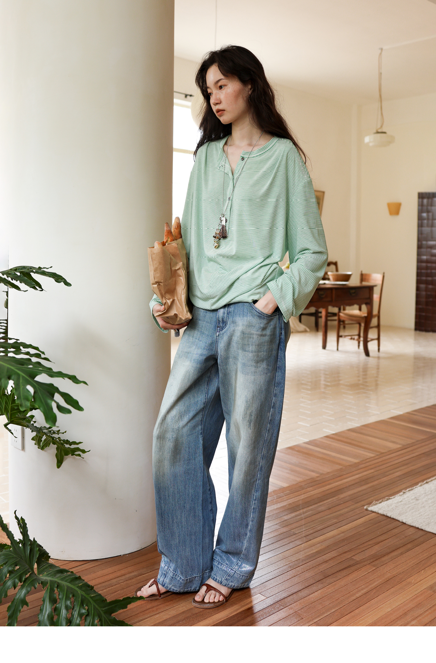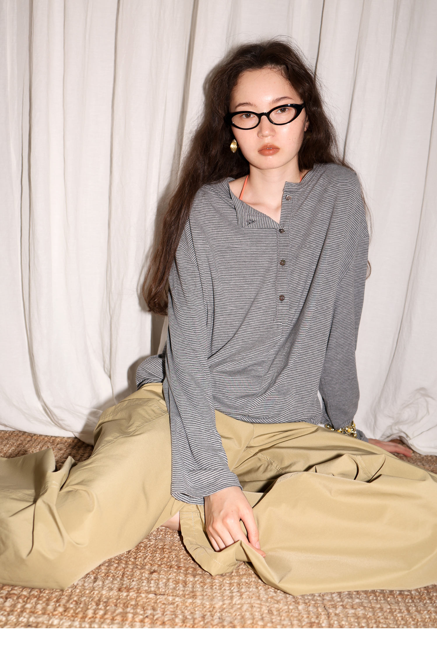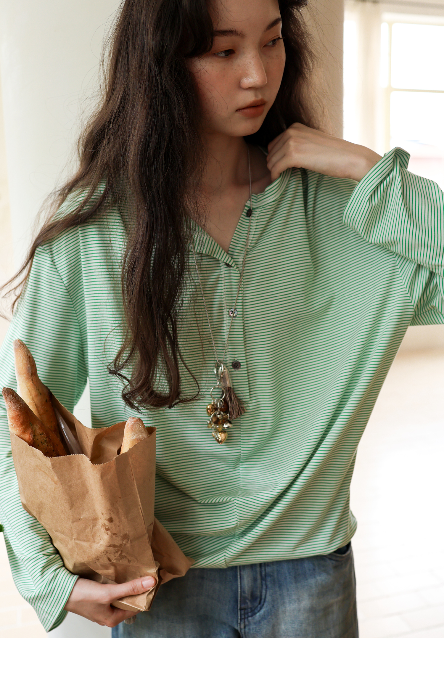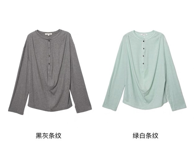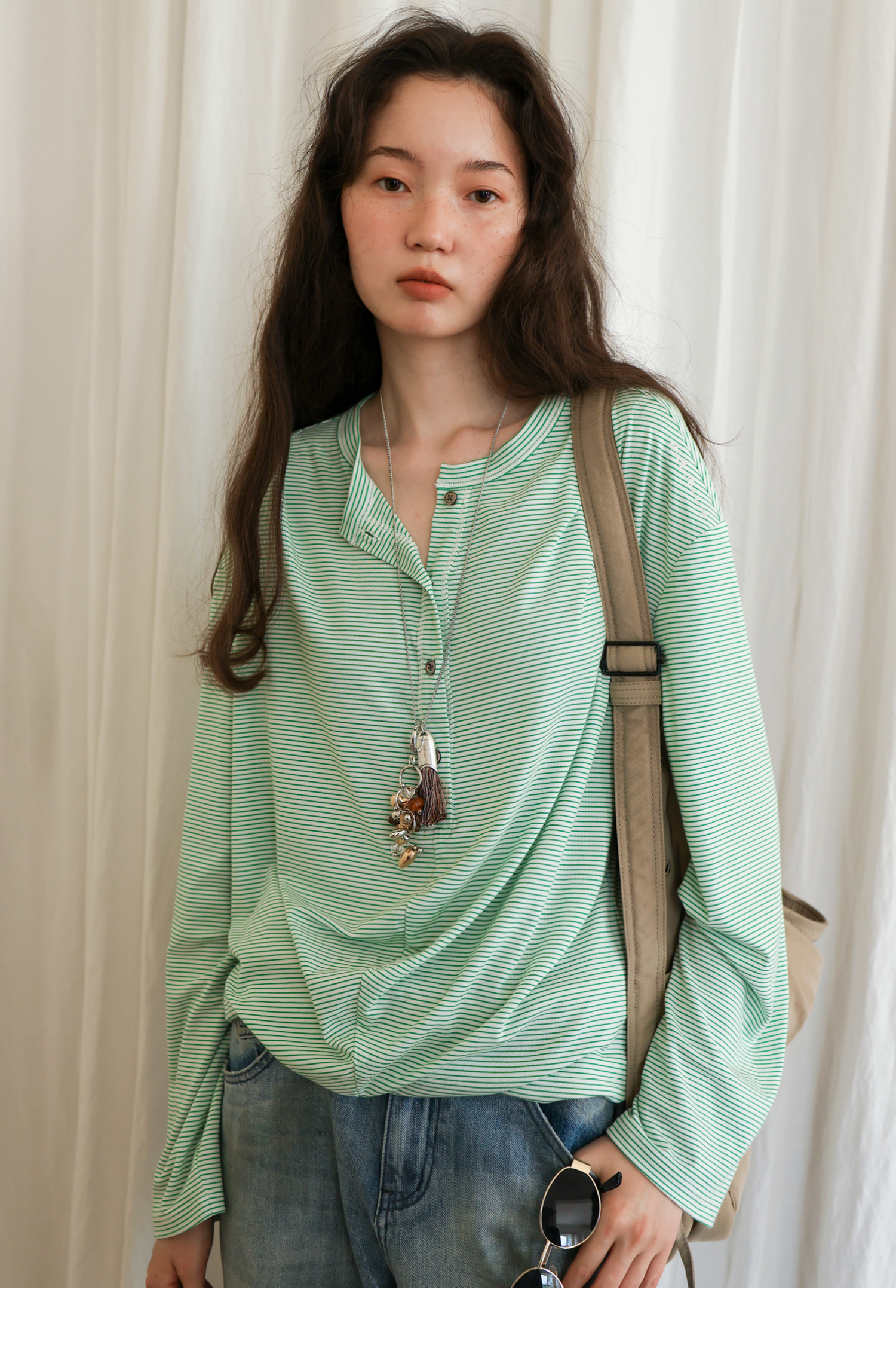 素舶 呼吸感莱塞尔撞色条纹宽松设计感堆褶亨利领长袖罩衫