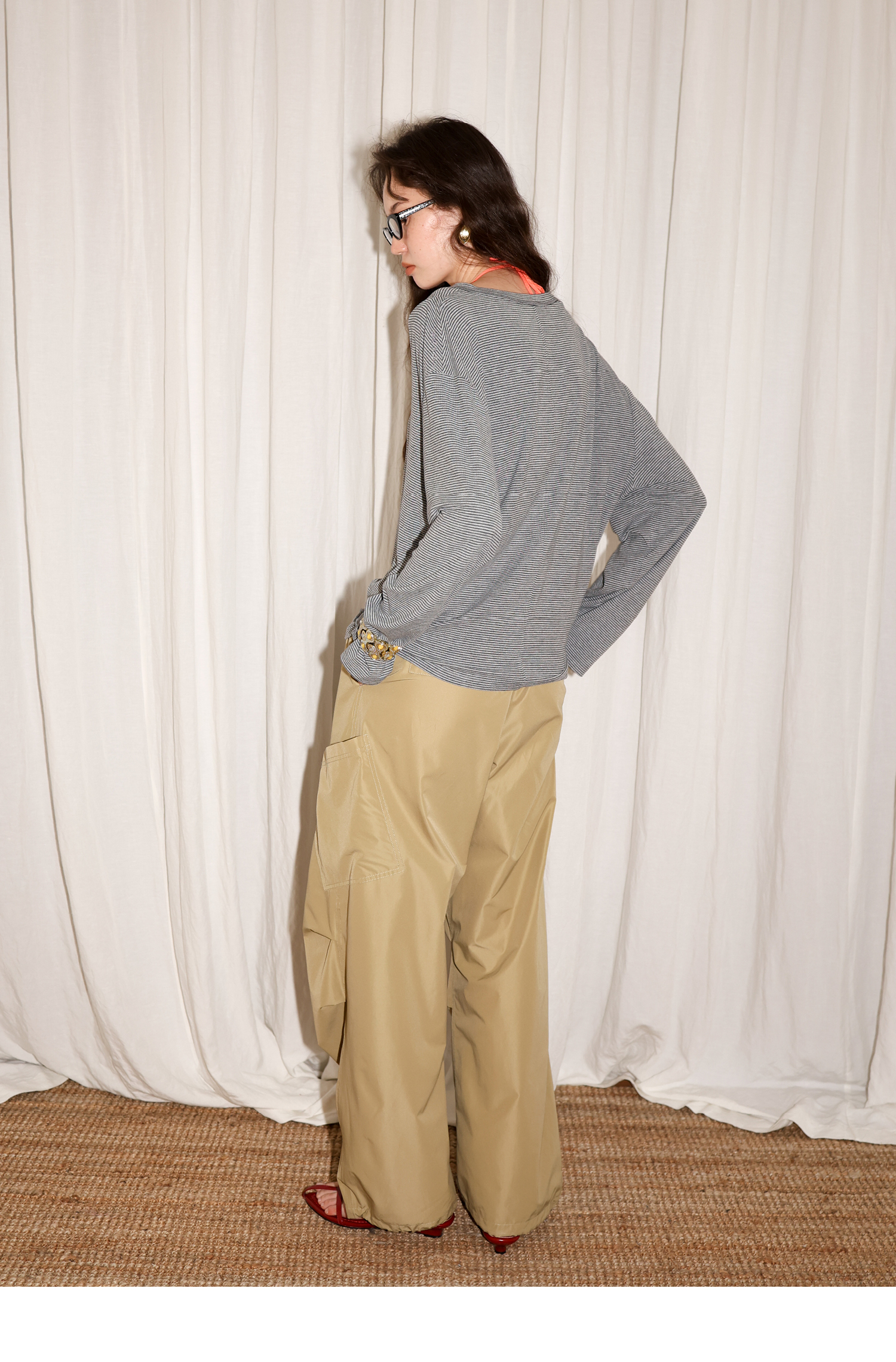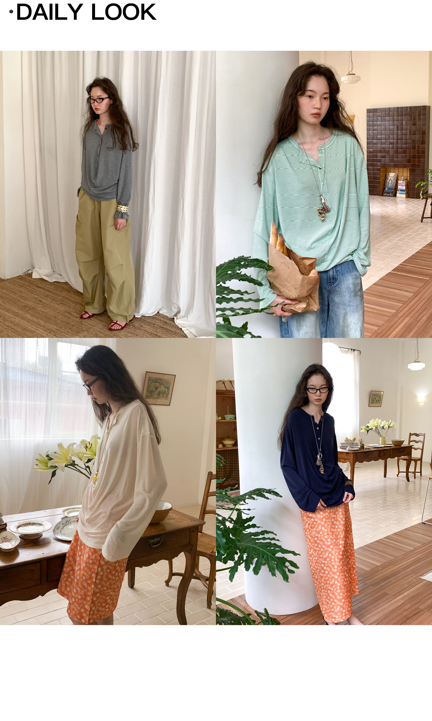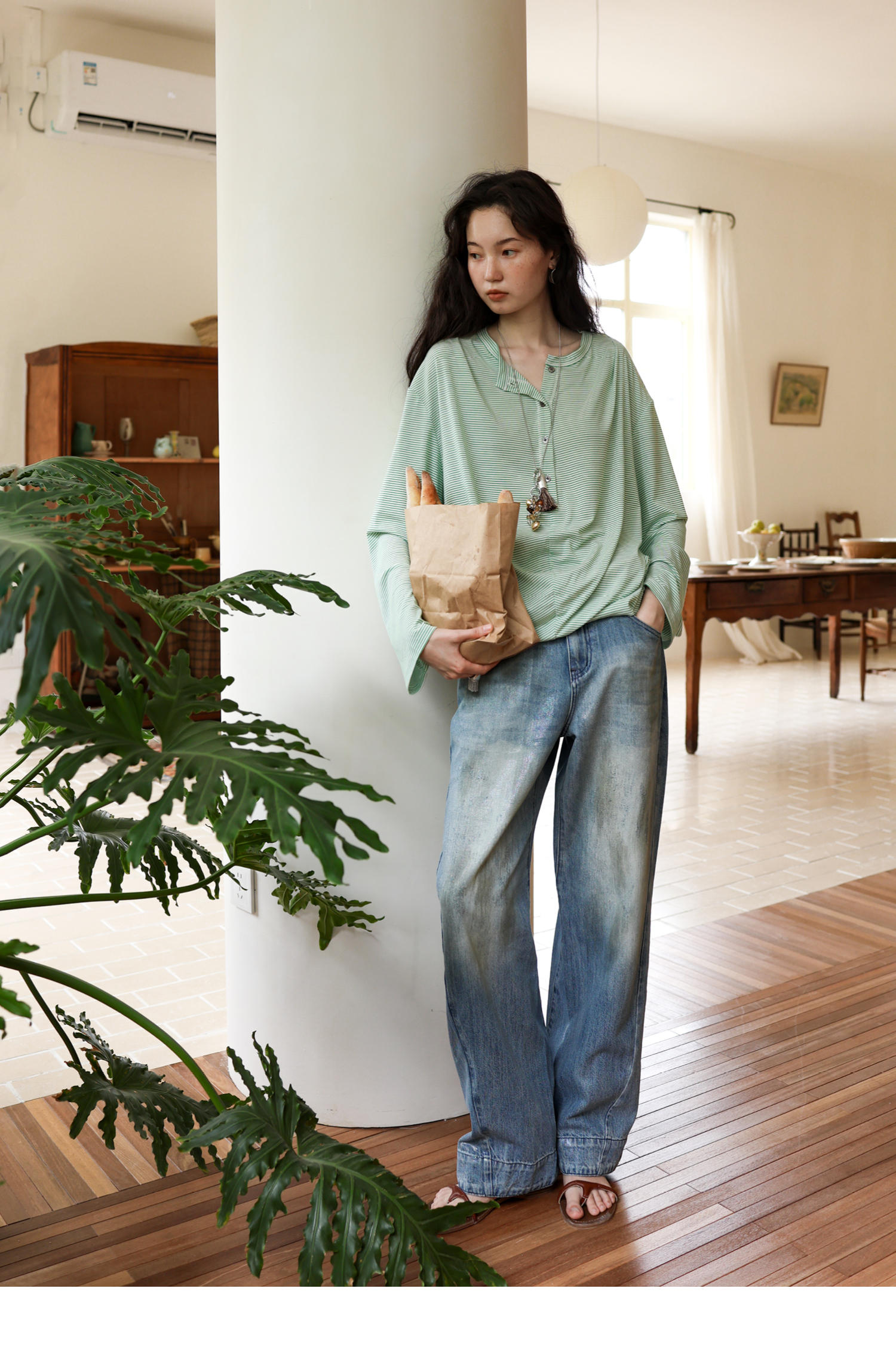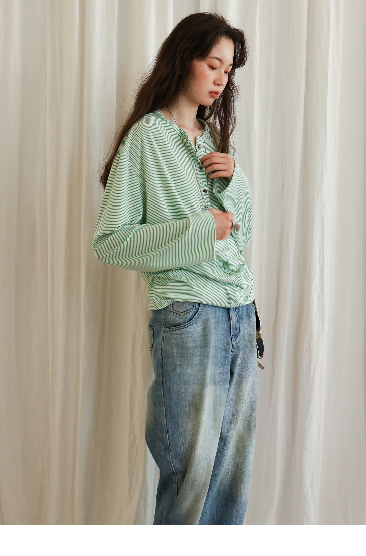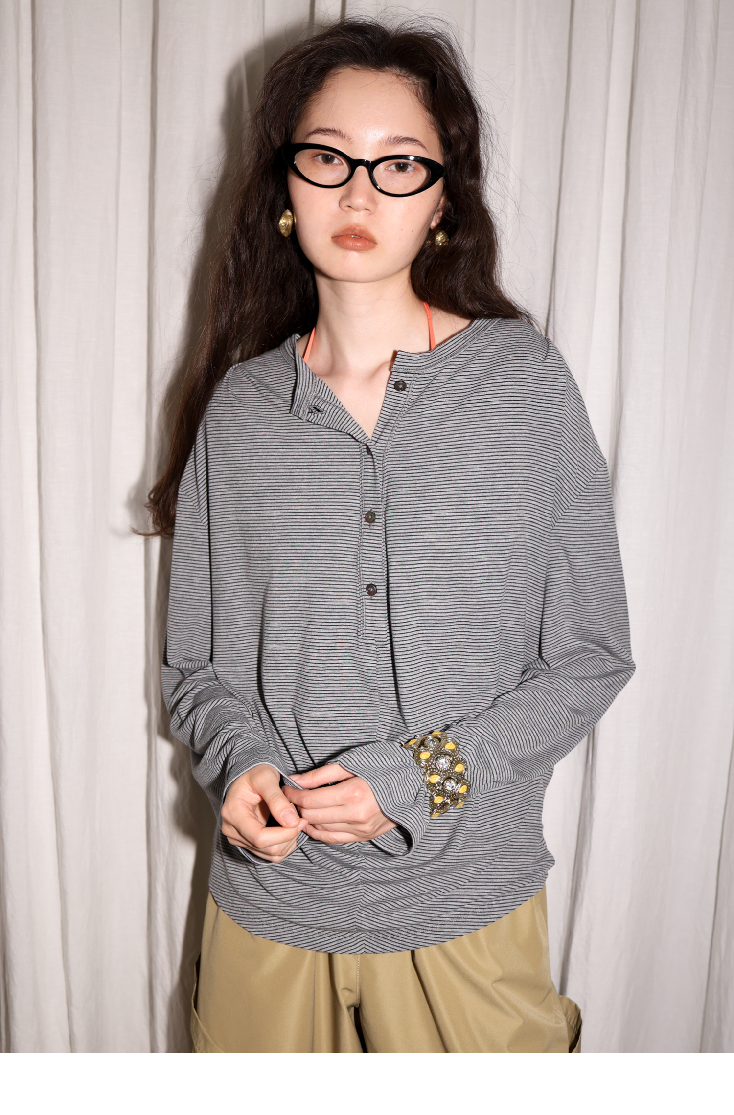 素舶 呼吸感莱塞尔撞色条纹宽松设计感堆褶亨利领长袖罩衫