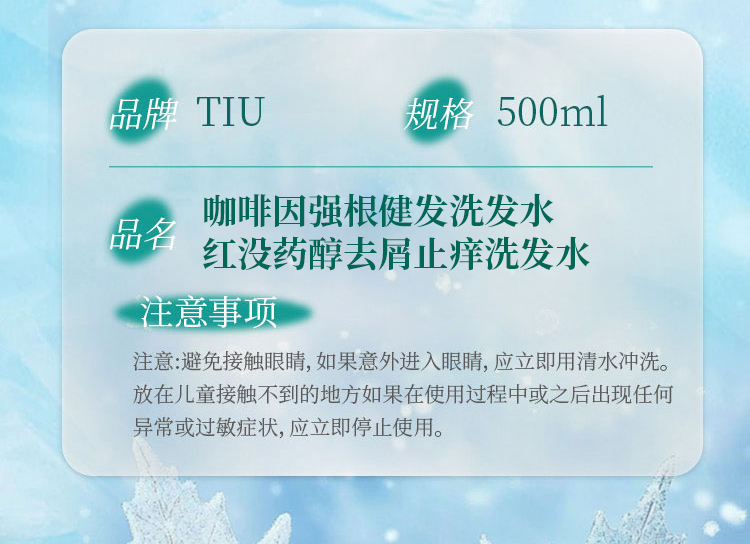【品名】TIU 红没药醇去屑止痒/咖啡因强根健发洗发水 【规格】 红没药醇去屑止痒洗发水500ml/瓶 咖啡因强根健发洗发水500ml/瓶 【备案编号】 红没药醇去屑止痒洗发水:国妆网备进字(粤)2025001111 咖啡因强根健发洗发水:国妆网备进字(粤)2025001097 【产地】加拿大 【保质期】5年 【发货包装】独立包装 【发货地】广州、武汉随机发 【发货快递】韵达、中通、申通随机发 【不发货区域】新疆、西藏、港澳台 【补邮费地区】内蒙古、宁夏、甘肃、青海、海南+8元 【发货时效】48-72小时,周末节假日顺延 |