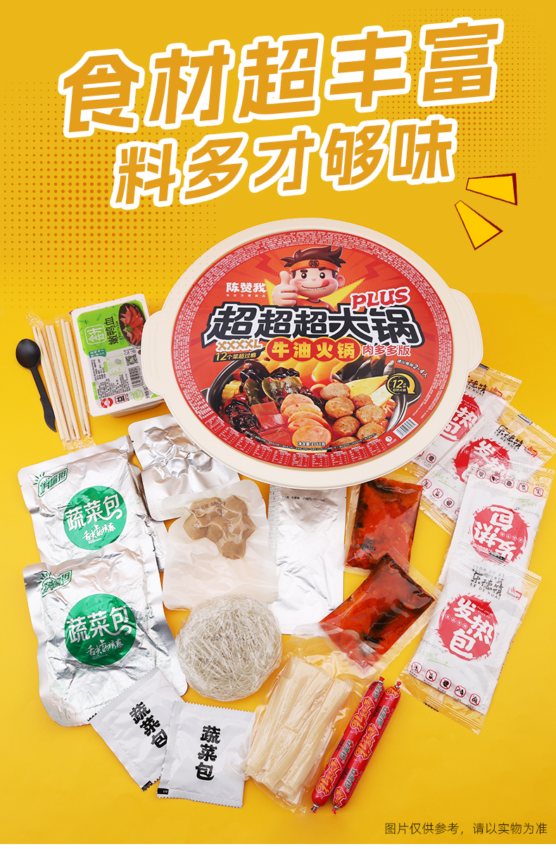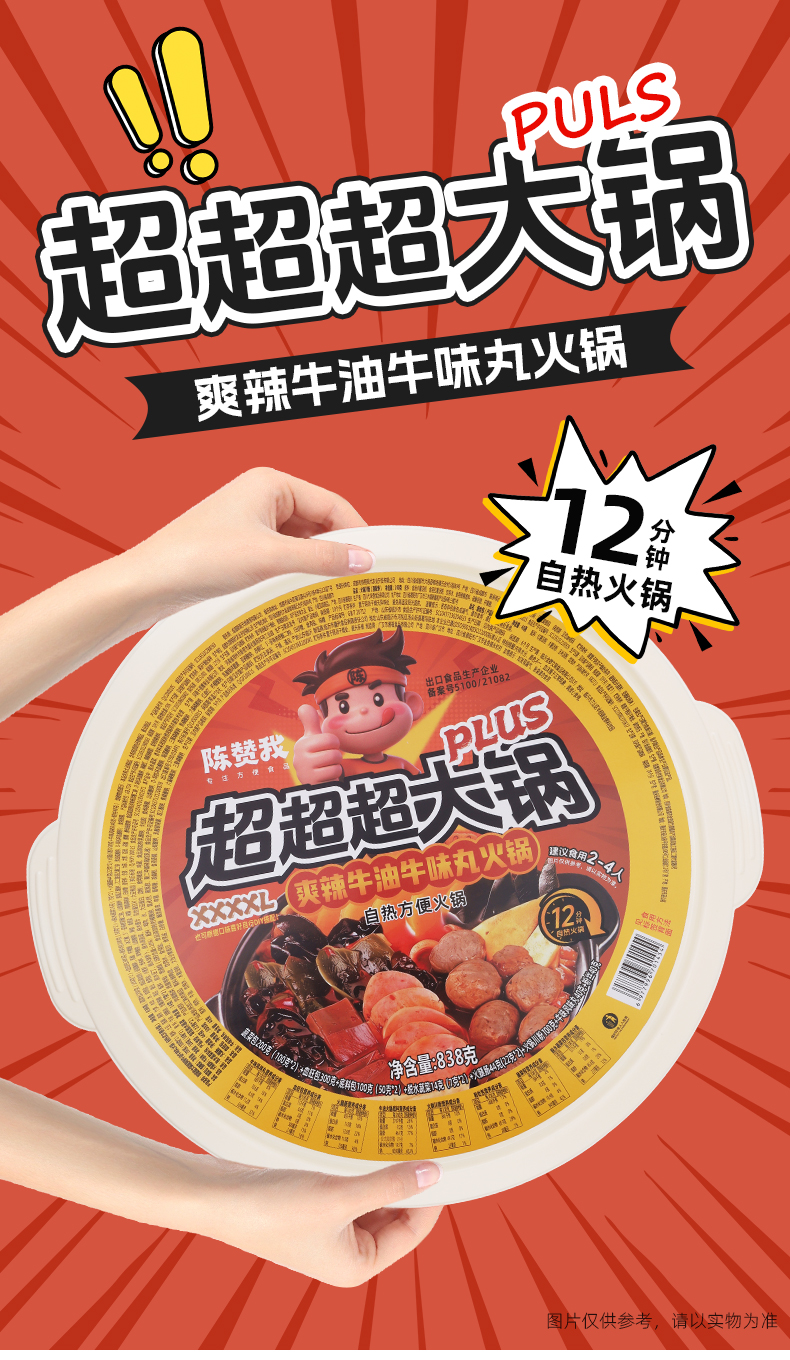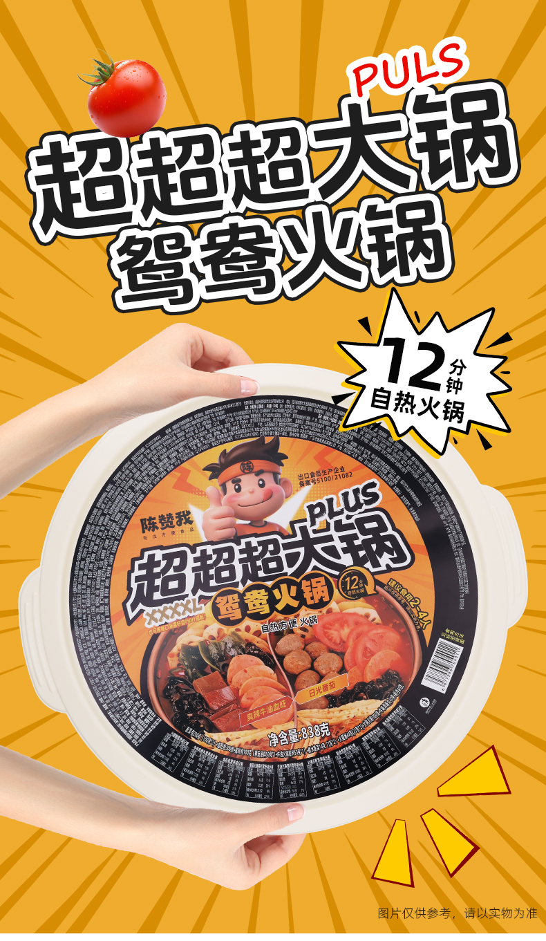 【品名】陈赞我 自热超大火锅 佳节聚会!超大自热锅 有菜有肉 食材超丰富 【规格】 规格1:陈赞我超大肉多多1068g 规格2:陈赞我超大鸳鸯锅1002g 规格3:陈赞我超大牛油牛味丸子838g 规格4:陈赞我大牛油番茄鸳鸯锅838g 【产地】国内 【发货包装】独立包装 【发货地】四川 【发货快递】中通、圆通随机发 【不发货区域】新疆、西藏、内蒙古、港澳台 【发货时效】48-72小时,周末节假日顺延 |