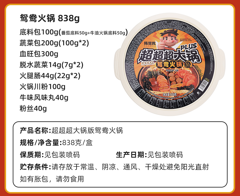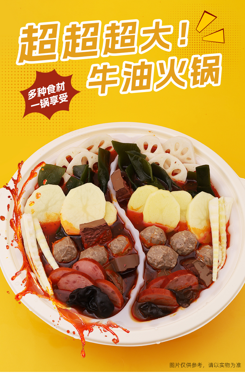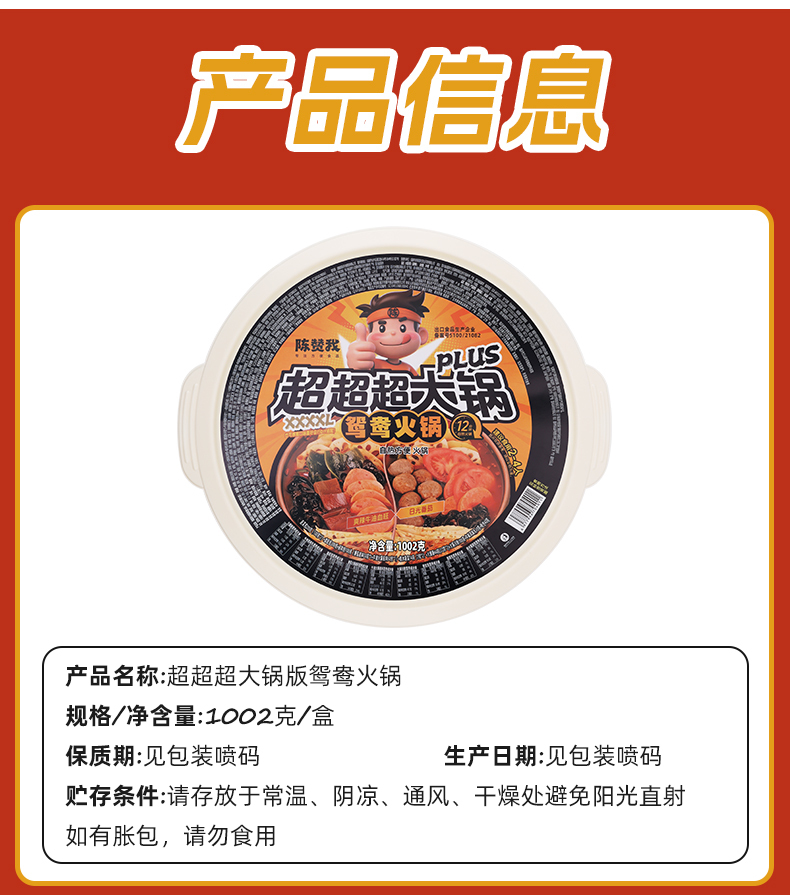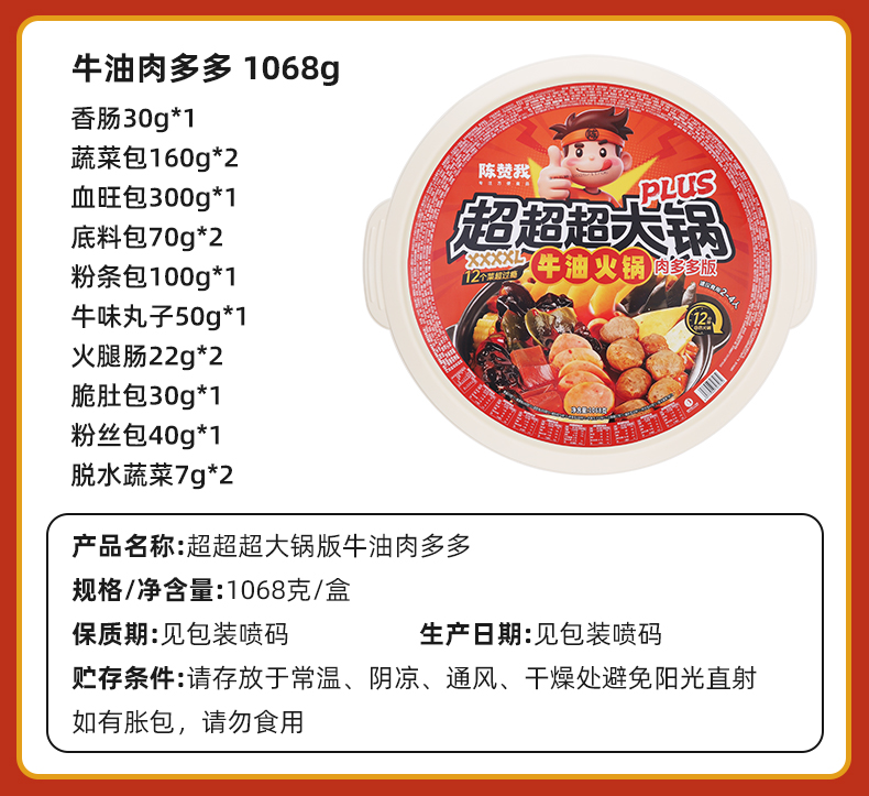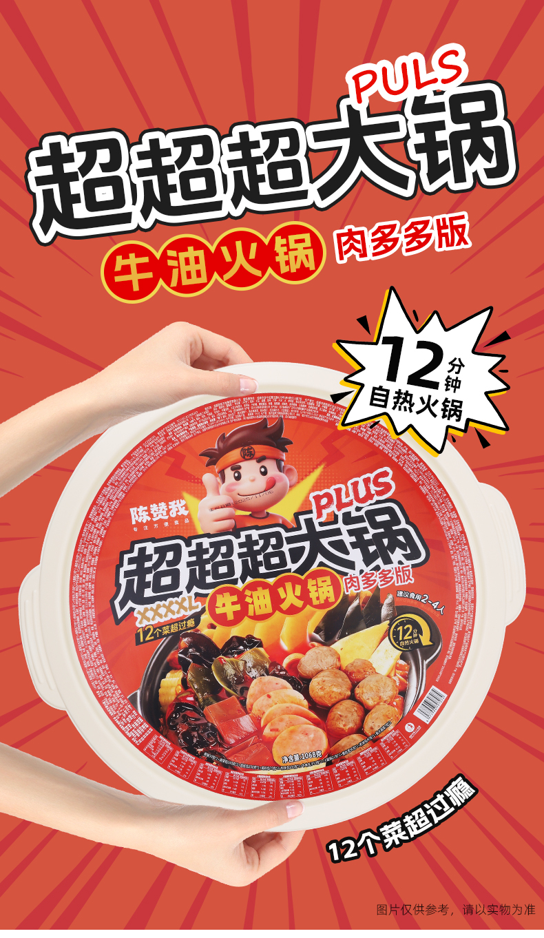 【品名】陈赞我 自热超大火锅 佳节聚会!超大自热锅 有菜有肉 食材超丰富 【规格】 规格1:陈赞我超大肉多多1068g 规格2:陈赞我超大鸳鸯锅1002g 规格3:陈赞我超大牛油牛味丸子838g 规格4:陈赞我大牛油番茄鸳鸯锅838g 【产地】国内 【发货包装】独立包装 【发货地】四川 【发货快递】中通、圆通随机发 【不发货区域】新疆、西藏、内蒙古、港澳台 【发货时效】48-72小时,周末节假日顺延 |
