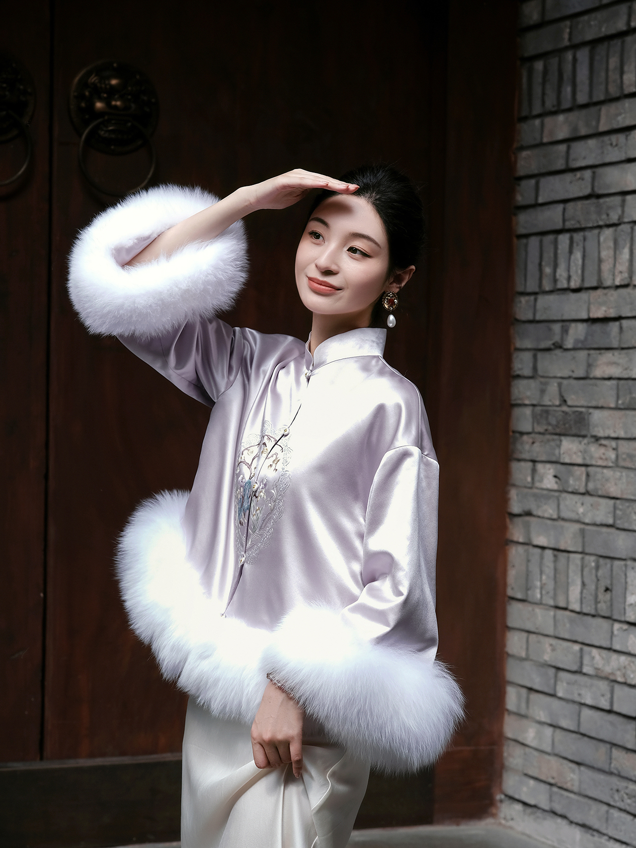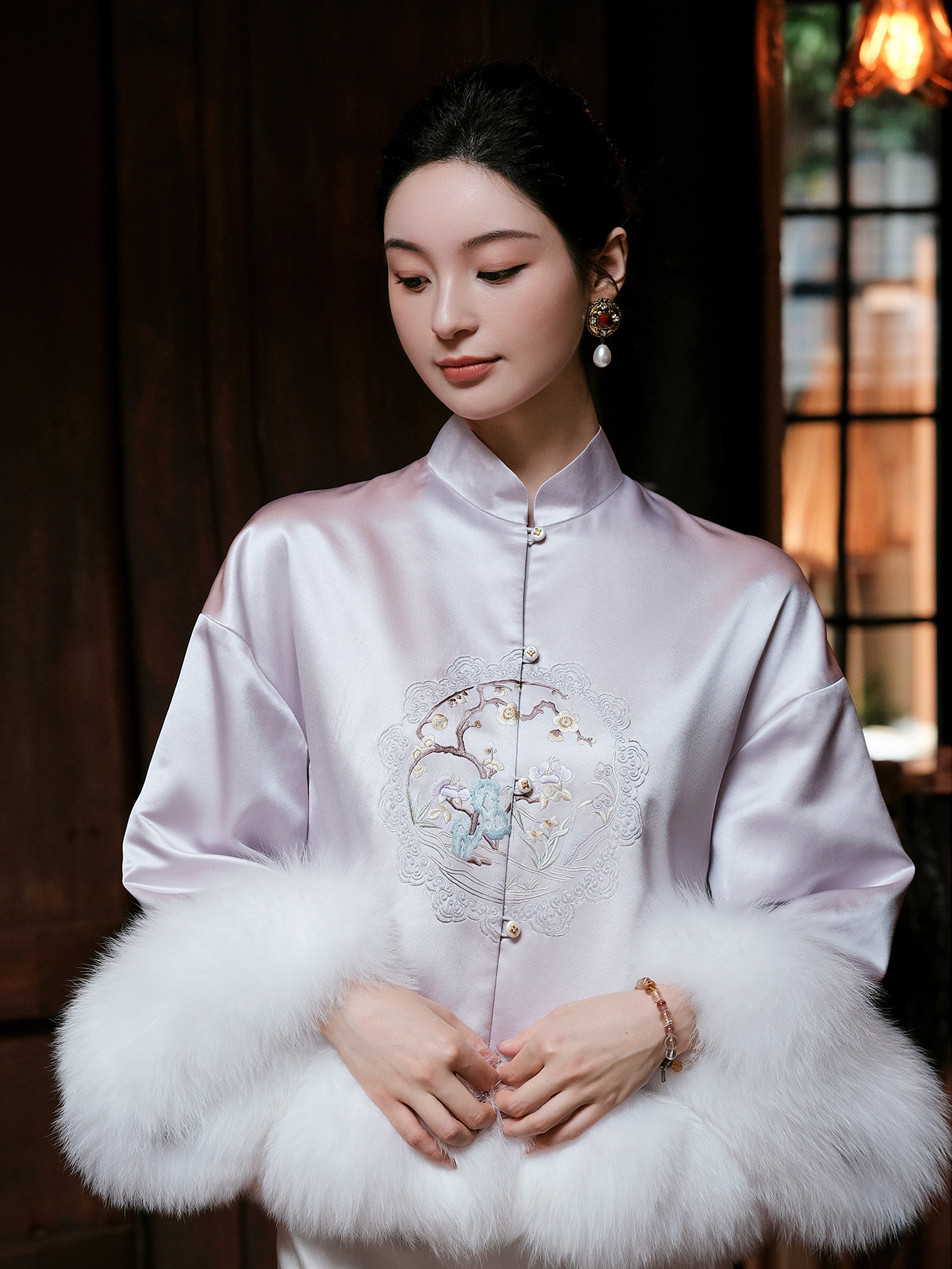 盛唐牡丹大师系列 | 紫琼真丝团纹手绣狐狸毛棉外套